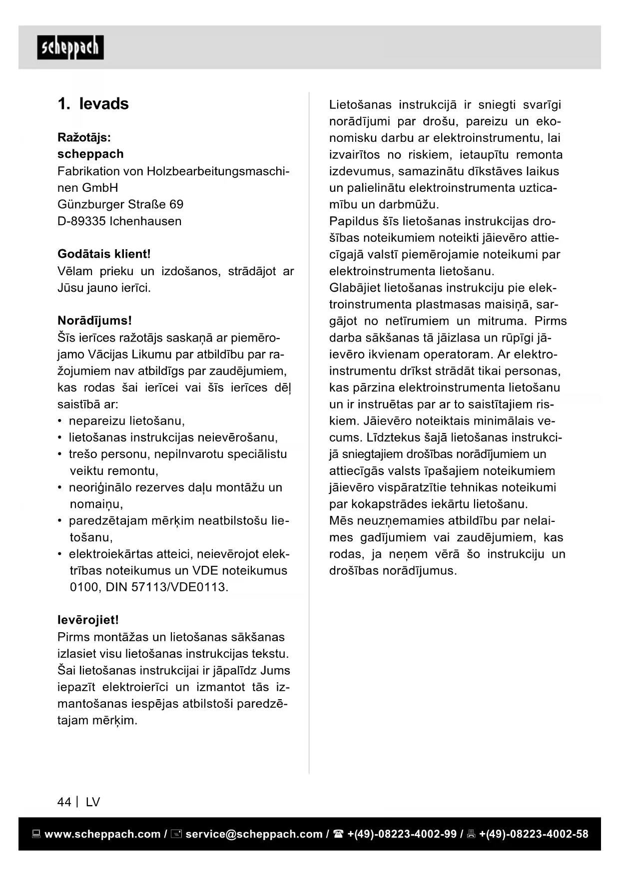 - elektroiekārtas atteici, neievērojot elek- trības noteikumus un VDE noteikumus 0100, DIN 57113/VDE0113. Ievērojiet! Pirms montāžas un lietošanas sākšanas izlasiet visu lietošanas instrukcijas tekstu. Šai lietošanas instrukcijai ir jāpalīdz Jums iepazīt elektroierīci un izmantot tās iz- mantošanas iespējas atbilstoši paredzē- tajam mērķim. www.scheppach.com / service@scheppach.com / +(49)-08223-4002-99 / +(49)-08223-4002-58