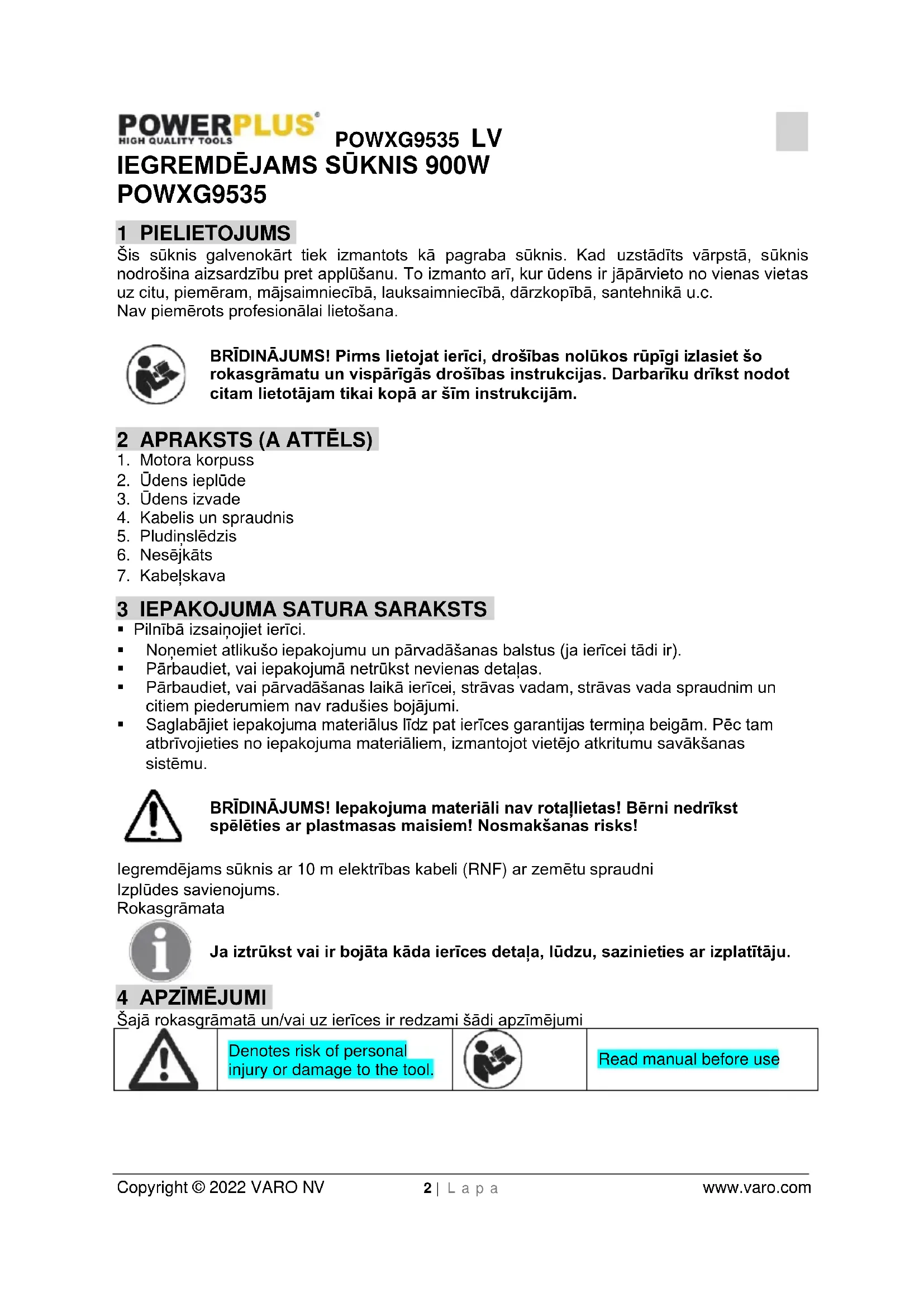 Read manual before usePOWXG9535 LV Copyright © 2022 VARO NV 3 | L a p a www.varo.com 5 VISPĀRĪGI DARBARĪKA DROŠĪBAS BRĪDINĀJUMI Izlasiet visus drošības brīdinājumus un instrukcijas. Brīdinājumu un instrukciju neievērošana var izraisīt elektrošoku, ugunsgrēku un/vai smagus savainojumus. Saglabājiet visus brīdinājums un instrukcijas turpmākām atsaucēm. Brīdinājumos termins „darbarīks” attiecas uz darbarīku, ko darbina no elektrotīkla (ar strāvas vadu) vai ar akumulatoru (bez strāvas vada). 6 PIRMS PALAIDES, SVARĪGI!