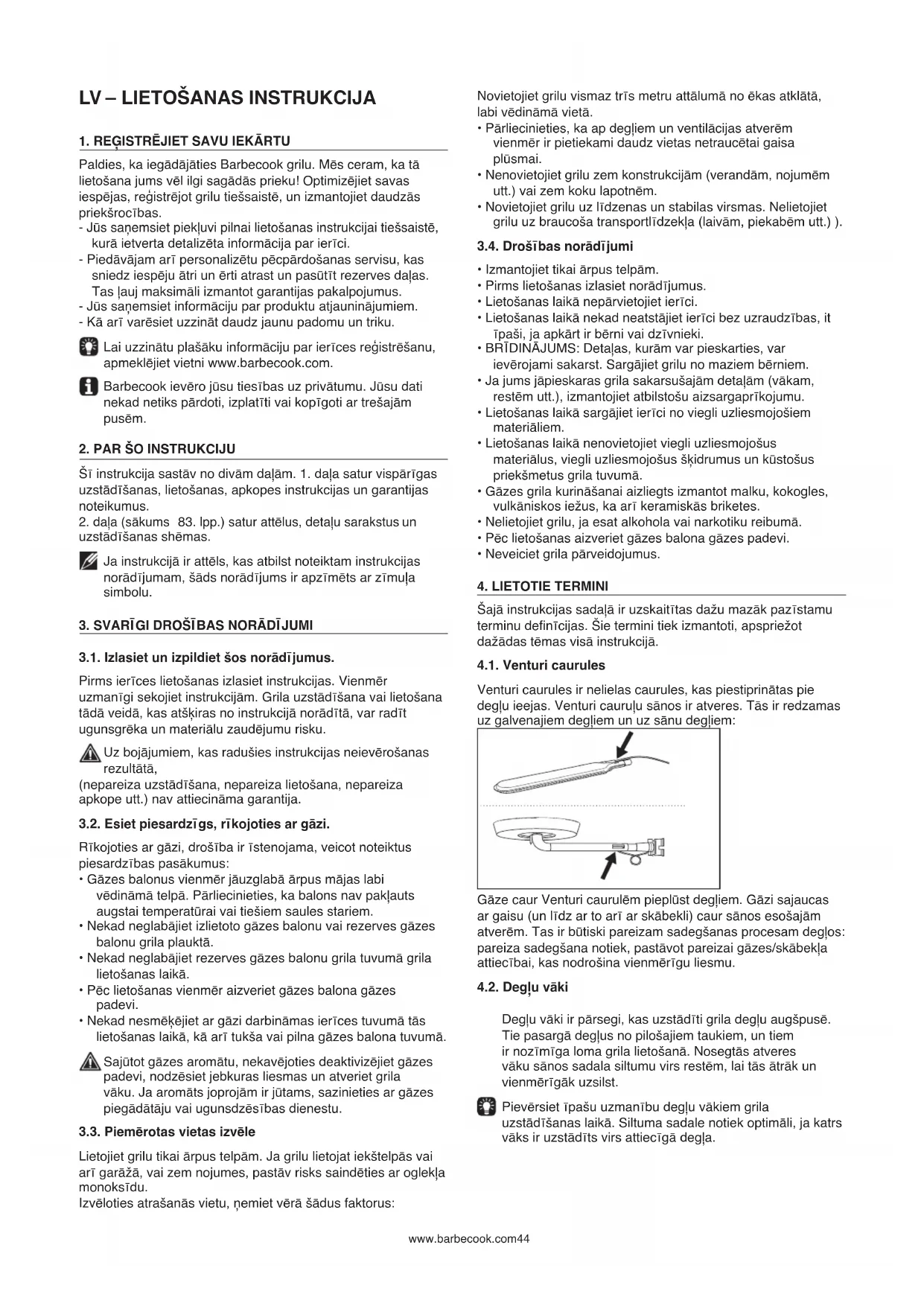 Šajā instrukcijas sadaļā ir uzskaitītas dažu mazāk pazīstamu terminu denīcijas. Šie termini tiek izmantoti, apspriežot dažādas tēmas visā instrukcijā. 4.1. Venturi caurules Venturi caurules ir nelielas caurules, kas piestiprinātas pie degļu ieejas. Venturi cauruļu sānos ir atveres. Tās ir redzamas uz galvenajiem degļiem un uz sānu degļiem: Gāze caur Venturi caurulēm pieplūst degļiem. Gāzi sajaucas ar gaisu (un līdz ar to arī ar skābekli) caur sānos esošajām atverēm. Tas ir būtiski pareizam sadegšanas procesam degļos: pareiza sadegšana notiek, pastāvot pareizai gāzes/skābekļa attiecībai, kas nodrošina vienmērīgu liesmu. 4.2. Degļu vāki Degļu vāki ir pārsegi, kas uzstādīti grila degļu augšpusē. Tie pasargā degļus no pilošajiem taukiem, un tiem ir nozīmīga loma grila lietošanā. Nosegtās atveres vāku sānos sadala siltumu virs restēm, lai tās ātrāk un vienmērīgāk uzsilst. Pievērsiet īpašu uzmanību degļu vākiem grila uzstādīšanas laikā. Siltuma sadale notiek optimāli, ja katrs vāks ir uzstādīts virs attiecīgā degļa. www.barbecook.com444.3. Emalja Dažas grila detaļas ir pārklātas ar kausētu stiklu, kas ir pazīstams arī kā emalja. Šī emalja pasargā metāla pamatmateriālu no korozijas. Emalja ir augstas kvalitātes materiāls: tā ir izturīga pret koroziju, augstas temperatūras ietekmē tā nesadalās un to ir ļoti viegli uzturēt. Tā kā emalja ir mazāk elastīga nekā metāls, uz kura tā tiek uzklāta, no grila var atdalīties emaljas gabali, ja tas tiek lietots neatbilstoši. Lai izvairītos no šīs problēmas, uzstādot emaljētās detaļas, jāievēro piesardzība, un emaljētās detaļas vienmēr jākopj saskaņā ar šajā instrukcijā sniegtajiem norādījumiem. 4.4. Uzliesmojumi Tvertnē grilēšanas laikā var rasties pēkšņi uzliesmojumi. Parasti tos izraisa tauku vai marinādes pilēšana grila tvertnē.