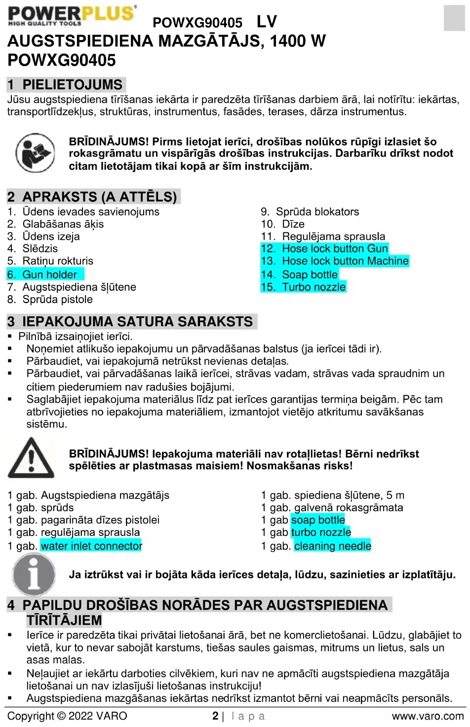 - Augstspiediena mazgāšanas iekārtas nedrīkst izmantot bērni vai neapmācīts personāls.POWXG90405 LV Copyright © 2022 VARO 3 | l a p a www.varo.com