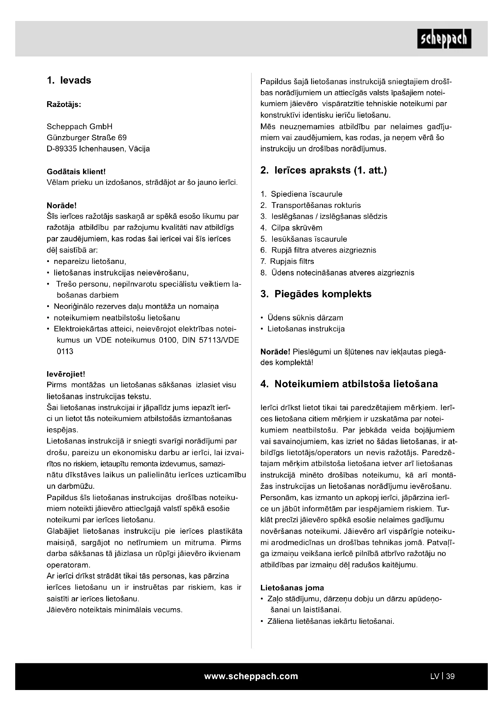 Ievērojiet! Pirms montāžas un lietošanas sākšanas izlasiet visu lietošanas instrukcijas tekstu. Šai lietošanas instrukcijai ir jāpalīdz jums iepazīt ierī- ci un lietot tās noteikumiem atbilstošās izmantošanas iespējas. Lietošanas instrukcijā ir sniegti svarīgi norādījumi par drošu, pareizu un ekonomisku darbu ar ierīci, lai izvai- rītos no riskiem, ietaupītu remonta izdevumus, samazi- nātu dīkstāves laikus un palielinātu ierīces uzticamību un darbmūžu. Papildus šīs lietošanas instrukcijas drošības noteiku- miem noteikti jāievēro attiecīgajā valstī spēkā esošie noteikumi par ierīces lietošanu. Glabājiet lietošanas instrukciju pie ierīces plastikāta maisiņā, sargājot no netīrumiem un mitruma. Pirms darba sākšanas tā jāizlasa un rūpīgi jāievēro ikvienam operatoram. Ar ierīci drīkst strādāt tikai tās personas, kas pārzina ierīces lietošanu un ir instruētas par riskiem, kas ir saistīti ar ierīces lietošanu. Jāievēro noteiktais minimālais vecums.www.scheppach.com