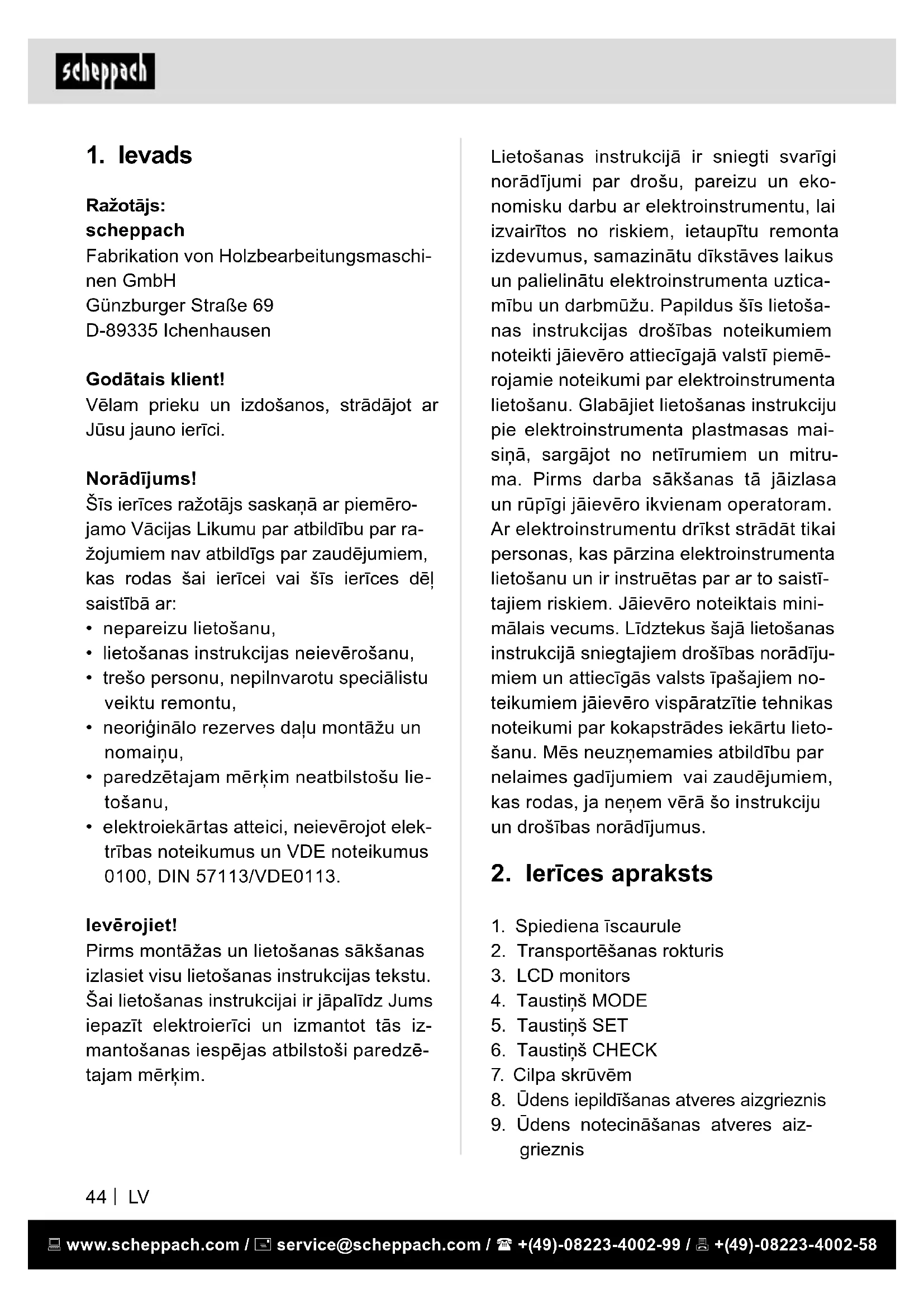 - elektroiekārtas atteici, neievērojot elek- trības noteikumus un VDE noteikumus 0100, DIN 57113/VDE0113. Ievērojiet! Pirms montāžas un lietošanas sākšanas izlasiet visu lietošanas instrukcijas tekstu. Šai lietošanas instrukcijai ir jāpalīdz Jums iepazīt elektroierīci un izmantot tās iz- mantošanas iespējas atbilstoši paredzē- tajam mērķim. www.scheppach.com / service@scheppach.com / +(49)-08223-4002-99 / +(49)-08223-4002-58
