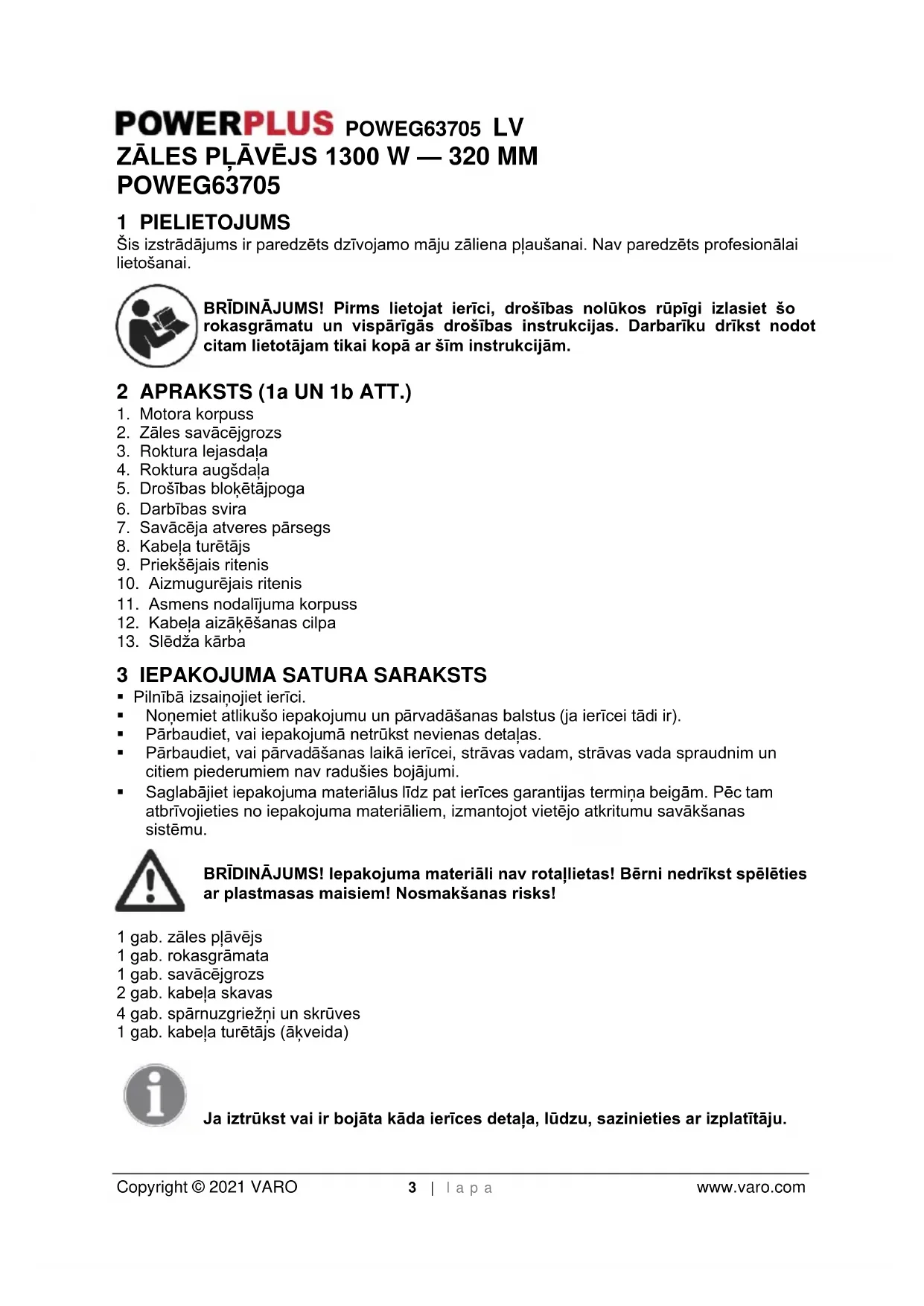 Copyright © 2021 VARO 3 | l a p a www.varo.com ZĀLES PĻĀVĒJS 1300 W — 320 MM POWEG63705 1 PIELIETOJUMS Šis izstrādājums ir paredzēts dzīvojamo māju zāliena pļaušanai. Nav paredzēts profesionālai lietošanai. BRĪDINĀJUMS! Pirms lietojat ierīci, drošības nolūkos rūpīgi izlasiet šo rokasgrāmatu un vispārīgās drošības instrukcijas. Darbarīku drīkst nodot citam lietotājam tikai kopā ar šīm instrukcijām. 2 APRAKSTS (1a UN 1b ATT.)