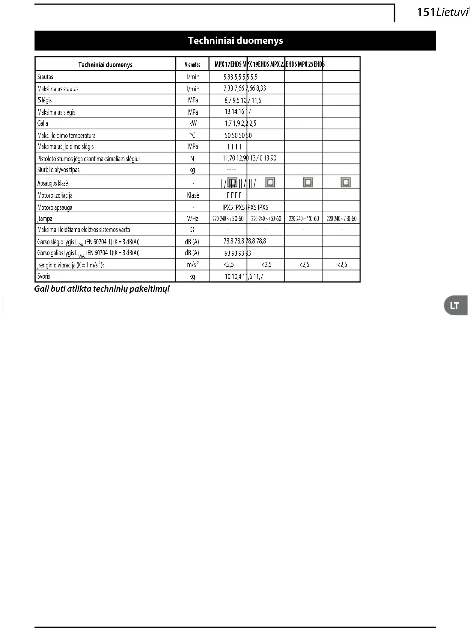 Nominālā jauda 1,7 kW 2 kW 2,2 kW 2,5 kW atbilst šādām Eiropas direktīvām: 2006/42/EK, 2014/35/ES, 2011/65/ES, 2012/19/ES, 2014/30/ES un 2000/14/EK un ir izgatavota(s) saskaņā ar šādiem standartiem vai standartizētiem dokumentiem: EN 60335-1; EN 60335-2-79; EN 55014-1; EN 55014-2; EN 61000-3-2; EN 61000-3-3; EN 61000-3-11; EN 60704-1; EN 62233; EN 50581 Personas, kam ir tiesības izsniegt tehnisko dokumentāciju, uzvārds un adrese: Stefano Reverberi / AR izpilddirektors Via ML King, 3 - 41122 Modena, Itālija Direktīvas 2000/14/EK pieprasītā atbilstības novērtējuma procedūra ir veikta saskaņā ar Pielikumu V Modeļa Nr. MPX 17EHDS