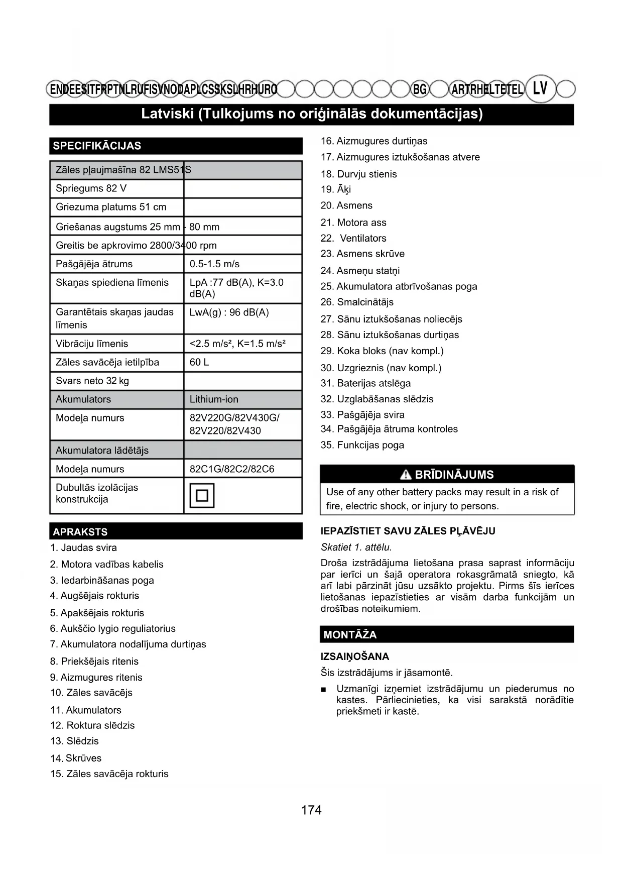SPECIFIKĀCIJASZāles pļaujmašīna 82 LMS51SSpriegums 82 VGriezuma platums 51 cmGriešanas augstums 25 mm - 80 mmGreitis be apkrovimo 2800/3400 rpmPašgājēja ātrums 0.5-1.5 m/s Skaņas spiediena līmenis LpA :77 dB(A), K=3.0 dB(A)Garantētais skaņas jaudas līmenisLwA(g) : 96 dB(A)Vibrāciju līmenis <2.5 m/s², K=1.5 m/s²Zāles savācēja ietilpība 60 LSvars neto 32 kgAkumulators Lithium-ionModeļa numurs 82V220G/82V430G/82V220/82V430Akumulatora lādētājsModeļa numurs 82C1G/82C2/82C6Dubultās izolācijaskonstrukcijaAPRAKSTS1. Jaudas svira2. Motora vadības kabelis3. Iedarbināšanas poga4. Augšējais rokturis5. Apakšējais rokturis6. Aukščio lygio reguliatorius7. Akumulatora nodalījuma durtiņas8. Priekšējais ritenis9. Aizmugures ritenis10. Zāles savācējs11. Akumulators12. Roktura slēdzis13. Slēdzis Skrūves15. Zāles savācēja rokturis16. Aizmugures durtiņas17. Aizmugures iztukšošanas atvere18. Durvju stienis19. Āķi20. Asmens21. Motora ass22. Ventilators23. Asmens skrūve24. Asmeņu statņi25. Akumulatora atbrīvošanas poga26. Smalcinātājs27. Sānu iztukšošanas noliecējs28. Sānu iztukšošanas durtiņas29. Koka bloks (nav kompl.)30. Uzgrieznis (nav kompl.)31. Baterijas atslēga32. Uzglabāšanas slēdzis33. Pašgājēja svira 34. Pašgājēja ātruma kontroles35. Funkcijas poga