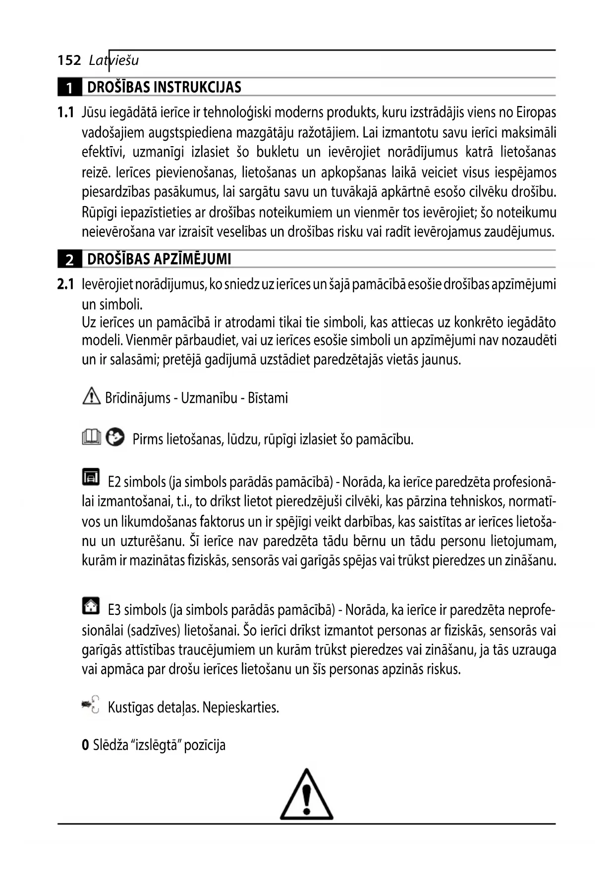un simboli. Uz ierīces un pamācībā ir atrodami tikai tie simboli, kas attiecas uz konkrēto iegādāto modeli. Vienmēr pārbaudiet, vai uz ierīces esošie simboli un apzīmējumi nav nozaudēti un ir salasāmi; pretējā gadījumā uzstādiet paredzētajās vietās jaunus. Brīdinājums - Uzmanību - Bīstami Pirms lietošanas, lūdzu, rūpīgi izlasiet šo pamācību. E2 simbols (ja simbols parādās pamācībā) - Norāda, ka ierīce paredzēta profesionā- lai izmantošanai, t.i., to drīkst lietot pieredzējuši cilvēki, kas pārzina tehniskos, normatī- vos un likumdošanas faktorus un ir spējīgi veikt darbības, kas saistītas ar ierīces lietoša- nu un uzturēšanu. Šī ierīce nav paredzēta tādu bērnu un tādu personu lietojumam, kurām ir mazinātas fiziskās, sensorās vai garīgās spējas vai trūkst pieredzes un zināšanu. E3 simbols (ja simbols parādās pamācībā) - Norāda, ka ierīce ir paredzēta neprofe- sionālai (sadzīves) lietošanai. Šo ierīci drīkst izmantot personas ar fiziskās, sensorās vai garīgās attīstības traucējumiem un kurām trūkst pieredzes vai zināšanu, ja tās uzrauga vai apmāca par drošu ierīces lietošanu un šīs personas apzinās riskus. Kustīgas detaļas. Nepieskarties. 0 Slēdža “izslēgtā” pozīcija153Latviešu I - II Slēdža “ieslēgtā” pozīcija Garantētais skaņas intensitātes līmenis Aizlieguma zīme informē lietotājus, ka vietējie noteikumi var aizliegt pievienot ierīci dzeramā ūdens apgādes sistēmai. Bīstamības zīme, kas lietotājam atgādina, ka ūdens strūklu nedrīkst vērst pret cilvēkiem, dzīvniekiem, elektroierīcēm vai pašu produktu. Šis produkts atbilst izolācijas klasei II. Tas nozīmē, ka tam ir pastiprināta vai dubulta izolācija (tikai tad, ja simbols parādās uz ierīces). Šis produkts atbilst izolācijas klasei I. Tas nozīmē, ka tas ir aprīkots ar aizsardzības zemējuma vadu (tikai tad, ja simbols parādās uz ierīces). Produkts atbilst attiecīgajām Eiropas direktīvām. E1 simbols - Norāda, ka ierīci nedrīkst izmest kopā ar sadzīves atkritumiem; to var nodot pārdevējam, iegādājoties jaunu ierīci. Ierīces elektriskās un elektroniskās detaļas nedrīkst izmantot atkārtoti neparedzētā veidā, jo tās satur vielas, kas rada veselības apdraudējumu. Izmantojiet dzirdes aizsardzības līdzekļus. Izmantojiet aizsargmasku. Izmantojiet elpceļu aizsardzības līdzekļus. Jāvalkā aizsargcimdi. Jāvalkā aizsargapavi. Jāvalkā aizsargapģērbs.154 Latviešu