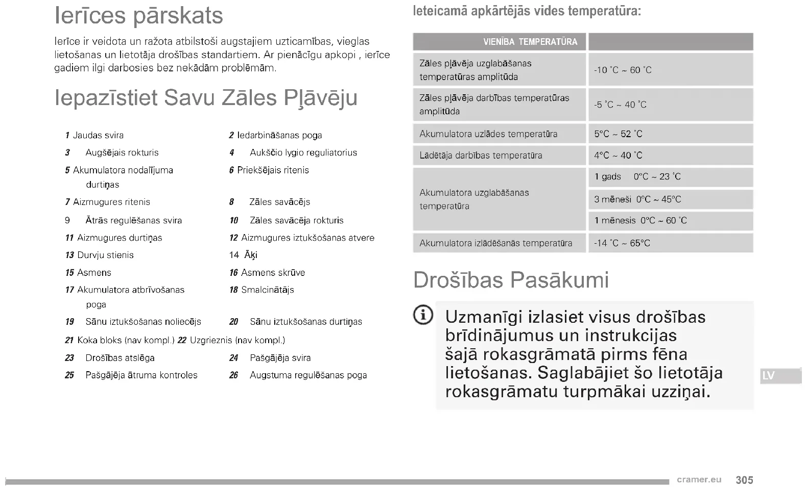 cramer.eu Gaidiet, kamēr visas ierīces detaļas būs pilnīgi apstājušās, pirms pieskarties tām. IPX4 Izturīgs visos laikapstākļos Pirms ierīces izmantošanas Drošai šīs ierīces izmantošanai ir nepieciešama izpratne par ierīces funkcijām un lietotāja rokasgrāmatu. Pirms ierīces izmantošanas iepazīstieties ar visām darbības funkcijām un drošības noteikumiem.