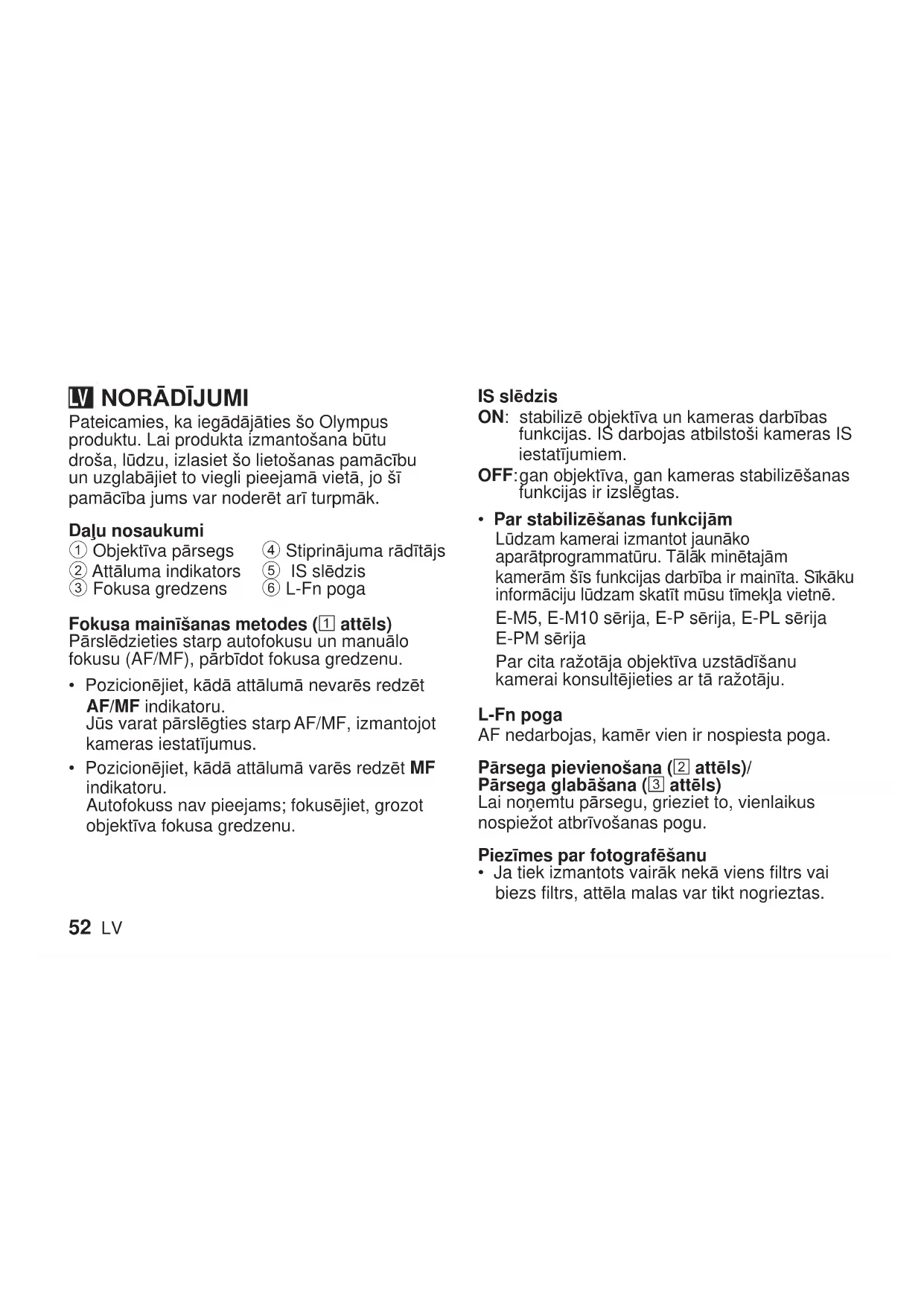 Pateicamies, ka iegādājāties šo Olympus produktu. Lai produkta izmantošana būtu droša, lūdzu, izlasiet šo lietošanas pamācību un uzglabājiet to viegli pieejamā vietā, jo šī pamācība jums var noderēt arī turpmāk. Daļu nosaukumi 1 Objektīva pārsegs 2 Attāluma indikators 3 Fokusa gredzens 4 Stiprinājuma rādītājs 5 IS slēdzis 6 L-Fn poga Fokusa mainīšanas metodes (1 attēls) Pārslēdzieties starp autofokusu un manuālo fokusu (AF/MF), pārbīdot fokusa gredzenu.