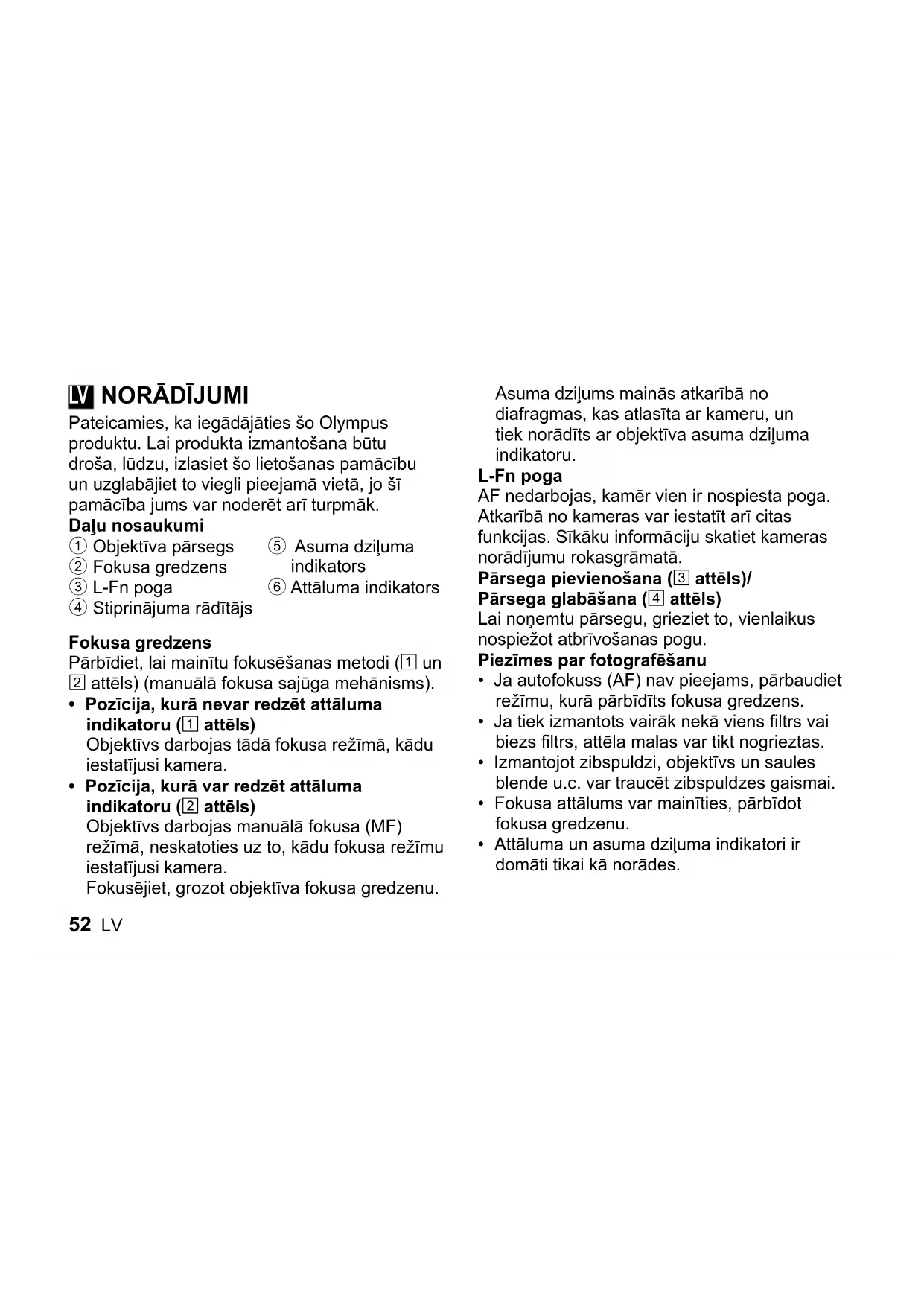 Pateicamies, ka iegādājāties šo Olympus produktu. Lai produkta izmantošana būtu droša, lūdzu, izlasiet šo lietošanas pamācību un uzglabājiet to viegli pieejamā vietā, jo šī pamācība jums var noderēt arī turpmāk. Daļu nosaukumi 1 Objektīva pārsegs 2 Fokusa gredzens 3 L-Fn poga 4 Stiprinājuma rādītājs 5 Asuma dziļuma indikators 6 Attāluma indikators Fokusa gredzens Pārbīdiet, lai mainītu fokusēšanas metodi (1 un 2 attēls) (manuālā fokusa sajūga mehānisms).