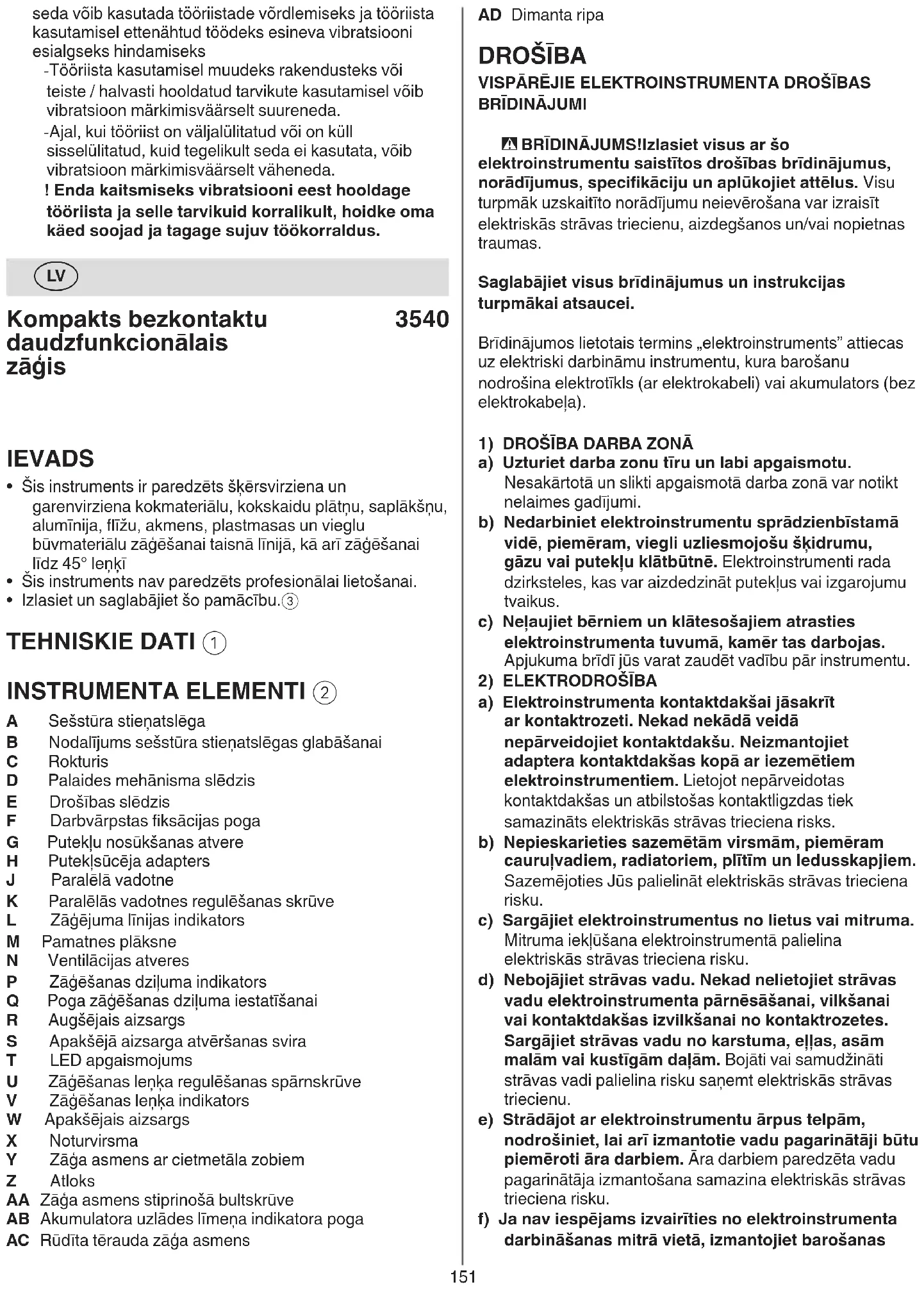 P Zāģēšanas dziļuma indikators Q Poga zāģēšanas dziļuma iestatīšanai R Augšējais aizsargs S Apakšējā aizsarga atvēršanas svira T LED apgaismojums U Zāģēšanas leņķa regulēšanas spārnskrūve V Zāģēšanas leņķa indikators W Apakšējais aizsargs X Noturvirsma Y Zāģa asmens ar cietmetāla zobiem Z Atloks AA Zāģa asmens stiprinošā bultskrūve AB Akumulatora uzlādes līmeņa indikatora poga AC Rūdīta tērauda zāģa asmens152 uzglabājiettosbērniemnepieejamāvietāun neļaujietarelektroinstrumentudarbotiespersonām, kasinstrumentunepārzinavainavizlasījušas šīsinstrukcijas.Nemākulīgās rokās nonākuši elektroinstrumenti ir potenciāls briesmu avots. e) Veiciet elektroinstrumentam un piederumiem apkopi.Pārbaudiet,vaiirpareiziuzstādītaskustīgās daļasunvaitāsneķeras,unvaielektroinstrumenta daļāmnavbojājumu,kasvarnegatīviietekmēttā darbību.Bojātselektroinstrumentsirjāsalabopirms nākamāslietošanasreizes. Daudzu negadījumu cēlonis ir sliktā stāvoklī esošu elektroinstrumentu izmantošana. f) Griezējinstrumentiemjābūtasiemuntīriem. Rūpīgi kopti griezējinstrumenti retāk iestrēgst un ir vieglāk vadāmi. g) Lietojietelektroinstrumentu,tāpiederumusun maināmosinstrumentus,kāarīcitussaistītos elementusatbilstošišiemnorādījumiem,ņemot vērādarbaapstākļusunveicamouzdevumu. Elektroinstrumenta lietošana neparedzētiem mērķiem var radīt bīstamu situāciju. h) Rokturiemunsatveršanasdaļāmjābūtsausiem, tīriemunuztiemnedrīkstbūteļļavaismērviela. Ja rokturi un satveršanas daļas ir mitras, tās slīdēs, un ar instrumentu vairs nebūs droši strādāt, kā arī apvaldīt neparedzētu apstākļu gadījumos.