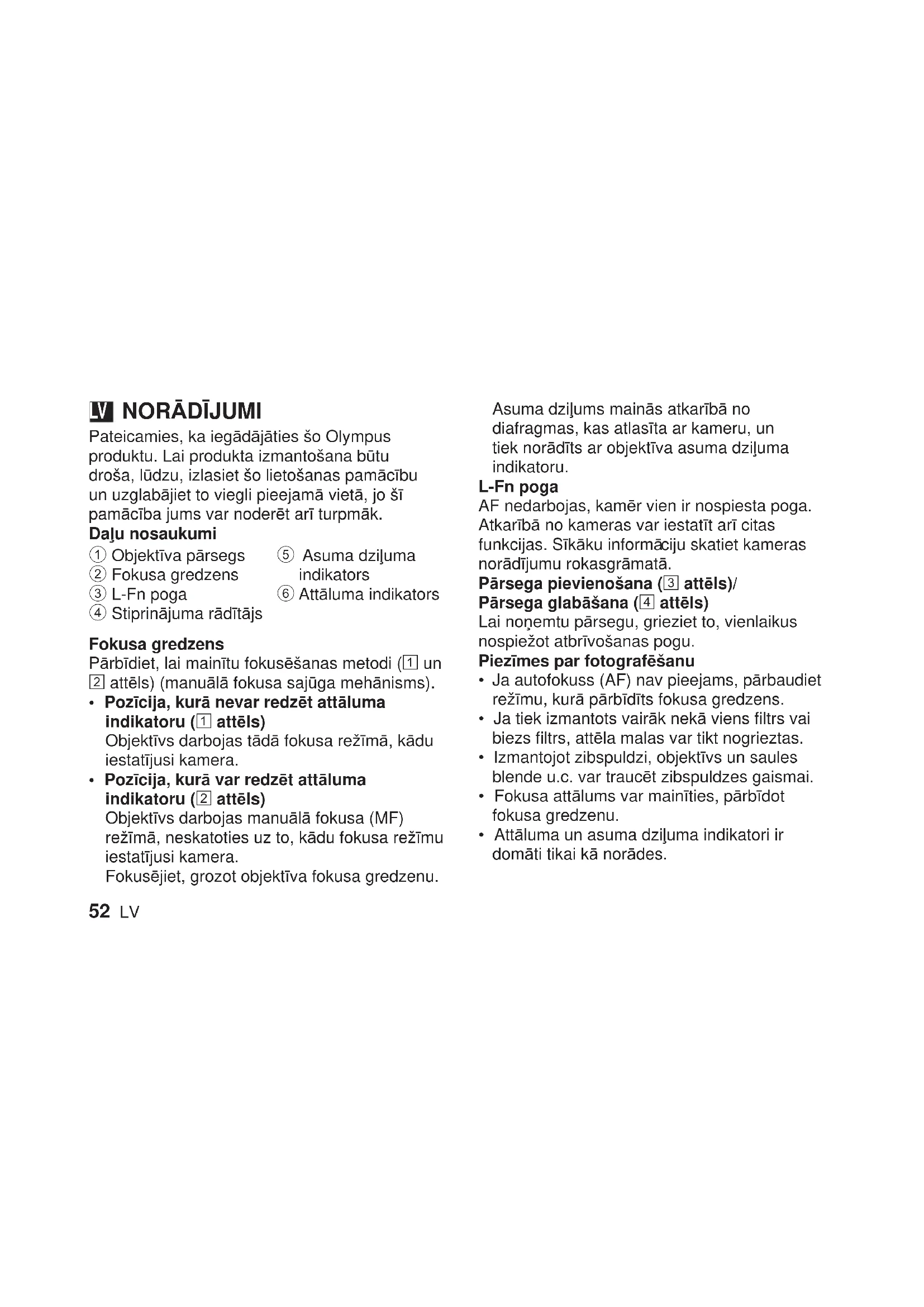 Pateicamies, ka iegādājāties šo Olympus produktu. Lai produkta izmantošana būtu droša, lūdzu, izlasiet šo lietošanas pamācību un uzglabājiet to viegli pieejamā vietā, jo šī pamācība jums var noderēt arī turpmāk. Daļu nosaukumi 1 Objektīva pārsegs 2 Fokusa gredzens 3 L-Fn poga 4 Stiprinājuma rādītājs 5 Asuma dziļuma indikators 6 Attāluma indikators Fokusa gredzens Pārbīdiet, lai mainītu fokusēšanas metodi (1 un 2 attēls) (manuālā fokusa sajūga mehānisms).