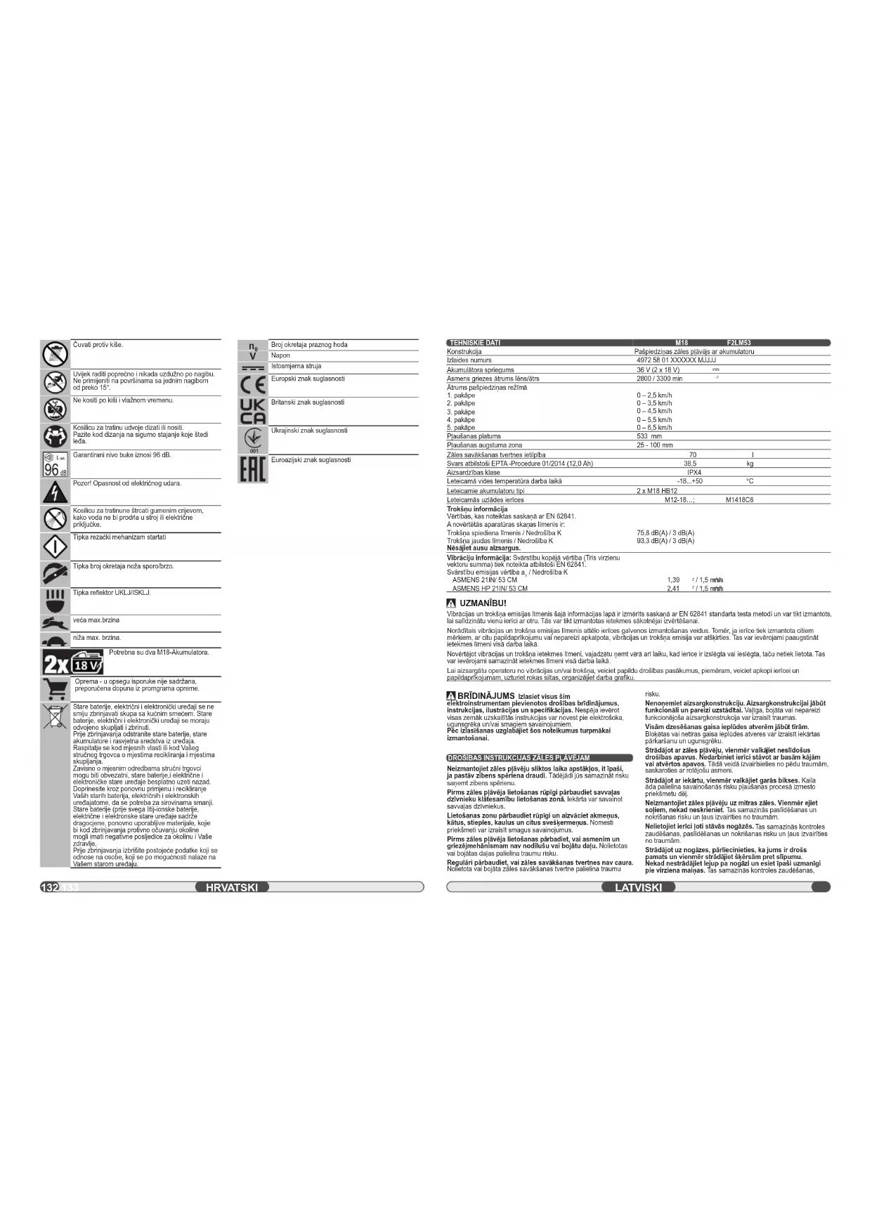 Spriegums Līdzstrāva Eiropas atbilstības zīme Apvienotās Karalistes atbilstības zīme Ukrainas atbilstības zīme Eirāzijas atbilstības zīme LATVISKI138 139 M18 F2LM53 4972 58 01 XXXXXX MJJJJ 36 V (2 x 18 V) 2800 / 3300 min