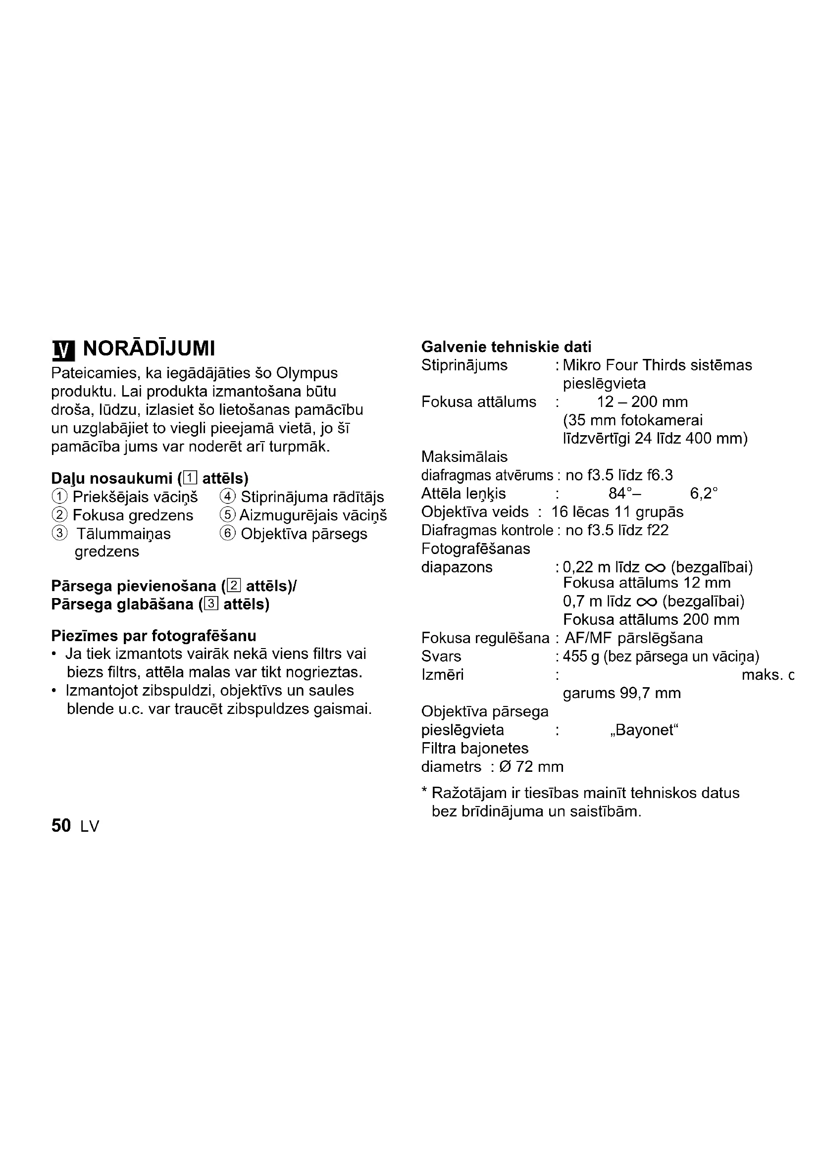 - Izmantojot zibspuldzi, objektīvs un saules blende u.c. var traucēt zibspuldzes gaismai. Galvenie tehniskie dati Stiprinājums : Mikro Four Thirds sistēmas pieslēgvieta Fokusa attālums : 12 – 200 mm (35 mm fotokamerai līdzvērtīgi 24 līdz 400 mm) Maksimālais diafragmas atvērums : no f3.5 līdz f6.3 Attēla leņķis : 84°– 6,2° Objektīva veids : 16 lēcas 11 grupās Diafragmas kontrole : no f3.5 līdz f22 Fotografēšanas diapazons : 0,22 m līdz ) (bezgalībai) Fokusa attālums 12 mm 0,7 m līdz ) (bezgalībai) Fokusa attālums 200 mm Fokusa regulēšana : AF/MF pārslēgšana Svars : 455 g (bez pārsega un vāciņa) Izmēri : maks. diam. Ø 77,5 × garums 99,7 mm Objektīva pārsega pieslēgvieta : „Bayonet“ Filtra bajonetes diametrs : Ø 72 mm