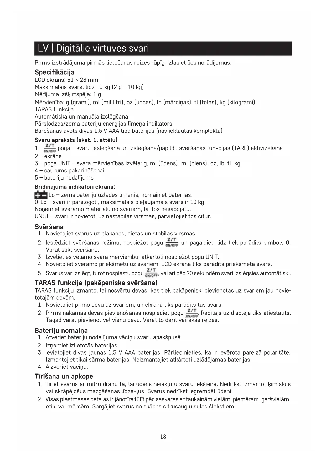 , vai arī pēc 90 sekundēm svari izslēgsies automātiski. TARAS funkcija (pakāpeniska svēršana) TARAS funkciju izmanto, lai nosvērtu devas, kas tiek pakāpeniski pievienotas uz svariem jau novie- totajām devām.