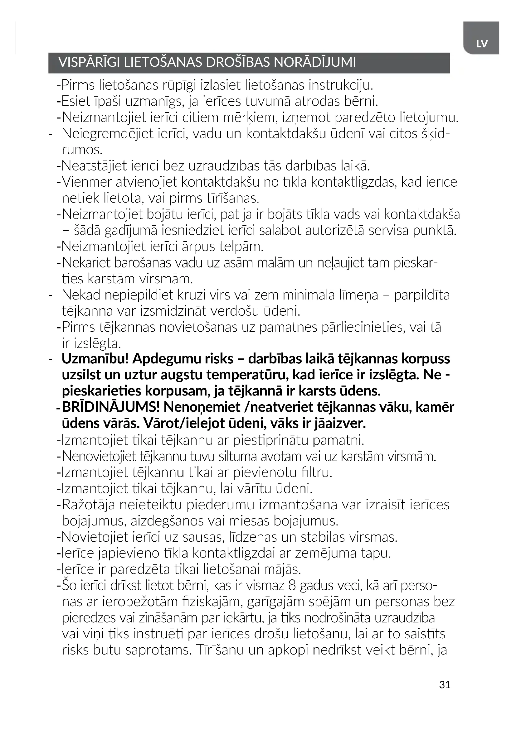 UZMANĪBU Elektrotraumas risks - lieto jot ierīci, jāuzmanās, lai netraumētu ierīces elektriskās detaļas. Īpaša uzmanība jāpievērš krūzes savienotājam un tā pamatnei. Ja elek triskie komponen ir applaucē, pirms ierīces atkārtotas lietošanas tos rūpīgi noriet un nosusiniet. - Nelietojiet tējkannu bez ūdens. - Iekārta nav paredzēta darbībai, izmantojot ārējos slēdžu taimerus vai atsevišķu tālvadības sistēmu.