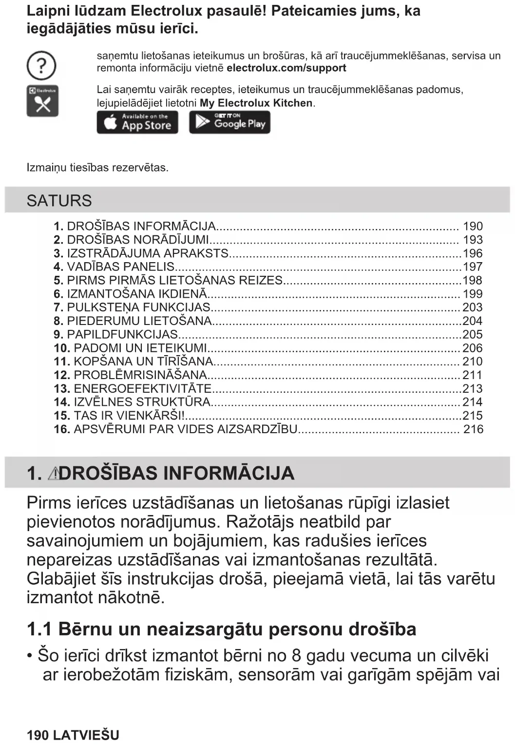 Nospiediet . Nospiediet . Nospiediet Ga‐ tavošanas palīgs. Atlasiet ēdienu. Izmantojiet ātrās funkcijas, lai iestatītu ēdiena gatavošanas laiku Funkcija “10 % Finish Assist” Izmantojiet funkciju “10 % Finish Assist”, lai pagarinātu laiku, kad atlikuši 10 % ēdiena gatavošanas laika. Lai pagarinātu ēdiena gatavošanas laiku, nospiediet +1 min. LATVIEŠU 21516. APSVĒRUMI PAR VIDES AIZSARDZĪBU Nododiet otrreizējai pārstrādei materiālus ar simbolu . Ievietojiet iepakojuma materiālus atbilstošajos konteineros to otrreizējai pārstrādei. Palīdziet aizsargāt apkārtējo vidi un cilvēku veselību, atkārtoti pārstrādājot elektrisko un elektronisko iekārtu atkritumus. Neizmetiet ierīces, kas apzīmētas ar šo simbolu , kopā ar mājsaimniecības atkritumiem. Nododiet izstrādājumu vietējā otrreizējās pārstrādes punktā vai sazinieties ar vietējo pašvaldību. 216 LATVIEŠUSveiki atvykę į „Electrolux“ pasaulį! Dėkojame, kad išsirinkote mūsų prietaisą. Gaukite naudojimo patarimų, brošiūrų, trikčių šalinimo, aptarnavimo ir remontoinformacijos adresu electrolux.com/supportDaugiau receptų, patarimų, nurodymų dėl trikčių ir kitos informacijos rasite MyElectrolux Kitchen programėlėje.Galimi pakeitimai. TURINYS