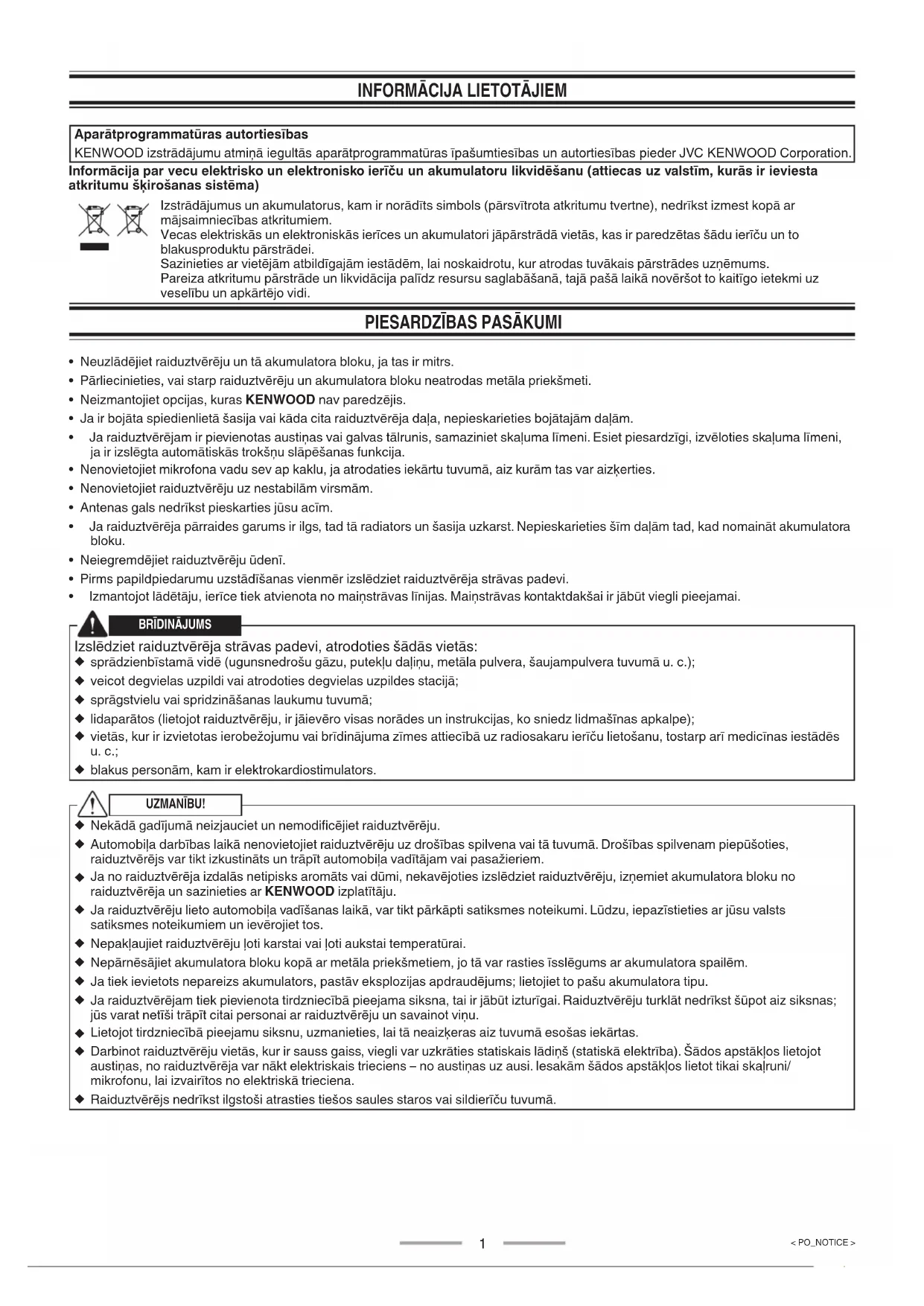 Aparātprogrammatūras autortiesības KENWOOD izstrādājumu atmiņā iegultās aparātprogrammatūras īpašumtiesības un autortiesības pieder JVC KENWOOD Corporation. Informācija par vecu elektrisko un elektronisko ierīču un akumulatoru likvidēšanu (attiecas uz valstīm, kurās ir ieviesta atkritumu šķirošanas sistēma) Izstrādājumus un akumulatorus, kam ir norādīts simbols (pārsvītrota atkritumu tvertne), nedrīkst izmest kopā ar mājsaimniecības atkritumiem. Vecas elektriskās un elektroniskās ierīces un akumulatori jāpārstrādā vietās, kas ir paredzētas šādu ierīču un to blakusproduktu pārstrādei. Sazinieties ar vietējām atbildīgajām iestādēm, lai noskaidrotu, kur atrodas tuvākais pārstrādes uzņēmums. Pareiza atkritumu pārstrāde un likvidācija palīdz resursu saglabāšanā, tajā pašā laikā novēršot to kaitīgo ietekmi uz veselību un apkārtējo vidi.
