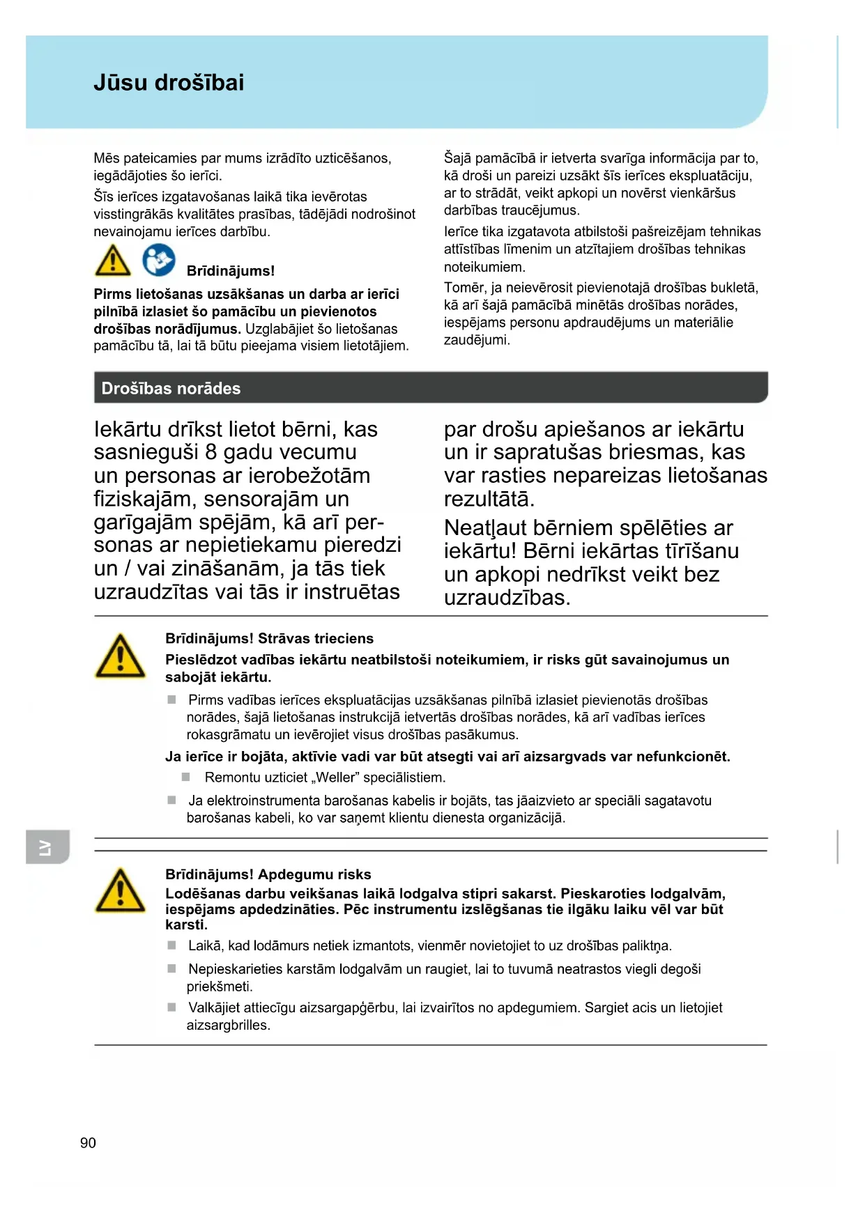 Jūsu drošībai Mēspateicamiesparmumsizrādītouzticēšanos, iegādājotiesšoierīci. Šīsierīcesizgatavošanaslaikātikaievērotas visstingrākāskvalitātesprasības,tādējādinodrošinot nevainojamuierīcesdarbību. Brīdinjums! Pirms lietošanas uzskšanas un darba ar ierīci pilnīb izlasiet šo pamcību un pievienotos drošības nordījumus. Uzglabājietšolietošanas pamācībutā,laitābūtupieejamavisiemlietotājiem. Šajāpamācībāirietvertasvarīgainformācijaparto, kādrošiunpareiziuzsāktšīsierīcesekspluatāciju, artostrādāt,veiktapkopiunnovērstvienkāršus darbībastraucējumus. Ierīcetikaizgatavotaatbilstošipašreizējamtehnikas attīstībaslīmenimunatzītajiemdrošībastehnikas noteikumiem. Tomēr,janeievērositpievienotajādrošībasbukletā, kāarīšajāpamācībāminētāsdrošībasnorādes, iespējamspersonuapdraudējumsunmateriālie zaudējumi. Drošības nordes Iekārtudrīkstlietotbērni,kas sasnieguši 8 gadu vecumu unpersonasarierobežotām ziskajām,sensorajāmun garīgajāmspējām,kāarīper- sonas ar nepietiekamu pieredzi un/vaizināšanām,jatāstiek uzraudzītasvaitāsirinstruētas pardrošuapiešanosariekārtu un ir sapratušas briesmas, kas var rasties nepareizas lietošanas rezultātā. Neatļautbērniemspēlētiesar iekārtu!Bērniiekārtastīrīšanu unapkopinedrīkstveiktbez uzraudzības. Brīdinjums! Strvas trieciens Piesldzot vadības iekrtu neatbilstoši noteikumiem, ir risks gūt savainojumus un sabojt iekrtu. Pirmsvadībasierīcesekspluatācijasuzsākšanaspilnībāizlasietpievienotāsdrošības norādes,šajālietošanasinstrukcijāietvertāsdrošībasnorādes,kāarīvadībasierīces rokasgrāmatuunievērojietvisusdrošībaspasākumus. Ja ierīce ir bojta, aktīvie vadi var būt atsegti vai arī aizsargvads var nefunkciont. Remontuuzticiet„Weller”speciālistiem. Jaelektroinstrumentabarošanaskabelisirbojāts,tasjāaizvietoarspeciālisagatavotu barošanaskabeli,kovarsaņemtklientudienestaorganizācijā. Brīdinjums! Apdegumu risks Lodšanas darbu veikšanas laik lodgalva stipri sakarst. Pieskaroties lodgalvm, iespjams apdedzinties. Pc instrumentu izslgšanas tie ilgku laiku vl var būt karsti. Laikā,kadlodāmursnetiekizmantots,vienmērnovietojiettouzdrošībaspaliktņa. Nepieskarietieskarstāmlodgalvāmunraugiet,laitotuvumāneatrastosvieglidegoši priekšmeti. Valkājietattiecīguaizsargapģērbu,laiizvairītosnoapdegumiem.Sargietacisunlietojiet aizsargbrilles.91