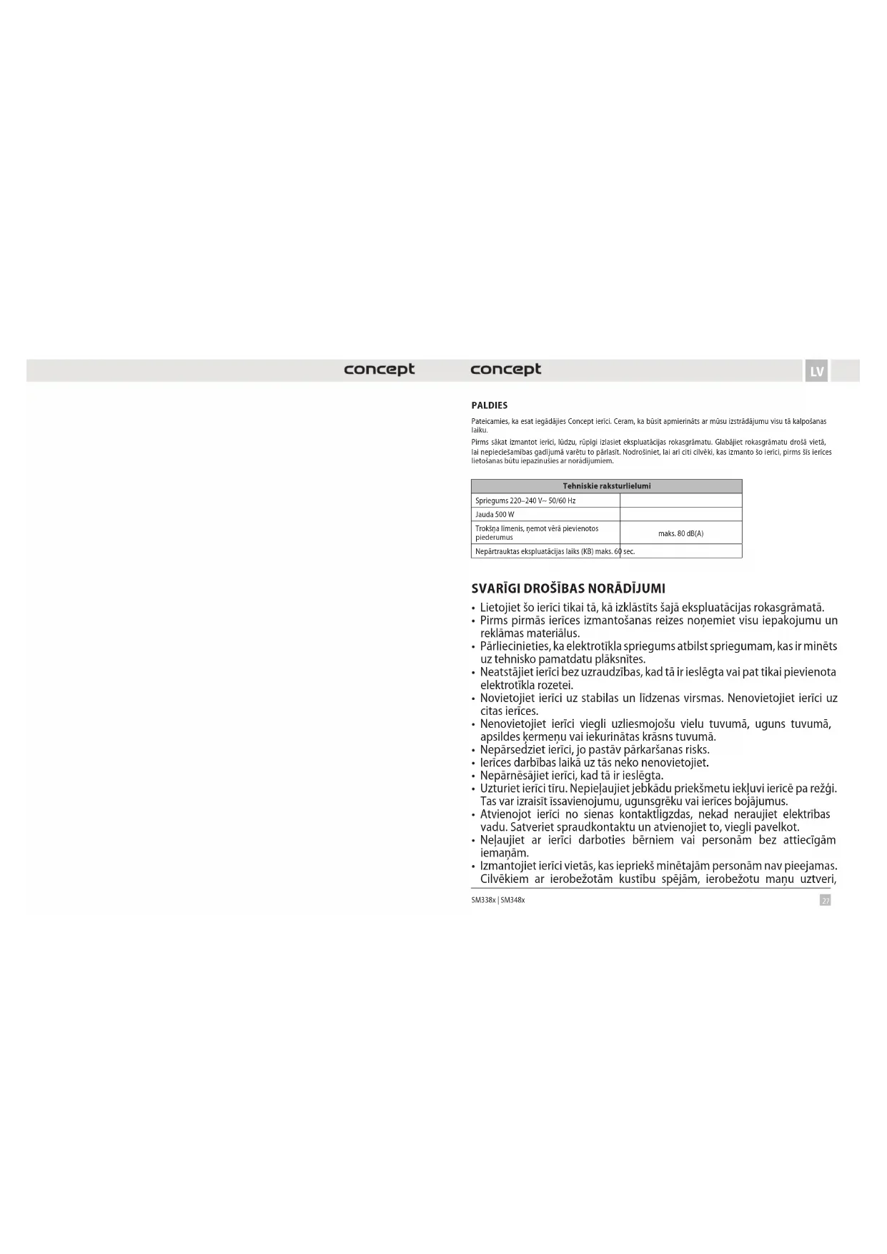 SM338x | SM348x PALDIES Pateicamies, ka esat iegādājies Concept ierīci. Ceram, ka būsit apmierināts ar mūsu izstrādājumu visu tā kalpošanas laiku. Pirms sākat izmantot ierīci, lūdzu, rūpīgi izlasiet ekspluatācijas rokasgrāmatu. Glabājiet rokasgrāmatu drošā vietā, lai nepieciešamības gadījumā varētu to pārlasīt. Nodrošiniet, lai arī citi cilvēki, kas izmanto šo ierīci, pirms šīs ierīces lietošanas būtu iepazinušies ar norādījumiem. Tehniskie raksturlielumi Spriegums 220–240 V~ 50/60 Hz Jauda 500 W Trokšņa līmenis, ņemot vērā pievienotos piederumus maks. 80 dB(A) Nepārtrauktas ekspluatācijas laiks (KB) maks. 60 sec. SVARĪGI DROŠĪBAS NORĀDĪJUMI