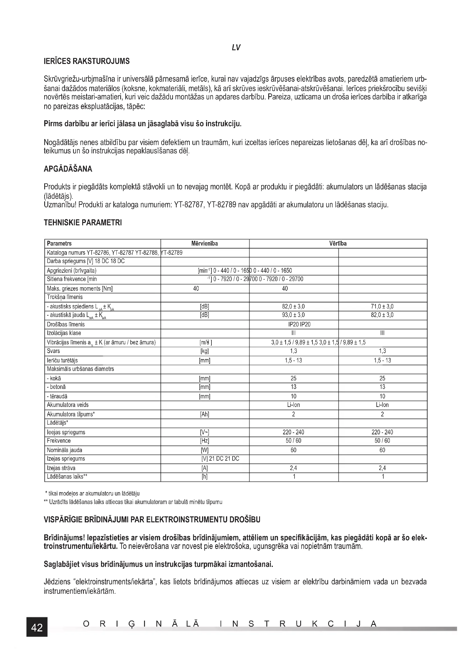 Produkts ir piegādāts komplektā stāvokli un to nevajag montēt. Kopā ar produktu ir piegādāti: akumulators un lādēšanas stacija (lādētājs). Uzmanību! Produkti ar kataloga numuriem: YT-82787, YT-82789 nav apgādāti ar akumulatoru un lādēšanas staciju. TEHNISKIE PARAMETRI Parametrs Mērvienība Vērtība Kataloga numurs YT-82786, YT-82787 YT-82788, YT-82789 Darba spriegums [V] 18 DC 18 DC Apgriezieni (brīvgaita) [min