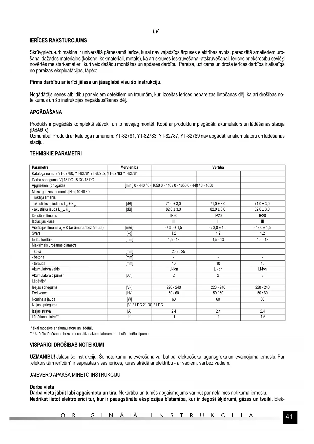 Produkts ir piegādāts komplektā stāvokli un to nevajag montēt. Kopā ar produktu ir piegādāti: akumulators un lādēšanas stacija (lādētājs). Uzmanību! Produkti ar kataloga numuriem: YT-82781, YT-82783, YT-82787, YT-82789 nav apgādāti ar akumulatoru un lādēšanas staciju. TEHNISKIE PARAMETRI Parametrs Mērvienība Vērtība Kataloga numurs YT-82780, YT-82781 YT-82782, YT-82783 YT-82784 Darba spriegums [V] 18 DC 18 DC 18 DC Apgriezieni (brīvgaita) [min
