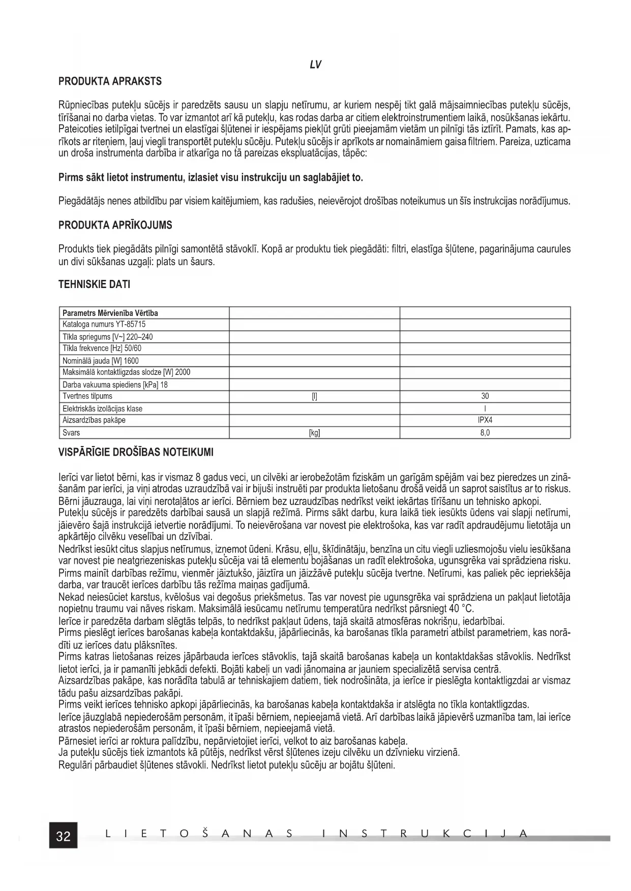 Produkts tiek piegādāts pilnīgi samontētā stāvoklī. Kopā ar produktu tiek piegādāti: fi ltri, elastīga šļūtene, pagarinājuma caurules un divi sūkšanas uzgaļi: plats un šaurs. TEHNISKIE DATI Parametrs Mērvienība Vērtība Kataloga numurs YT-85715 Tīkla spriegums [V~] 220–240 Tīkla frekvence [Hz] 50/60 Nominālā jauda [W] 1600 Maksimālā kontaktligzdas slodze [W] 2000 Darba vakuuma spiediens [kPa] 18 Tvertnes tilpums [l] 30 Elektriskās izolācijas klase I Aizsardzības pakāpe IPX4 Svars [kg] 8,0
