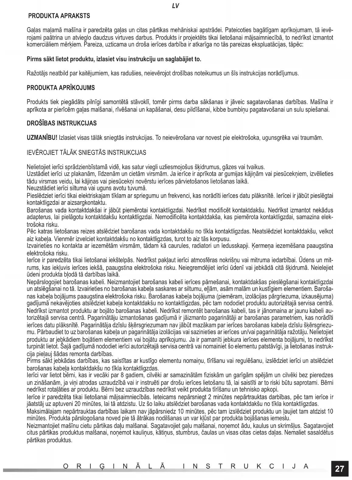 UZMANĪBU! Izlasiet visas tālāk sniegtās instrukcijas. To neievērošana var novest pie elektrošoka, ugunsgrēka vai traumām. IEVĒROJIET TĀLĀK SNIEGTĀS INSTRUKCIJAS Nelietojiet ierīci sprādzienbīstamā vidē, kas satur viegli uzliesmojošus šķidrumus, gāzes vai tvaikus. Uzstādiet ierīci uz plakanām, līdzenām un cietām virsmām. Ja ierīce ir aprīkota ar gumijas kājiņām vai piesūcekņiem, izvēlieties tādu virsmas veidu, lai kājiņas vai piesūcekņi novērstu ierīces pārvietošanos lietošanas laikā. Neuzstādiet ierīci siltuma vai uguns avotu tuvumā. Pieslēdziet ierīci tikai elektriskajam tīklam ar spriegumu un frekvenci, kas norādīti ierīces datu plāksnītē. Ierīcei ir jābūt pieslēgtai kontaktligzdai ar aizsargkontaktu. Barošanas vada kontaktdakšai ir jābūt piemērotai kontaktligzdai. Nedrīkst modifi cēt kontaktdakšu. Nedrīkst izmantot nekādus adapterus, lai pielāgotu kontaktdakšu kontaktligzdai. Nemodifi cēta kontaktdakša, kas piemērota kontaktligzdai, samazina elek- trošoka risku. Pēc katras lietošanas reizes atslēdziet barošanas vada kontaktdakšu no tīkla kontaktligzdas. Neatslēdziet kontaktdakšu, velkot aiz kabeļa. Vienmēr izvelciet kontaktdakšu no kontaktligzdas, turot to aiz tās korpusu. Izvairieties no kontakta ar iezemētām virsmām, tādam kā caurules, radiatori un ledusskapji. Ķermeņa iezemēšana paaugstina elektrošoka risku. Ierīce ir paredzēta tikai lietošanai iekštelpās. Nedrīkst pakļaut ierīci atmosfēras nokrišņu vai mitruma iedarbībai. Ūdens un mit- rums, kas iekļuvis ierīces iekšā, paaugstina elektrošoka risku. Neiegremdējiet ierīci ūdenī vai jebkādā citā šķidrumā. Neielejiet ūdeni produkta bļodā tā darbības laikā. Nepārslogojiet barošanas kabeli. Neizmantojiet barošanas kabeli ierīces pārnešanai, kontaktdakšas pieslēgšanai kontaktligzdai un atslēgšanai no tā. Izvairieties no barošanas kabeļa saskares ar siltumu, eļļām, asām malām un kustīgiem elementiem. Baroša- nas kabeļa bojājums paaugstina elektrošoka risku. Barošanas kabeļa bojājuma (piemēram, izolācijas pārgriezuma, izkausējuma) gadījumā nekavējoties atslēdziet kabeļa kontaktdakšu no kontaktligzdas, pēc tam nododiet produktu autorizētajā servisa centrā. Nedrīkst izmantot produktu ar bojāto barošanas kabeli. Nedrīkst remontēt barošanas kabeli, tas ir jānomaina ar jaunu kabeli au- torizētajā servisa centrā. Pagarinātāju izmantošanas gadījumā ir jāizmanto pagarinātāji ar barošanas parametriem, kas norādīti ierīces datu plāksnītē. Pagarinātāja dzīslu šķērsgriezumam nav jābūt mazākam par ierīces barošanas kabeļa dzīslu šķērsgriezu- mu. Pārbaudiet to uz barošanas kabeļa un pagarinātāja izolācijas vai sazinieties ar ierīces un/vai pagarinātāja ražotāju. Nelietojiet produktu ar jebkādiem bojātiem elementiem vai bojātu aprīkojumu. Ja ir pamanīti jebkura ierīces elementa bojājumi, to nedrīkst turpināt lietot. Šajā gadījumā nododiet ierīci autorizētajā servisa centrā vai nomainiet šo elementu patstāvīgi, ja lietošanas instruk- cija pieļauj šādas remonta darbības. Pirms sākt jebkādas darbības, kas saistītas ar kustīgo elementu nomaiņu, tīrīšanu vai regulēšanu, izslēdziet ierīci un atslēdziet barošanas kabeļa kontaktdakšu no tīkla kontaktligzdas. Ierīci var lietot bērni, kas ir vecāki par 8 gadiem, cilvēki ar samazinātām fi ziskām un garīgām spējām un cilvēki bez pieredzes un zināšanām, ja viņi atrodas uzraudzībā vai ir instruēti par drošu ierīces lietošanu tā, lai saistīti ar to riski būtu saprotami. Bērni nedrīkst rotaļāties ar produktu. Bērni bez uzraudzības nedrīkst veikt produkta tīrīšanu un tehnisko apkopi. Ierīce ir paredzēta tikai lietošanai mājsaimniecībās. Ieteicams nepārsniegt 2 minūtes nepārtrauktas darbības, pēc tam ierīce ir jāatstāj uz aptuveni 20 minūtes, lai tā atdzistu. Uz šo laiku atslēdziet barošanas vada kontaktdakšu no tīkla kontaktligzdas. Maksimālajam nepārtrauktas darbības laikam nav jāpārsniedz 10 minūtes, pēc tam izslēdziet produktu un ļaujiet tam atdzist 10 minūtes. Produkta pārslogošana noved pie tā ātrākas nodilšanas un var kļūst par produkta bojāšanas iemeslu. Neizmantojiet mašīnu cietu pārtikas daļu malšanai. Sagatavojiet gaļu malšanai, noņemot ādu, kaulus un skrimšļus. Sagatavojiet citus pārtikas produktus malšanai, noņemot kauliņus, kātiņus, stumbrus, čaulas un visas citas cietas daļas. Nemaliet sasaldētu