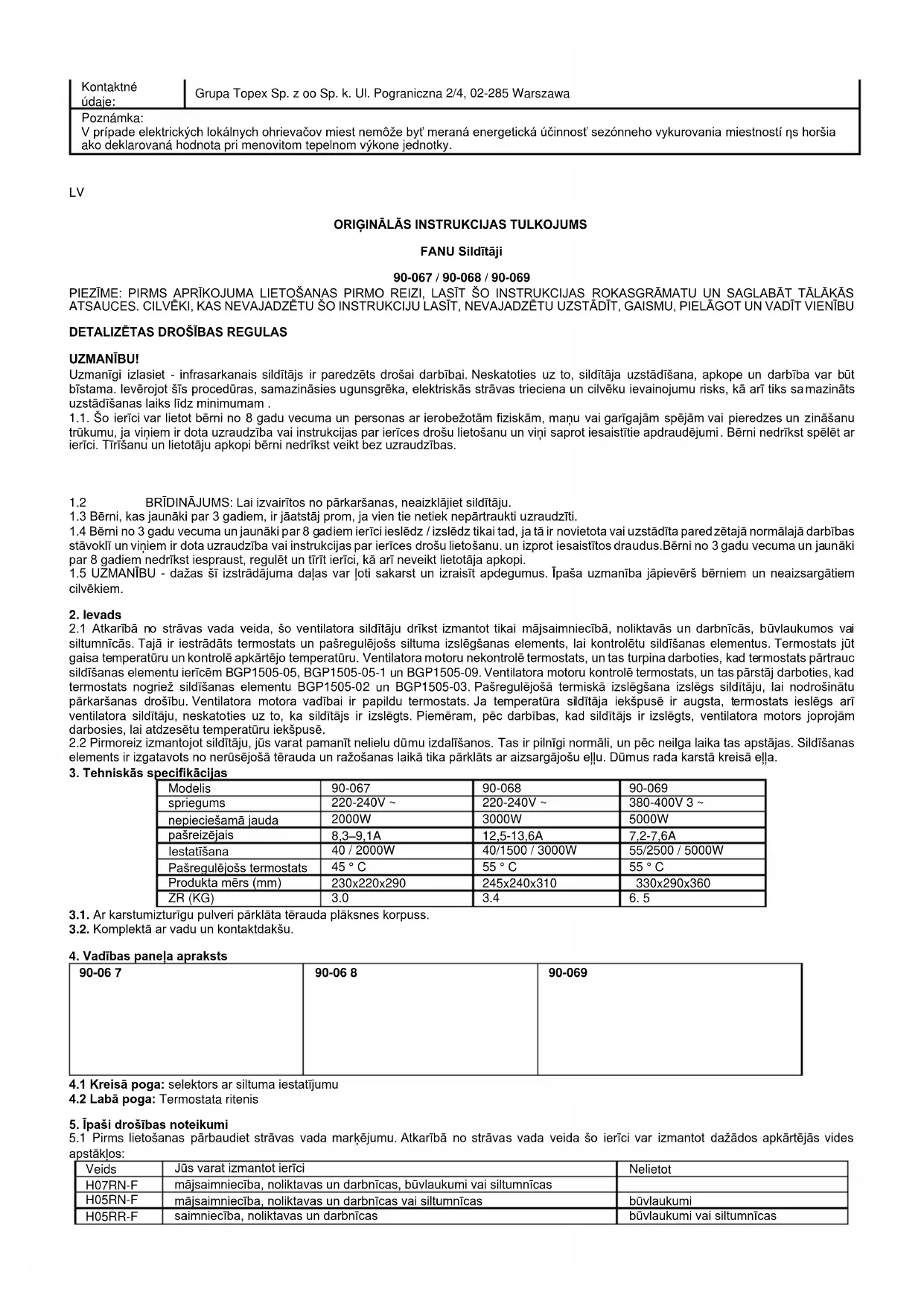 5.2.6 Ventilatora sildītāju nedrīkst novietot telpās, kur izmanto vai uzglabā viegli uzliesmojošus šķidrumus vai gāzes.