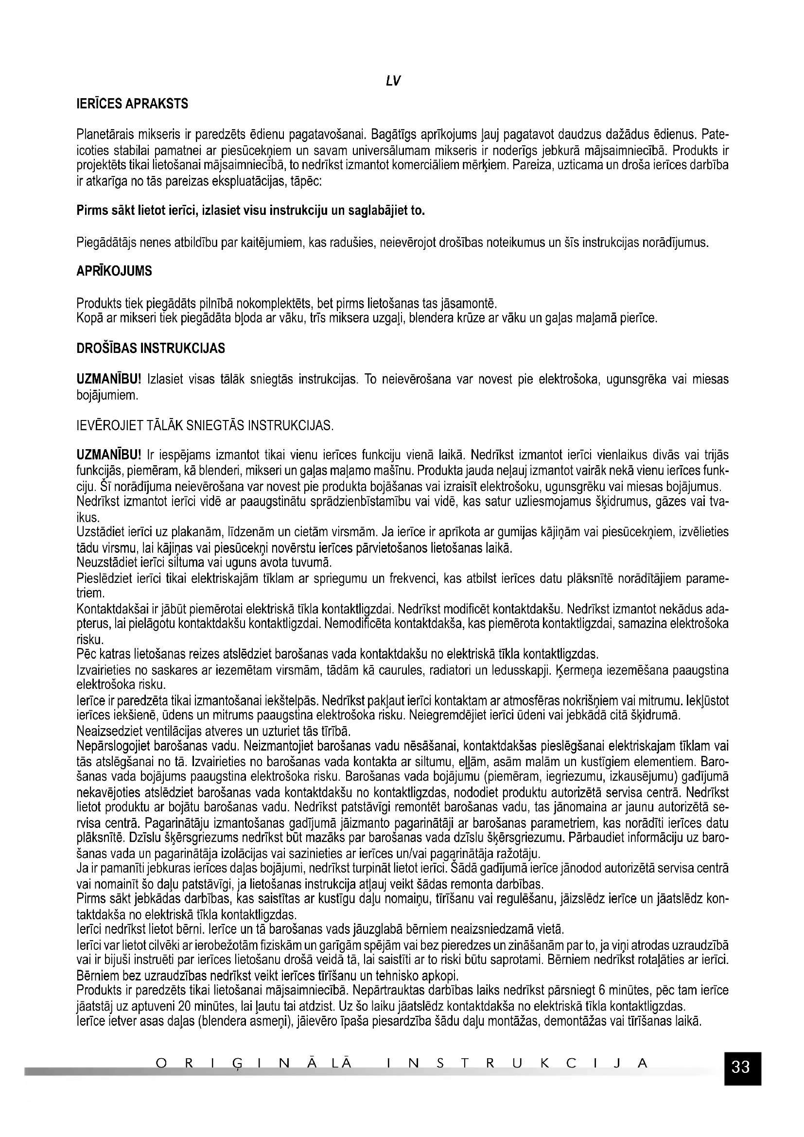 Planetārais mikseris ir paredzēts ēdienu pagatavošanai. Bagātīgs aprīkojums ļauj pagatavot daudzus dažādus ēdienus. Pate- icoties stabilai pamatnei ar piesūcekņiem un savam universālumam mikseris ir noderīgs jebkurā mājsaimniecībā. Produkts ir projektēts tikai lietošanai mājsaimniecībā, to nedrīkst izmantot komerciāliem mērķiem. Pareiza, uzticama un droša ierīces darbība ir atkarīga no tās pareizas ekspluatācijas, tāpēc: Pirms sākt lietot ierīci, izlasiet visu instrukciju un saglabājiet to. Piegādātājs nenes atbildību par kaitējumiem, kas radušies, neievērojot drošības noteikumus un šīs instrukcijas norādījumus. APR ĪKOJUMS Produkts tiek piegādāts pilnībā nokomplektēts, bet pirms lietošanas tas jāsamontē. Kopā ar mikseri tiek piegādāta bļoda ar vāku, trīs miksera uzgaļi, blendera krūze ar vāku un gaļas maļamā pierīce.