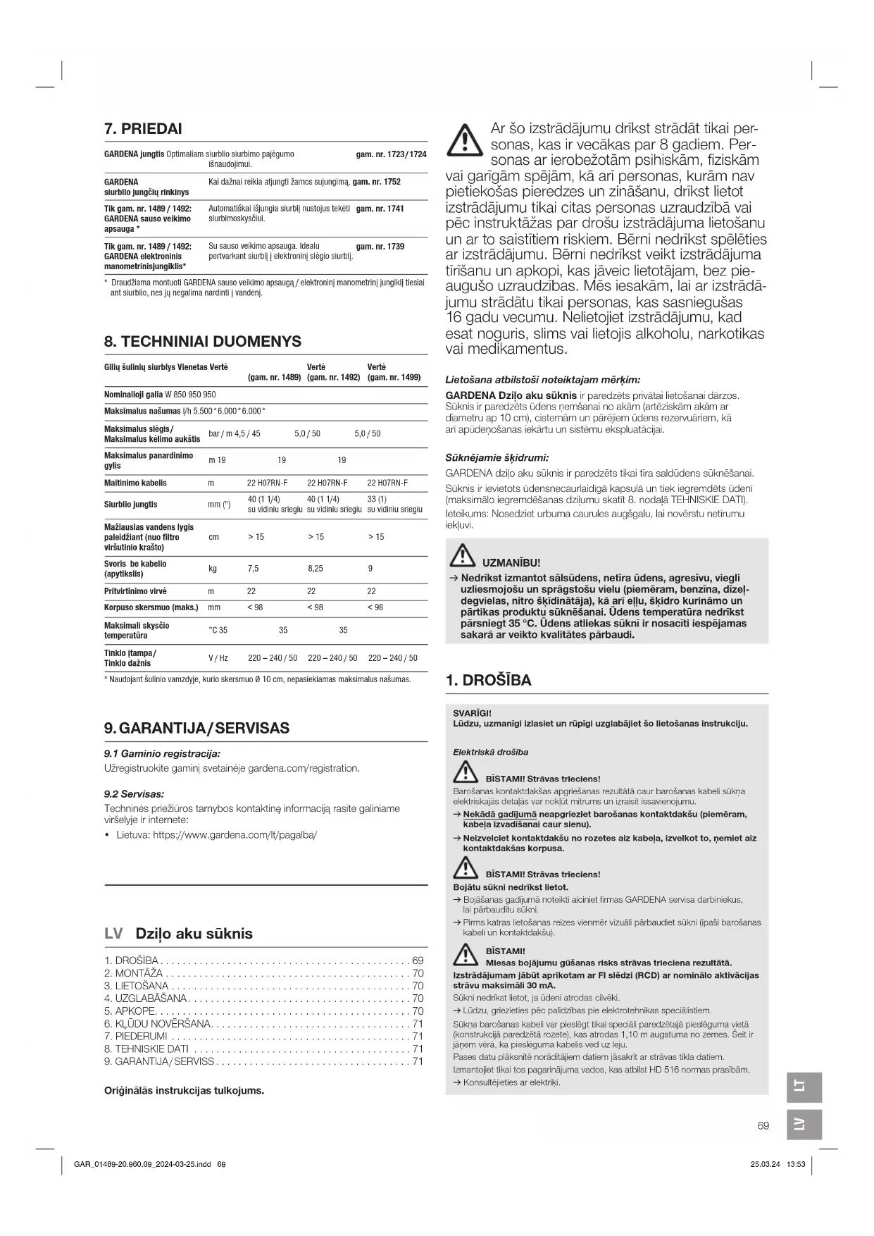 Oriģinālās instrukcijas tulkojums. Ar šo izstrādājumu drīkst strādāt tikai per- sonas, kas ir vecākas par 8 gadiem. Per- sonas ar ierobežotām psihiskām, fiziskām vai garīgām spējām, kā arī personas, kurām nav pietiekošas pieredzes un zināšanu, drīkst lietot izstrādājumu tikai citas personas uzraudzībā vai pēc instruktāžas par drošu izstrādājuma lietošanu un ar to saistītiem riskiem. Bērni nedrīkst spēlēties ar izstrādājumu. Bērni nedrī kst veikt izstrādājuma tīrīšanu un apkopi, kas jāveic lietotājam, bez pie- augušo uzraudzības. Mēs iesakām, lai ar izstrādā- jumu strādātu tikai personas, kas sasniegušas 16 gadu vecumu. Nelietojiet izstrādājumu, kad esat noguris, slims vai lietojis alkoholu, narkotikas vai medikamentus. Lietošana atbilstoši noteiktajam mērķim: GARDENA Dziļo aku sūknis ir paredzēts privātai lietošanai dārzos. Sūknis ir paredzēts ūdens ņemšanai no akām (artēziskām akām ar diametru ap 10 cm), cisternām un pārējiem ūdens rezervuāriem, kā arī apūdeņošanas iekārtu un sistēmu ekspluatācijai. Sūknējamie šķidrumi: GARDENA dziļo aku sūknis ir paredzēts tikai tīra saldūdens sūknēšanai. Sūknis ir ievietots ūdensnecaurlaidīgā kapsulā un tiek iegremdēts ūdenī (maksimālo iegremdēšanas dziļumu skatīt 8. nodaļā TEHNISKIE DATI). Ieteikums: Nosedziet urbuma caurules augšgalu, lai novērstu netīrumu iekļuvi. UZMANĪBU! v Nedrīkst izmantot sālsūdens, netīra ūdens, agresīvu, viegli uzliesmojošu un sprāgstošu vielu (piemēram, benzīna, dīzeļ- degvielas, nitro šķīdinātāja), kā arī eļļu, šķidro kurināmo un pārtikas produktu sūknēšanai. Ūdens temperatūra nedrīkst pārsniegt 35 °C. Ūdens atliekas sūknī ir nosacīti iespējamas sakarā ar veikto kvalitātes pārbaudi. SVARĪGI! Lūdzu, uzmanīgi izlasiet un rūpīgi uzglabājiet šo lietošanas instrukciju. Elektriskā drošība BĪSTAMI! Strāvas trieciens! Barošanas kontaktdakšas apgriešanas rezultātā caur barošanas kabeli sūkņa elektriskajās detaļās var nokļūt mitrums un izraisīt īssavienojumu. v Nekādā gadījumā neapgrieziet barošanas kontaktdakšu (piemēram, kabeļa izvadīšanai caur sienu). v Neizvelciet kontaktdakšu no rozetes aiz kabeļa, izvelkot to, ņemiet aiz kontaktdakšas korpusa. BĪSTAMI! Strāvas trieciens! Bojātu sūkni nedrīkst lietot. v Bojāšanas gadījumā noteikti aiciniet firmas GARDENA servisa darbiniekus, lai pārbaudītu sūkni. v Pirms katras lietošanas reizes vienmēr vizuāli pārbaudiet sūkni (īpaši barošanas kabeli un kontaktdakšu). BĪSTAMI! Miesas bojājumu gūšanas risks strāvas trieciena rezultātā. Izstrādājumam jābūt aprīkotam ar FI slēdzi (RCD) ar nominālo aktivācijas strāvu maksimāli 30 mA. Sūkni nedrīkst lietot, ja ūdenī atrodas cilvēki. v Lūdzu, griezieties pēc palīdzības pie elektrotehnikas speciālistiem. Sūkņa barošanas kabeli var pieslēgt tikai speciāli paredzētajā pieslēguma vietā (konstrukcijā paredzētā rozete), kas atrodas 1,10 m augstuma no zemes. Šeit ir jāņem vērā, ka pieslēguma kabelis ved uz leju. Pases datu plāksnītē norādītājiem datiem jāsakrīt ar strāvas tīkla datiem. Izmantojiet tikai tos pagarinājuma vados, kas atbilst HD 516 normas prasībām. v Konsultējieties ar elektriķi.