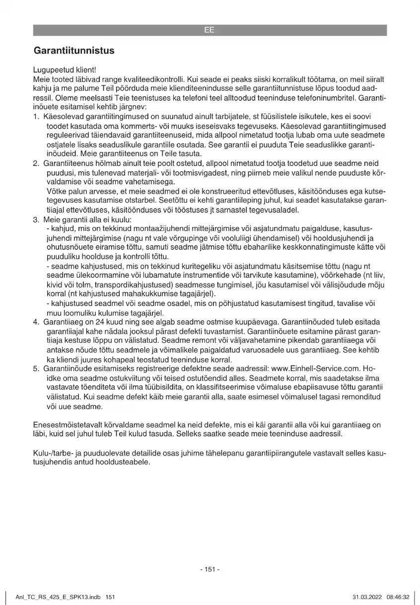 nepieciešamās rezerves daļas numurs. Pašreizējās cenas un informācija ir pieejama tīmekļa vietnē www.Einhell-Service.com. Anl_TC_RS_425_E_SPK13.indb 154Anl_TC_RS_425_E_SPK13.indb 154 31.03.2022 08:46:3331.03.2022 08:46:33LV