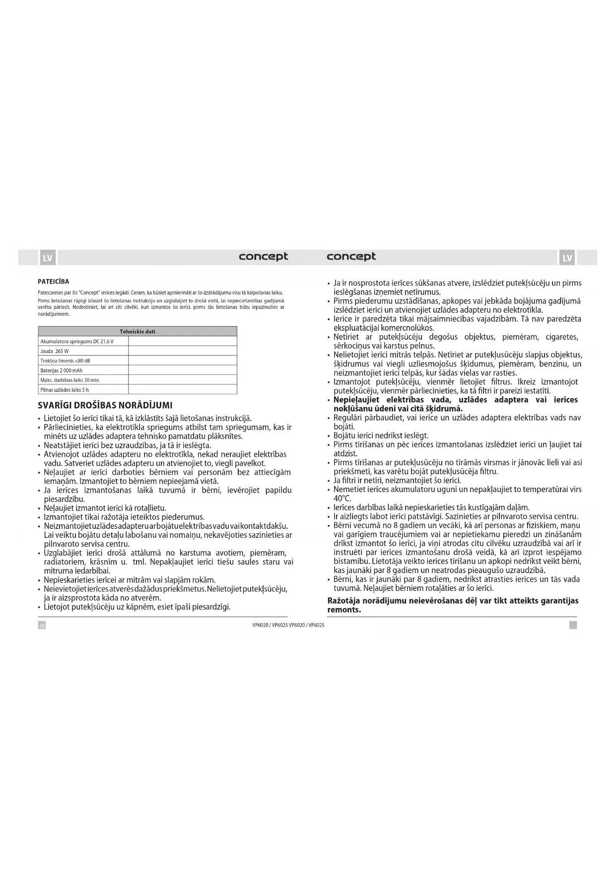 - Polietilēna (PE) maisiņus nododiet otrreizējai pārstrādei paredzēto materiālu savākšanas punktā. Ierīces otrreizējā pārstrāde tās kalpošanas laika beigās Šī ierīce ir marķēta saskaņā ar Eiropas Parlamenta un Padomes Direktīvu 2012/19/ES par elektrisko un elektronisko iekārtu atkritumiem (EEIA). Simbols uz izstrādājuma vai tā iepakojuma norāda, ka šis izstrādājums nepieder sadzīves atkritumiem. Tas jānogādā elektrisko un elektronisko iekārtu otrreizējās pārstrādes savākšanas punktā. Nodrošinot šā izstrādājuma pareizu iznīcināšanu, tiks novērsta nelabvēlīga ietekme uz vidi un cilvēku veselību, ko var izraisīt nepareiza ierīces iznīcināšana. Iznīcināšana jāveic saskaņā ar noteikumiem par atkritumu apstrādi. Lai iegūtu papildu informāciju par šīs ierīces otrreizēju pārstrādi, lūdzu, sazinieties ar vietējās pašvaldības sadzīves atkritumu iznīcināšanas dienestu vai veikalu, kurā iegādājāties izstrādājumu. Šis izstrādājums atbilst visām piemērojamo ES direktīvu pamatprasībām. Izmaiņas tekstā, konstrukcijā un tehniskajās specifikācijās var tikt veiktas bez iepriekšēja brīdinājuma, un mēs paturam tiesības veikt šīs izmaiņas.34 35 ENEN VP6020 / VP6025 VP6020 / VP6025 ACKNOWLEDGMENT Thank you for purchasing a Concept product. We wish you much joy with your new appliance every day you use it. Please read the instruction manual carefully before initial use. To refer to this manual any time you need to, we recommend you to keep it in a safe place. And please pass it to any future owner of the appliance. Technical specifications Battery voltage DC 21,6 V Input 265 W Sound level ≤80 dB Battery 2 000 mAh Max. operating hours 30 min Full charging time 5 hrs.