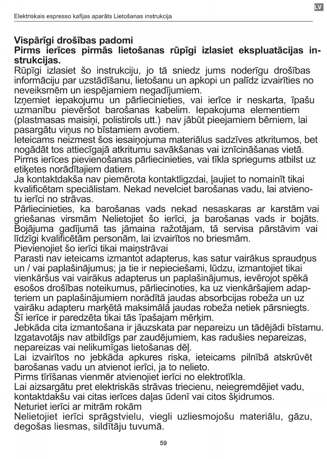 Vispārīgi drošības padomi Pirms ierīces pirmās lietošanas rūpīgi izlasiet ekspluatācijas in- strukcijas. Rūpīgi izlasiet šo instrukciju, jo tā sniedz jums noderīgu drošības informāciju par uzstādīšanu, lietošanu un apkopi un palīdz izvairīties no neveiksmēm un iespējamiem negadījumiem. Izņemiet iepakojumu un pārliecinieties, vai ierīce ir neskarta, īpašu uzmanību pievēršot barošanas kabelim. Iepakojuma elementiem (plastmasas maisiņi, polistirols utt.) nav jābūt pieejamiem bērniem, lai pasargātu viņus no bīstamiem avotiem. Ieteicams neizmest šos iesaiņojuma materiālus sadzīves atkritumos, bet nogādāt tos attiecīgajā atkritumu savākšanas vai iznīcināšanas vietā. Pirms ierīces pievienošanas pārliecinieties, vai tīkla spriegums atbilst uz etiķetes norādītajiem datiem. Ja kontaktdakša nav piemērota kontaktligzdai, ļaujiet to nomainīt tikai kvalicētam speciālistam. Nekad nevelciet barošanas vadu, lai atvieno- tu ierīci no strāvas. Pārliecinieties, ka barošanas vads nekad nesaskaras ar karstām vai griešanas virsmām Nelietojiet šo ierīci, ja barošanas vads ir bojāts. Bojājuma gadījumā tas jāmaina ražotājam, tā servisa pārstāvim vai līdzīgi kvalicētām personām, lai izvairītos no briesmām. Pievienojiet šo ierīci tikai maiņstrāvai Parasti nav ieteicams izmantot adapterus, kas satur vairākus spraudņus un / vai paplašinājumus; ja tie ir nepieciešami, lūdzu, izmantojiet tikai vienkāršus vai vairākus adapterus un paplašinājumus, ievērojot spēkā esošos drošības noteikumus, pārliecinoties, ka uz vienkāršajiem adap- teriem un paplašinājumiem norādītā jaudas absorbcijas robeža un uz vairāku adapteru marķētā maksimālā jaudas robeža netiek pārsniegts. Šī ierīce ir paredzēta tikai tās īpašajam mērķim. Jebkāda cita izmantošana ir jāuzskata par nepareizu un tādējādi bīstamu. Izgatavotājs nav atbildīgs par zaudējumiem, kas radušies nepareizas, nepareizas vai nelikumīgas lietošanas dēļ. Lai izvairītos no jebkāda apkures riska, ieteicams pilnībā atskrūvēt barošanas vadu un atvienot ierīci, ja to nelieto. Pirms tīrīšanas vienmēr atvienojiet ierīci no elektrotīkla. Lai aizsargātu pret elektriskās strāvas triecienu, neiegremdējiet vadu, kontaktdakšu vai citas ierīces daļas ūdenī vai citos šķidrumos. Neturiet ierīci ar mitrām rokām Nelietojiet ierīci sprāgstvielu, viegli uzliesmojošu materiālu, gāzu, degošas liesmas, sildītāju tuvumā.60 Elektriskais espresso kajas aparāts Lietošanas instrukcija Neļaujiet bērniem, invalīdiem vai visiem cilvēkiem bez pieredzes vai tehniskām iespējām lietot ierīci, ja viņi netiek pienācīgi uzraudzīti. Cieša uzraudzība ir nepieciešama, ja jebkuru ierīci lieto bērni. Pārliecinieties, ka bērni nespēlē ar šo ierīci. Ja jūs nolemjat vairs nelietot ierīci, padariet to nelie- tojamu, izslēdziet un atvienojiet no strāvas Visas bīstamās ierīces daļas atslēdziet un glabājiet bērniem nepieejamā vietā. Drošības brīdinājumi Šī ierīce ir radīta, lai “pagatavotu kaju”. Nekad nelietojiet citus ekstraktus, kakao pulveri, kumelītes, citus uzlējumus vai šķīstošas vielas: tie var aizsprostot ltra caurumus. Tīrīšanas laikā nekad neiegremdējiet pamatni un katlu ūdenī: tā ir elektriska ierīce. Uzmanieties, lai nenotiktu ūdens vai ūdens tvaika izšļakstīšanās vai aparāta sabojāšanās nepareizas lietošanas dēļ. Lietojot ierīci, nepieskarieties karstajām virsmām. Izmantojiet pogas vai rokturus. Pirms kajas automāta novietošanas uz atbalsta konstrukcijām piepildiet katlu ar ūdeni. Neļaujiet strāvas vadam saskarties ar kajas automāta metāla daļām, kad tas darbojas. Atbalsta pamatne un katls darbības laikā kļūst ļoti karsts, nepieskarieties šīm detaļām, lai izvairītos no applaucēšanās riska. Nepaceliet vāku, kamēr darbojas kajas automāts; pirms vāka pacelšanas pagaidiet dažas minūtes pēc izslēgšanas, jo pēkšņa tvaika izdalīšana var izraisīt apdegumus. Neatstājiet strāvas vadu pievienotu, kad nelietojiet kajas automātu. Nevelciet strāvas kabeli, lai to atvienotu. Ja kabelis ir bojāts, nomainiet to, sazinoties tikai ar pilnvarotiem servisa centriem. Neiegremdējiet kajas automātu ūdenī vai citā šķidrumā un neļaujiet šķidrumiem iekļūt tajā. Nepakļaujiet kajas automātu mitruma avotiem un nelietojiet to ārpus telpām. Šķidruma iekļūšanas gadījumā kajas automāta korpusa iekšpusē nekavējoties atvienojiet kontaktdakšu no elektrības kontakt- ligzdas un kajas automātu var remontēt kvalicēts personāls. Nepieskarieties kajas automātam un strāvas vadam ar mitrām rokām. Kajas automāts ir paredzēts lietošanai tikai mājsaimniecībās , tas nav paredzēts komerciālai lietošanai.61 Elektriskais espresso kajas aparāts Lietošanas instrukcija