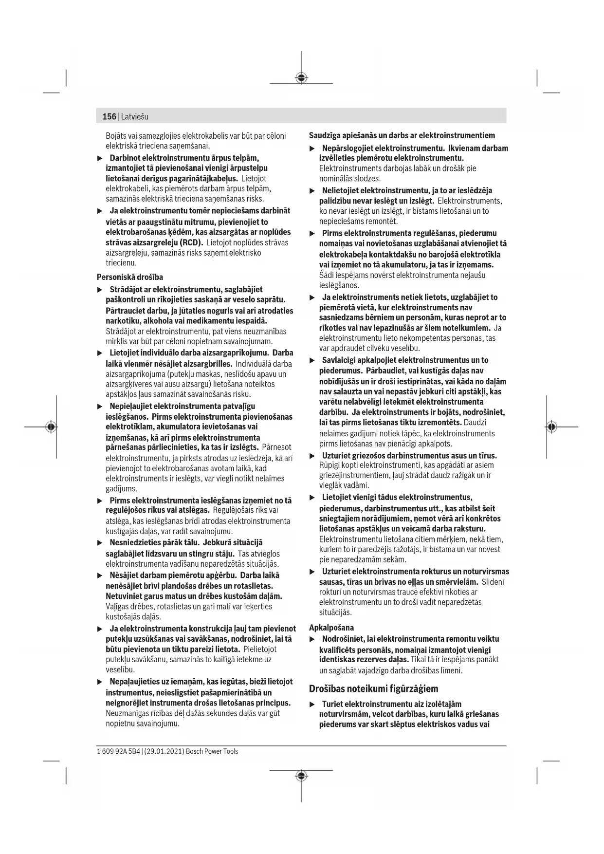 Šajā pamācībā norādītais vibrācijas līmenis un instrumenta radītā trokšņa vērtība ir izmērīta atbilstoši standartā noteiktajai procedūrai un var tikt izmantota elektroinstrumentu savstarpējai salīdzināšanai. To var izmantot arī vibrācijas un trokšņa radītās papildu slodzes iepriekšējai novērtēšanai. Šeit norādītais svārstību līmenis un instrumenta radītā trokšņa vērtība ir attiecināma uz elektroinstrumenta galvenajiem pielietojuma veidiem. Ja elektroinstruments tiek lietots netipiskiem mērķiem, kopā ar netipiskiem darbinstrumentiem vai nav vajadzīgajā veidā apkalpots, tā svārstību līmenis un radītā trokšņa vērtība var atšķirties no šeit norādītajām vērtībām. Tas var ievērojami palielināt svārstību un trokšņa radīto papildu slodzi kopējam darba laika posmam. Lai precīzi izvērtētu svārstību un trokšņa radīto papildu slodzi zināmam darba laika posmam, jāņem vērā arī laiks, kad elektroinstruments ir izslēgts vai arī darbojas, taču faktiski netiek izmantots paredzētā darba veikšanai. Tas var ievērojami samazināt svārstību un trokšņa radīto papildu slodzi kopējam darba laika posmam. Veiciet papildu pasākumus, lai pasargātu strādājošo personu no vibrācijas kaitīgās iedarbības, piemēram, savlaicīgi veiciet elektroinstrumenta un darbinstrumentu apkalpošanu, uzturiet rokas siltas un pareizi plānojiet darbu. Montāža u Pirms elektroinstrumenta apkopes vai apkalpošanas izvelciet tā elektrokabeļa kontaktdakšu no barojošā elektrotīkla kontaktligzdas. Zāģa asmens iestiprināšana vai nomaiņa u Veicot instrumenta montāžu vai iestiprināmo darbinstrumentu nomaiņu, uzvelciet aizsargcimdus. Iestiprināmie darbinstrumenti ir asi un ilgstošas lietošanas laikā var sakarst. Zāģa asmens izvēle Pārskats par ieteicamajiem zāģa asmeņiem ir sniegts šīs pamācības beigās. Iestipriniet elektroinstrumentā vienīgi zāģa asmeņus ar vienizciļņa kātu (T veida kātu). Zāģa asmenim nav jābūt garākam, nekā tas nepieciešams zāģējumu veidošanai paredzētajā dziļumā. Veidojot liektus zāģējumus ar mazu liekuma rādiusu, lietojiet šauru zāģa asmeni. Zāģa asmens iestiprināšana (attēlsA) u Pirms zāģa asmens iestiprināšanas notīriet tā kātu. Netīru kātu nav iespējams droši iestiprināt. Iebīdiet zāģa asmeni (11) ar zāģēšanas virzienā vērstiem zobiem zāģa asmens stiprinājumā (9). Iestiprinot zāģa asmeni, sekojiet, lai zāģa asmens aizmugurējā mala ievietotos vadotnes rullīša (10) rievā. u Pārbaudiet, vai zāģa asmens ir stingri iestiprināts. Slikti iestiprināts zāģa asmens var izkrist no stiprinājuma un savainot strādājošo personu. Zāģa asmens izņemšana (attēlsB) Pabīdiet zāģa asmens stiprinājumu (9) augšup, bultas virzienā un izņemiet zāģa asmeni (11). Pretplaisāšanas aizsargs (attēlsC) Pretplaisāšanas aizsargs (15) (piederums) zāģēšanas laikā ļauj novērst zāģējamo koka priekšmetu virsmas plaisāšanu. Pretplaisāšanas aizsargu var izmantot vienīgi kopā ar noteikta tipa zāģa asmeņiem un pie zāģēšanas leņķa 0°. No apakšas iespiediet pretplaisāšanas aizsargu (15) balstplāksnē (7). Putekļu un skaidu uzsūkšana Dažu materiālu, piemēram, svinu saturošu krāsu, dažu koksnes šķirņu, minerālu un metālu putekļi var būt kaitīgi veselībai. Pieskaršanās šādiem putekļiem vai to ieelpošana var izraisīt alerģiskas reakcijas vai elpošanas ceļu saslimšanu elektroinstrumenta lietotājam vai darba vietai tuvumā esošajām personām. Atsevišķu materiālu putekļi, piemēram, putekļi, kas rodas, zāģējot ozola vai dižskābarža koksni, var izraisīt vēzi, īpaši tad, ja koksne iepriekš ir tikusi ķīmiski apstrādāta (ar hromātu vai koksnes aizsardzības līdzekļiem). Azbestu saturošus materiālus drīkst apstrādāt vienīgi personas ar īpašām profesionālām iemaņām. – Pielietojiet apstrādājamajam materiālam vispiemērotāko putekļu uzsūkšanas metodi. – Darba vietai jābūt labi ventilējamai. – Darba laikā ieteicams izmantot masku elpošanas ceļu aizsardzībai ar filtrēšanas klasi P2. Ievērojiet jūsu valstī spēkā esošos priekšrakstus, kas attiecas uz apstrādājamo materiālu. 1 609 92A 5B4 | (29.01.2021) Bosch Power ToolsLatviešu | 159 u Nepieļaujiet putekļu uzkrāšanos darba vietā. Putekļi var viegli aizdegties. Nosedzošais pārsegs Pirms elektroinstrumenta pievienošanas pie vakuumsūcēja noņemiet no tā nosedzošo pārsegu (13). Novietojiet nosedzošo pārsegu (13) uz elektroinstrumenta tā, lai tā turētāji fiksētos korpusa izgriezumos. Strādājot bez vakuumsūcēja un veidojot slīpos zāģējumus, noņemiet nosedzošo pārsegu (13). Šim nolūkam saspiediet pārsegu tā ārējo turētāju augstumā un to pavelciet, pārvietojot virzienā uz elektroinstrumenta priekšpusi. Pievienošana vakuumsūcējam Uzbīdiet uzsūkšanas šļūteni (5) (piederums) uz putekļu izvadīšanas īscaurules (6). Savienojiet uzsūkšanas šļūteni (5) ar vakuumsūcēju (piederums). Pārskats par instrumenta savienošanas iespējām ar dažādiem vakuumsūcējiem ir sniegts šīs pamācības beigās. Lai nodrošinātu optimālu putekļu uzsūkšanu, ja iespējams, iestipriniet elektroinstrumentā pretplaisāšanas aizsargu (15). Putekļsūcējam jābūt piemērotam apstrādājamā materiāla putekļu uzsūkšanai. Veselībai īpaši kaitīgu, kancerogēnu vai sausuputekļu uzsūkšanai lietojiet speciālus vakuumsūcējus. Lietošana Darba režīmi u Pirms elektroinstrumenta apkopes vai apkalpošanas izvelciet tā elektrokabeļa kontaktdakšu no barojošā elektrotīkla kontaktligzdas. Svārsta iedarbības regulēšana Četrās pakāpēs regulējama svārsta iedarbība ļauj optimāli izvēlēties zāģēšanas ātrumu, zāģēšanas jaudu un zāģējuma virsmas tīrību atbilstoši zāģējamā materiāla īpašīb