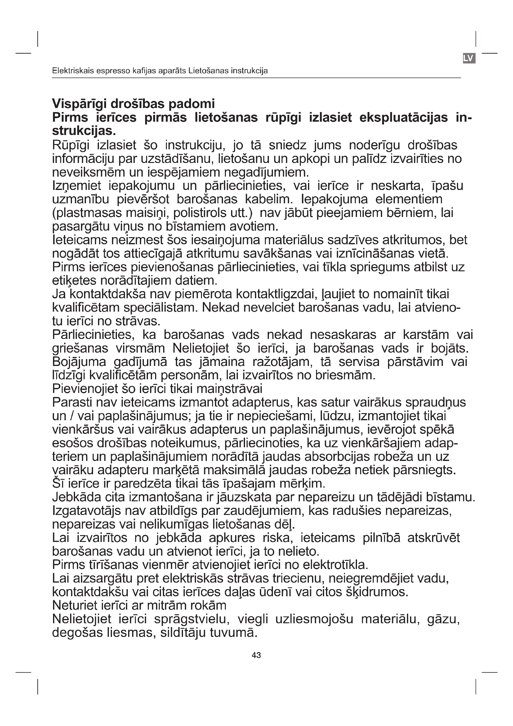 Vispārīgi drošības padomi Pirms ierīces pirmās lietošanas rūpīgi izlasiet ekspluatācijas in- strukcijas. Rūpīgi izlasiet šo instrukciju, jo tā sniedz jums noderīgu drošības informāciju par uzstādīšanu, lietošanu un apkopi un palīdz izvairīties no neveiksmēm un iespējamiem negadījumiem. Izņemiet iepakojumu un pārliecinieties, vai ierīce ir neskarta, īpašu uzmanību pievēršot barošanas kabelim. Iepakojuma elementiem (plastmasas maisiņi, polistirols utt.) nav jābūt pieejamiem bērniem, lai pasargātu viņus no bīstamiem avotiem. Ieteicams neizmest šos iesaiņojuma materiālus sadzīves atkritumos, bet nogādāt tos attiecīgajā atkritumu savākšanas vai iznīcināšanas vietā. Pirms ierīces pievienošanas pārliecinieties, vai tīkla spriegums atbilst uz etiķetes norādītajiem datiem. Ja kontaktdakša nav piemērota kontaktligzdai, ļaujiet to nomainīt tikai kvalicētam speciālistam. Nekad nevelciet barošanas vadu, lai atvieno- tu ierīci no strāvas. Pārliecinieties, ka barošanas vads nekad nesaskaras ar karstām vai griešanas virsmām Nelietojiet šo ierīci, ja barošanas vads ir bojāts. Bojājuma gadījumā tas jāmaina ražotājam, tā servisa pārstāvim vai līdzīgi kvalicētām personām, lai izvairītos no briesmām. Pievienojiet šo ierīci tikai maiņstrāvai Parasti nav ieteicams izmantot adapterus, kas satur vairākus spraudņus un / vai paplašinājumus; ja tie ir nepieciešami, lūdzu, izmantojiet tikai vienkāršus vai vairākus adapterus un paplašinājumus, ievērojot spēkā esošos drošības noteikumus, pārliecinoties, ka uz vienkāršajiem adap- teriem un paplašinājumiem norādītā jaudas absorbcijas robeža un uz vairāku adapteru marķētā maksimālā jaudas robeža netiek pārsniegts. Šī ierīce ir paredzēta tikai tās īpašajam mērķim. Jebkāda cita izmantošana ir jāuzskata par nepareizu un tādējādi bīstamu. Izgatavotājs nav atbildīgs par zaudējumiem, kas radušies nepareizas, nepareizas vai nelikumīgas lietošanas dēļ. Lai izvairītos no jebkāda apkures riska, ieteicams pilnībā atskrūvēt barošanas vadu un atvienot ierīci, ja to nelieto. Pirms tīrīšanas vienmēr atvienojiet ierīci no elektrotīkla. Lai aizsargātu pret elektriskās strāvas triecienu, neiegremdējiet vadu, kontaktdakšu vai citas ierīces daļas ūdenī vai citos šķidrumos. Neturiet ierīci ar mitrām rokām Nelietojiet ierīci sprāgstvielu, viegli uzliesmojošu materiālu, gāzu, degošas liesmas, sildītāju tuvumā.44 Elektriskais espresso kajas aparāts Lietošanas instrukcija Neļaujiet bērniem, invalīdiem vai visiem cilvēkiem bez pieredzes vai tehniskām iespējām lietot ierīci, ja viņi netiek pienācīgi uzraudzīti. Cieša uzraudzība ir nepieciešama, ja jebkuru ierīci lieto bērni. Pārliecinieties, ka bērni nespēlē ar šo ierīci. Ja jūs nolemjat vairs nelietot ierīci, padariet to nelie- tojamu, izslēdziet un atvienojiet no strāvas Visas bīstamās ierīces daļas atslēdziet un glabājiet bērniem nepieejamā vietā. Drošības brīdinājumi Šī ierīce ir radīta, lai “pagatavotu kaju”. Nekad nelietojiet citus ekstraktus, kakao pulveri, kumelītes, citus uzlējumus vai šķīstošas vielas: tie var aizsprostot ltra caurumus. Tīrīšanas laikā nekad neiegremdējiet pamatni un katlu ūdenī: tā ir elektriska ierīce. Uzmanieties, lai nenotiktu ūdens vai ūdens tvaika izšļakstīšanās vai aparāta sabojāšanās nepareizas lietošanas dēļ. Lietojot ierīci, nepieskarieties karstajām virsmām. Izmantojiet pogas vai rokturus. Pirms kajas automāta novietošanas uz atbalsta konstrukcijām piepildiet katlu ar ūdeni. Neļaujiet strāvas vadam saskarties ar kajas automāta metāla daļām, kad tas darbojas. Atbalsta pamatne un katls darbības laikā kļūst ļoti karsts, nepieskarieties šīm detaļām, lai izvairītos no applaucēšanās riska. Nepaceliet vāku, kamēr darbojas kajas automāts; pirms vāka pacelšanas pagaidiet dažas minūtes pēc izslēgšanas, jo pēkšņa tvaika izdalīšana var izraisīt apdegumus. Neatstājiet strāvas vadu pievienotu, kad nelietojiet kajas automātu. Nevelciet strāvas kabeli, lai to atvienotu. Ja kabelis ir bojāts, nomainiet to, sazinoties tikai ar pilnvarotiem servisa centriem. Neiegremdējiet kajas automātu ūdenī vai citā šķidrumā un neļaujiet šķidrumiem iekļūt tajā. Nepakļaujiet kajas automātu mitruma avotiem un nelietojiet to ārpus telpām. Šķidruma iekļūšanas gadījumā kajas automāta korpusa iekšpusē nekavējoties atvienojiet kontaktdakšu no elektrības kontakt- ligzdas un kajas automātu var remontēt kvalicēts personāls. Nepieskarieties kajas automātam un strāvas vadam ar mitrām rokām. Kajas automāts ir paredzēts lietošanai tikai mājsaimniecībās , tas nav paredzēts komerciālai lietošanai.45 Elektriskais espresso kajas aparāts Lietošanas instrukcija