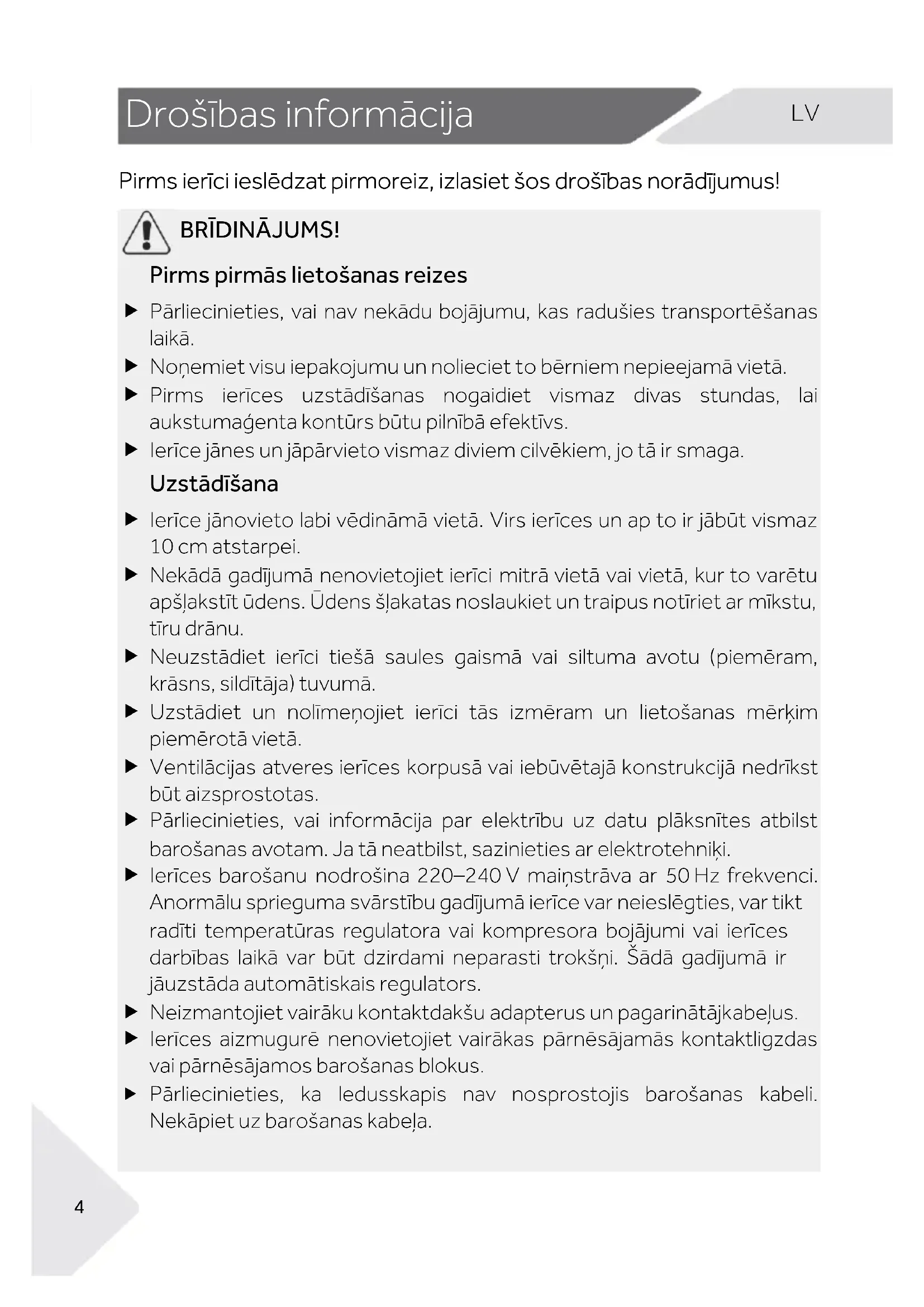 BRĪDINĀJUMS! Pirms pirmās lietošanas reizes Pārliecinieties, vai nav nekādu bojājumu, kas radušies transportēšanas laikā. Noņemiet visu iepakojumu un nolieciet to bērniem nepieejamā vietā. Pirms ierīces uzstādīšanas nogaidiet vismaz divas stundas, lai aukstumaģenta kontūrs būtu pilnībā efektīvs. Ierīce jānes un jāpārvieto vismaz diviem cilvēkiem, jo tā ir smaga. Uzstādīšana Ierīce jānovieto labi vēdināmā vietā. Virs ierīces un ap to ir jābūt vismaz 10 cm atstarpei. Nekādā gadījumā nenovietojiet ierīci mitrā vietā vai vietā, kur to varētu apšļakstīt ūdens. Ūdens šļakatas noslaukiet un traipus notīriet ar mīkstu, tīru drānu. Neuzstādiet ierīci tiešā saules gaismā vai siltuma avotu (piemēram, krāsns, sildītāja) tuvumā. Uzstādiet un nolīmeņojiet ierīci tās izmēram un lietošanas mērķim piemērotā vietā. Ventilācijas atveres ierīces korpusā vai iebūvētajā konstrukcijā nedrīkst būt aizsprostotas. Pārliecinieties, vai informācija par elektrību uz datu plāksnītes atbilst barošanas avotam. Ja tā neatbilst, sazinieties ar elektrotehniķi. Ierīces barošanu nodrošina 220–240 V maiņstrāva ar 50 Hz frekvenci. Anormālu sprieguma svārstību gadījumā ierīce var neieslēgties, var tikt radīti temperatūras regulatora vai kompresora bojājumi vai ierīces darbības laikā var būt dzirdami neparasti trokšņi. Šādā gadījumā ir jāuzstāda automātiskais regulators. Neizmantojiet vairāku kontaktdakšu adapterus un pagarinātājkabeļus. Ierīces aizmugurē nenovietojiet vairākas pārnēsājamās kontaktligzdas vai pārnēsājamos barošanas blokus. Pārliecinieties, ka ledusskapis nav nosprostojis barošanas kabeli. Nekāpiet uz barošanas kabeļa.Drošības informācija