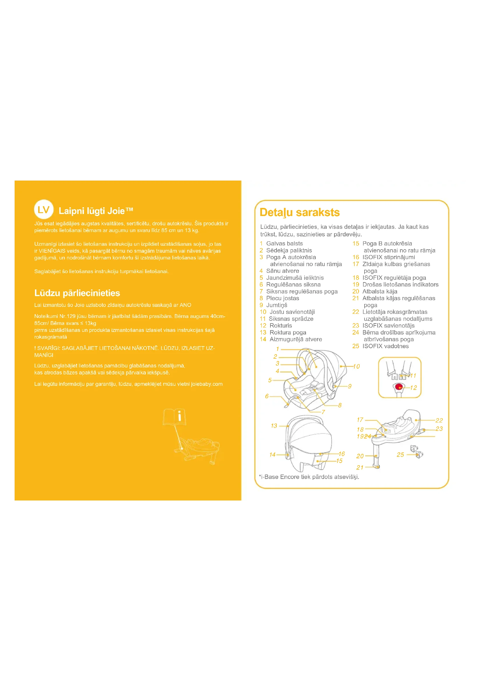 Laipni lūgti Joie™ Jūs esat iegādājies augstas kvalitātes, sertificētu, drošu autokrēslu. Šis produkts ir piemērots lietošanai bērnam ar augumu un svaru līdz 85 cm un 13 kg.Uzmanīgi izlasiet šo lietošanas instrukciju un izpildiet uzstādīšanas soļus, jo tas ir VIENĪGAIS veids, kā pasargāt bērnu no smagām traumām vai nāves avārijas gadījumā, un nodrošināt bērnam komfortu šī izstrādājuma lietošanas laikā.Saglabājiet šo lietošanas instrukciju turpmākai lietošanai. Lūdzu pārliecinieties Lai izmantotu šo Joie uzlaboto zīdaiņu autokrēslu saskaņā ar ANONoteikumi Nr.129 jūsu bērnam ir jāatbilst šādām prasībām. Bērna augums 40cm-85cm/ Bērna svars ≤ 13kg pirms uzstādīšanas un produkta izmantošanas izlasiet visas instrukcijas šajā rokasgrāmatā! SVARĪGI: SAGLABĀJIET LIETOŠANAI NĀKOTNĒ. LŪDZU, IZLASIET UZ-MANĪGILūdzu, uzglabājiet lietošanas pamācību glabāšanas nodalījumā, kas atrodas bāzes apakšā vai sēdekļa pārvalka iekšpusē.Lai iegūtu informāciju par garantiju, lūdzu, apmeklējiet mūsu vietni joiebaby.com Lūdzu, pārliecinieties, ka visas detaļas ir iekļautas. Ja kaut kas trūkst, lūdzu, sazinieties ar pārdevēju. 1 Galvas balsts 2 Sēdekļa paliktnis 3 Poga A autokrēsla atvienošanai no ratu rāmja 4 Sānu atvere 5 Jaundzimušā ieliktnis 6 Regulēšanas siksna 7 Siksnas regulēšanas poga 8 Plecu jostas 9 Jumtiņš 10 Jostu savienotāji 11 Siksnas sprādze 12 Rokturis 13 Roktura poga 14 Aizmugurējā atvere Detaļu saraksts 15 Poga B autokrēsla atvienošanai no ratu rāmja 16 ISOFIX stiprinājumi 17 Zīdaiņa kulbas griešanas poga 18 ISOFIX regulētāja poga 19 Drošas lietošanas indikators 20 Atbalsta kāja 21 Atbalsta kājas regulēšanas poga 22 Lietotāja rokasgrāmatas uzglabāšanas nodalījums 23 ISOFIX savienotājs 24 Bērna drošības aprīkojuma atbrīvošanas poga 25 ISOFIX vadotnes *i-Base Encore tiek pārdots atsevišķi.