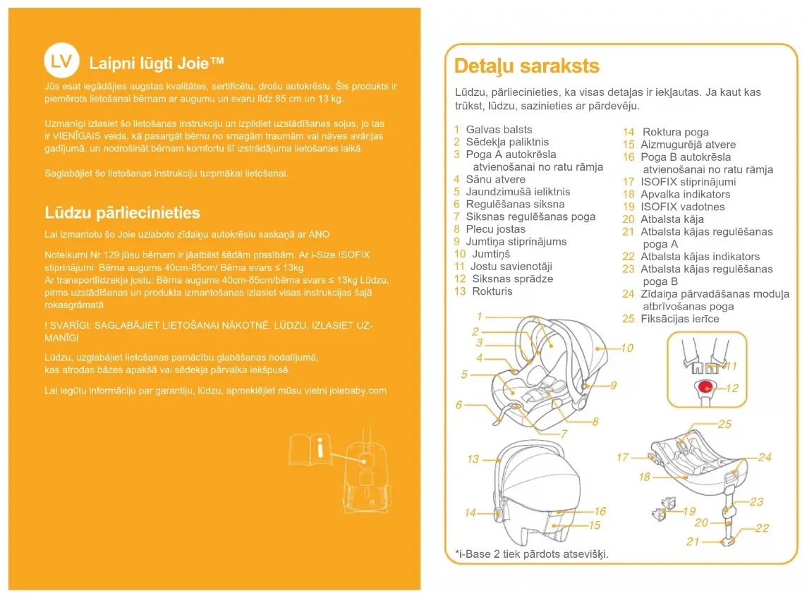 Laipni lūgti Joie™ Jūs esat iegādājies augstas kvalitātes, sertificētu, drošu autokrēslu. Šis produkts ir piemērots lietošanai bērnam ar augumu un svaru līdz 85 cm un 13 kg.Uzmanīgi izlasiet šo lietošanas instrukciju un izpildiet uzstādīšanas soļus, jo tas ir VIENĪGAIS veids, kā pasargāt bērnu no smagām traumām vai nāves avārijas gadījumā, un nodrošināt bērnam komfortu šī izstrādājuma lietošanas laikā.Saglabājiet šo lietošanas instrukciju turpmākai lietošanai. Lūdzu pārliecinieties Lai izmantotu šo Joie uzlaboto zīdaiņu autokrēslu saskaņā ar ANONoteikumi Nr.129 jūsu bērnam ir jāatbilst šādām prasībām. Ar i-Size ISOFIX stiprinājumi: Bērna augums 40cm-85cm/ Bērna svars ≤ 13kg Ar transportlīdzekļa jostu: Bērna augums 40cm-85cm/bērna svars ≤ 13kg Lūdzu, pirms uzstādīšanas un produkta izmantošanas izlasiet visas instrukcijas šajā rokasgrāmatā! SVARĪGI: SAGLABĀJIET LIETOŠANAI NĀKOTNĒ. LŪDZU, IZLASIET UZ-MANĪGILūdzu, uzglabājiet lietošanas pamācību glabāšanas nodalījumā, kas atrodas bāzes apakšā vai sēdekļa pārvalka iekšpusē.Lai iegūtu informāciju par garantiju, lūdzu, apmeklējiet mūsu vietni joiebaby.com Lūdzu, pārliecinieties, ka visas detaļas ir iekļautas. Ja kaut kas trūkst, lūdzu, sazinieties ar pārdevēju.1 Galvas balsts2 Sēdekļa paliktnis3 Poga A autokrēsla atvienošanai no ratu rāmja4 Sānu atvere5 Jaundzimušā ieliktnis6 Regulēšanas siksna7 Siksnas regulēšanas poga8 Plecu jostas9 Jumtiņa stiprinājums10 Jumtiņš11 Jostu savienotāji12 Siksnas sprādze13 Rokturis Detaļu saraksts 14 Roktura poga15 Aizmugurējā atvere16 Poga B autokrēsla atvienošanai no ratu rāmja17 ISOFIX stiprinājumi18 Apvalka indikators19 ISOFIX vadotnes20 Atbalsta kāja21 Atbalsta kājas regulēšanas poga A22 Atbalsta kājas indikators23 Atbalsta kājas regulēšanas poga B24 Zīdaiņa pārvadāšanas moduļa atbrīvošanas poga25 Fiksācijas ierīce*i-Base 2 tiek pārdots atsevišķi.