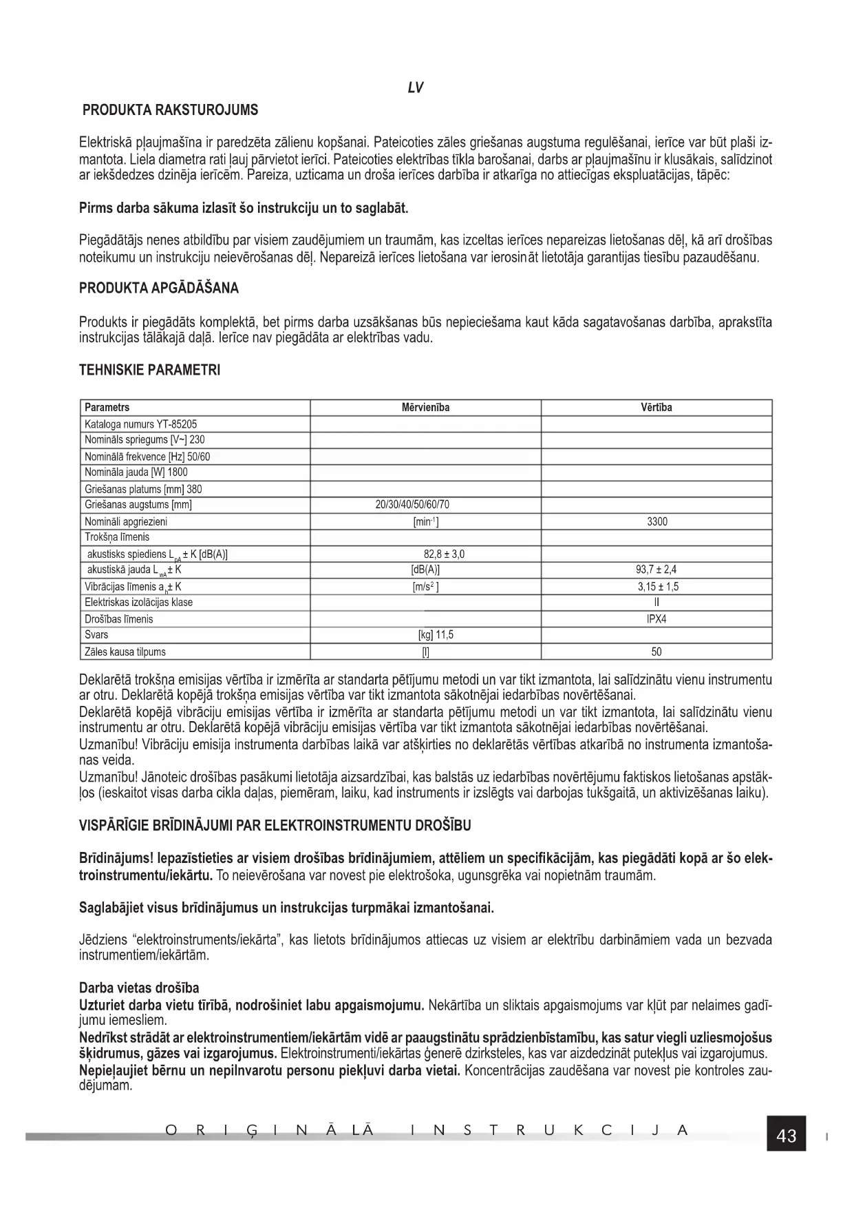 ] 3,15 ± 1,5 Elektriskas izolācijas klase II Drošības līmenis IPX4 Svars [kg] 11,5 Zāles kausa tilpums [l] 50 Deklarētā trokšņa emisijas vērtība ir izmērīta ar standarta pētījumu metodi un var tikt izmantota, lai salīdzinātu vienu instrumentu ar otru. Deklarētā kopējā trokšņa emisijas vērtība var tikt izmantota sākotnējai iedarbības novērtēšanai. Deklarētā kopējā vibrāciju emisijas vērtība ir izmērīta ar standarta pētījumu metodi un var tikt izmantota, lai salīdzinātu vienu instrumentu ar otru. Deklarētā kopējā vibrāciju emisijas vērtība var tikt izmantota sākotnējai iedarbības novērtēšanai. Uzmanību! Vibrāciju emisija instrumenta darbības laikā var atšķirties no deklarētās vērtības atkarībā no instrumenta izmantoša- nas veida. Uzmanību! Jānoteic drošības pasākumi lietotāja aizsardzībai, kas balstās uz iedarbības novērtējumu faktiskos lietošanas apstāk- ļos (ieskaitot visas darba cikla daļas, piemēram, laiku, kad instruments ir izslēgts vai darbojas tukšgaitā, un aktivizēšanas laiku). VISPĀRĪGIE BRĪDINĀJUMI PAR ELEKTROINSTRUMENTU DROŠĪBU Brīdinājums! Iepazīstieties ar visiem drošības brīdinājumiem, attēliem un specifi kācijām, kas piegādāti kopā ar šo elek- troinstrumentu/iekārtu. To neievērošana var novest pie elektrošoka, ugunsgrēka vai nopietnām traumām. Saglabājiet visus brīdinājumus un instrukcijas turpmākai izmantošanai. Jēdziens “elektroinstruments/iekārta”, kas lietots brīdinājumos attiecas uz visiem ar elektrību darbināmiem vada un bezvada instrumentiem/iekārtām. Darba vietas drošība Uzturiet darba vietu tīrībā, nodrošiniet labu apgaismojumu. Nekārtība un sliktais apgaismojums var kļūt par nelaimes gadī- jumu iemesliem. Nedrīkst strādāt ar elektroinstrumentiem/iekārtām vidē ar paaugstinātu sprādzienbīstamību, kas satur viegli uzliesmojošus šķidrumus, gāzes vai izgarojumus. Elektroinstrumenti/iekārtas ģenerē dzirksteles, kas var aizdedzināt putekļus vai izgarojumus. Nepieļaujiet bērnu un nepilnvarotu personu piekļuvi darba vietai. Koncentrācijas zaudēšana var novest pie kontroles zau- dējumam.44