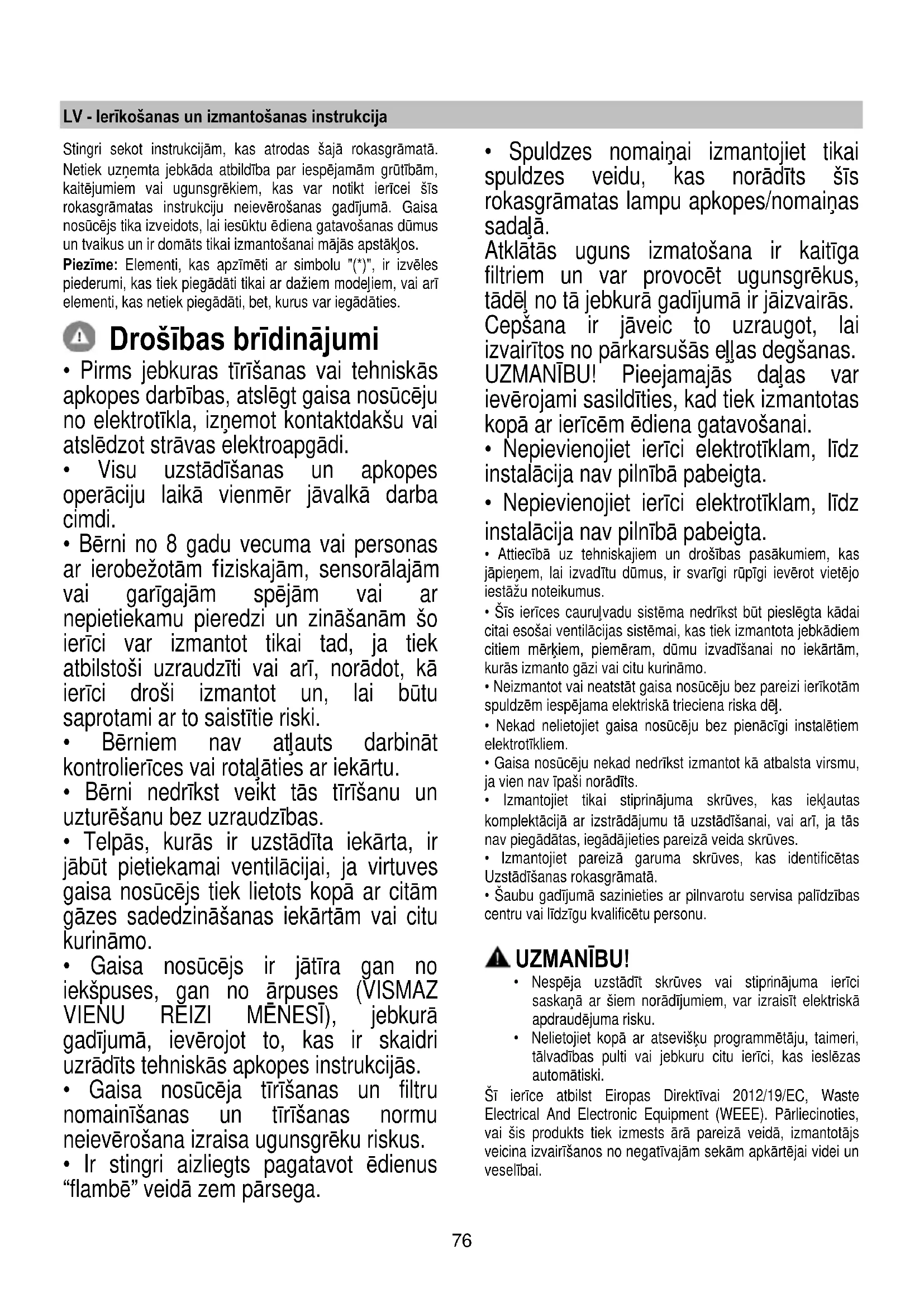 - Spuldzes nomaiņai izmantojiet tikai spuldzes veidu, kas norādīts šīs rokasgrāmatas lampu apkopes/nomaiņas sadaļā. Atklātās uguns izmatošana ir kaitīga filtriem un var provocēt ugunsgrēkus, tādēļ no tā jebkurā gadījumā ir jāizvairās. Cepšana ir jāveic to uzraugot, lai izvairītos no pārkarsušās eļļas degšanas. UZMANĪBU! Pieejamajās daļas var ievērojami sasildīties, kad tiek izmantotas kopā ar ierīcēm ēdiena gatavošanai.