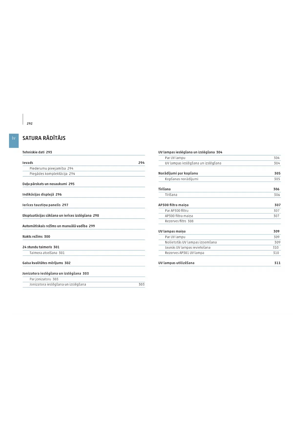 Tehniskie dati 293 Ievads 294 Piederumu pieejamība 294 Piegādes komplektācija 294 Daļu pārskats un nosaukumi 295 Indikācijas displejā 296 Ierīces taustiņu panelis 297 Ekspluatācijas sākšana un ierīces izslēgšana 298 Automātiskais režīms un manuālā vadība 299 Nakts režīms 300 24stundu taimeris 301 Taimera atcelšana 301 Gaisa kvalitātes mērījums 302 Jonizatora ieslēgšana un izslēgšana 303 Par jonizatoru 303 Jonizatora ieslēgšana un izslēgšana 303 UV lampas ieslēgšana un izslēgšana 304 Par UV lampu 304 UV lampas ieslēgšana un izslēgšana 304 Norādījumi par kopšanu 305 Kopšanas norādījumi 305 Tīrīšana 306 Tīrīšana 306 AP300 filtra maiņa 307 Par AP300 filtru 307 AP300 filtra maiņa 307 Rezerves filtrs 308 UV lampas maiņa 309 Par UV lampu 309 Nolietotās UV lampas izņemšana 309 Jaunās UV lampas ievietošana 310 Rezerves AP301 UV lampa 310 UV lampas utilizēšana 311293