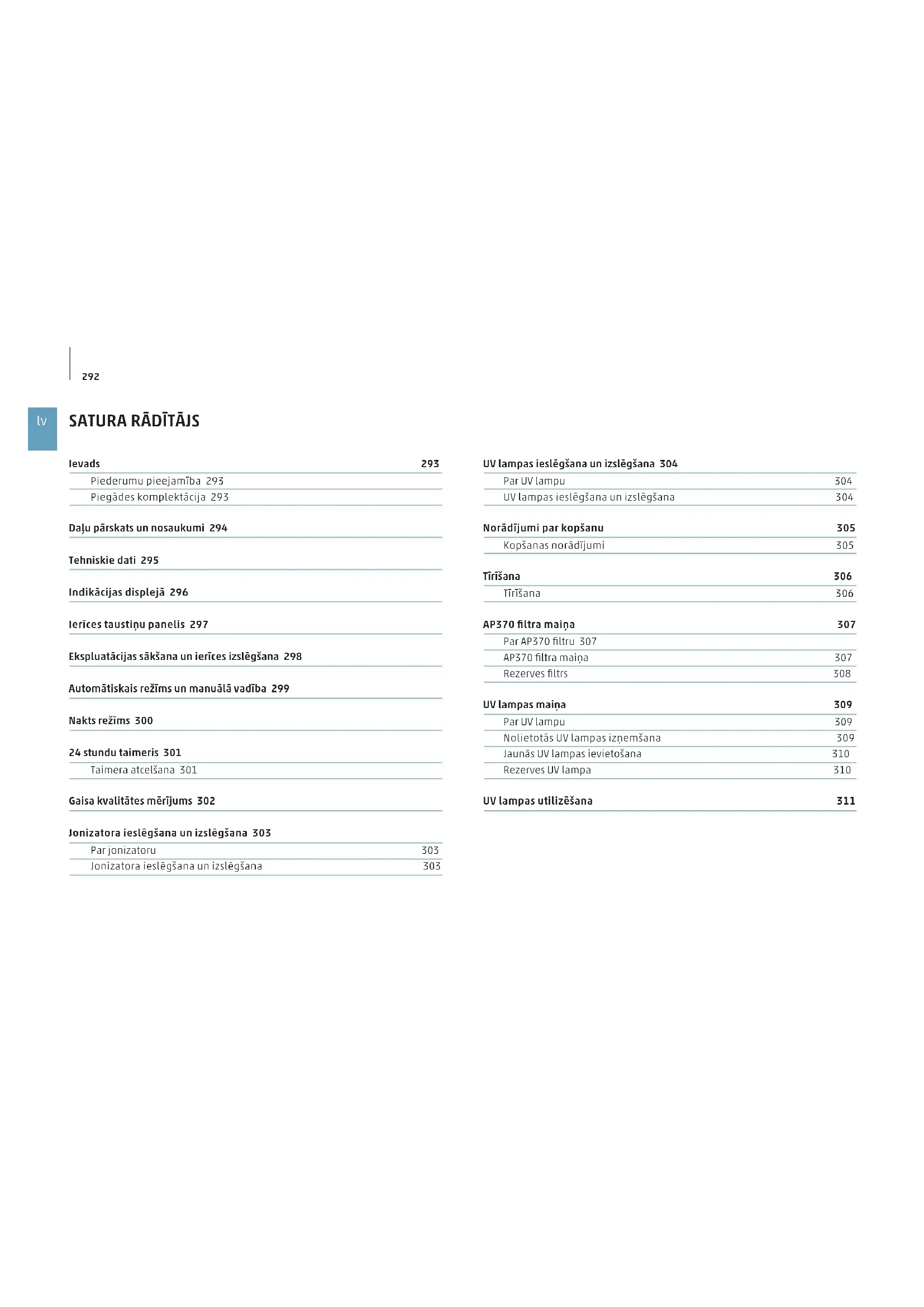 Ievads 293 Piederumu pieejamība 293 Piegādes komplektācija 293 Daļu pārskats un nosaukumi 294 Tehniskie dati 295 Indikācijas displejā 296 Ierīces taustiņu panelis 297 Ekspluatācijas sākšana un ierīces izslēgšana 298 Automātiskais režīms un manuālā vadība 299 Nakts režīms 300 24stundu taimeris 301 Taimera atcelšana 301 Gaisa kvalitātes mērījums 302 Jonizatora ieslēgšana un izslēgšana 303 Par jonizatoru 303 Jonizatora ieslēgšana un izslēgšana 303 UV lampas ieslēgšana un izslēgšana 304 Par UV lampu 304 UV lampas ieslēgšana un izslēgšana 304 Norādījumi par kopšanu 305 Kopšanas norādījumi 305 Tīrīšana 306 Tīrīšana 306 AP370 filtra maiņa 307 Par AP370 filtru 307 AP370 filtra maiņa 307 Rezerves filtrs 308 UV lampas maiņa 309 Par UV lampu 309 Nolietotās UV lampas izņemšana 309 Jaunās UV lampas ievietošana 310 Rezerves UV lampa 310 UV lampas utilizēšana 311293