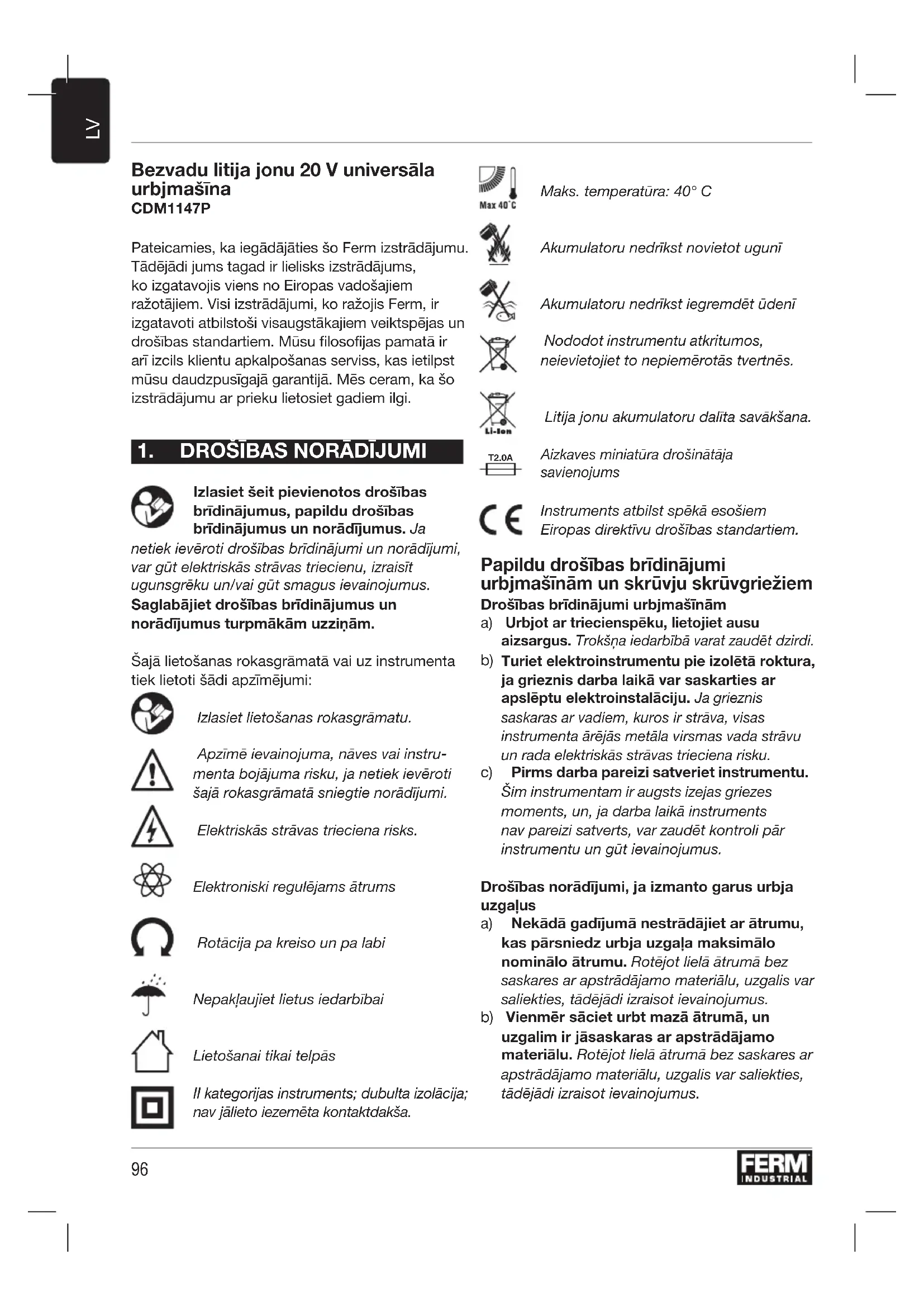 Bezvadulitijajonu20Vuniversāla urbjmašīna CDM1147P Pateicamies, ka iegādājāties šo Ferm izstrādājumu. Tādējādi jums tagad ir lielisks izstrādājums, ko izgatavojis viens no Eiropas vadošajiem ražotājiem. Visi izstrādājumi, ko ražojis Ferm, ir izgatavoti atbilstoši visaugstākajiem veiktspējas un drošības standartiem. Mūsu filosofijas pamatā ir arī izcils klientu apkalpošanas serviss, kas ietilpst mūsu daudzpusīgajā garantijā. Mēs ceram, ka šo izstrādājumu ar prieku lietosiet gadiem ilgi.
