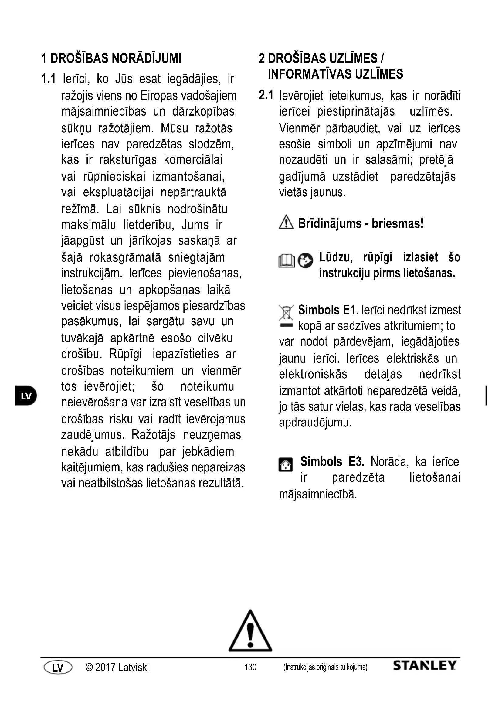 Ievērojiet ieteikumus, kas ir norādīti ierīcei piestiprinātajās uzlīmēs. Vienmēr pārbaudiet, vai uz ierīces esošie simboli un apzīmējumi nav nozaudēti un ir salasāmi; pretējā gadījumā uzstādiet paredzētajās vietās jaunus. Brīdinājums - briesmas! Lūdzu, rūpīgi izlasiet šo instrukciju pirms lietošanas. Simbols E1. Ierīci nedrīkst izmest kopā ar sadzīves atkritumiem; to var nodot pārdevējam, iegādājoties jaunu ierīci. Ierīces elektriskās un elektroniskās detaļas nedrīkst izmantot atkārtoti neparedzētā veidā, jo tās satur vielas, kas rada veselības apdraudējumu. Simbols E3. Norāda, ka ierīce ir paredzēta lietošanai mājsaimniecībā.131 (Instrukcijas oriģināla tulkojums) (Instrukcijas oriģināla tulkojums) © 2017 LatviskiLV