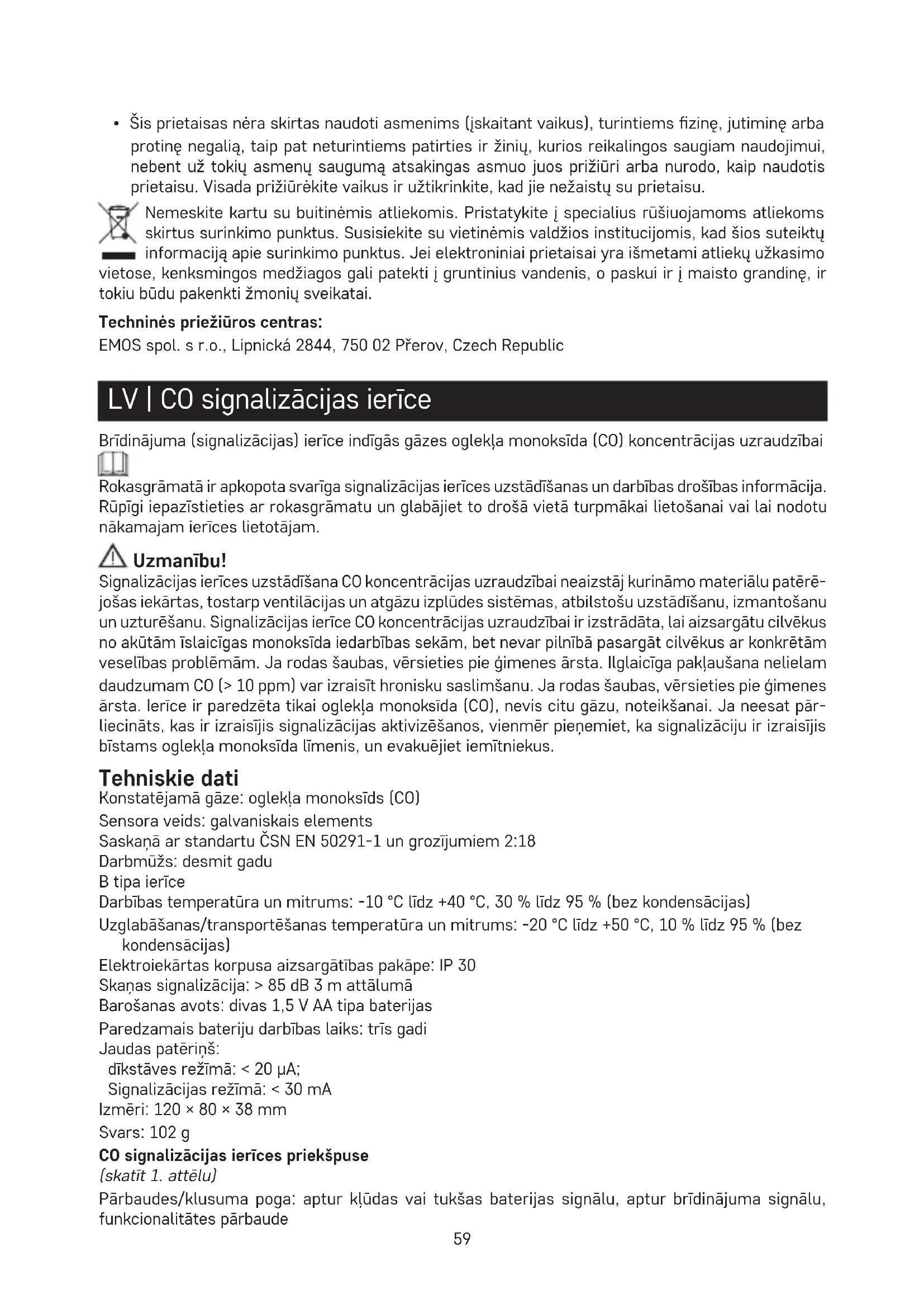 - Šis prietaisas nėra skirtas naudoti asmenims (įskaitant vaikus), turintiems zinę, jutiminę arba protinę negalią, taip pat neturintiems patirties ir žinių, kurios reikalingos saugiam naudojimui, nebent už tokių asmenų saugumą atsakingas asmuo juos prižiūri arba nurodo, kaip naudotis prietaisu. Visada prižiūrėkite vaikus ir užtikrinkite, kad jie nežaistų su prietaisu. Nemeskite kartu su buitinėmis atliekomis. Pristatykite į specialius rūšiuojamoms atliekoms skirtus surinkimo punktus. Susisiekite su vietinėmis valdžios institucijomis, kad šios suteiktų informaciją apie surinkimo punktus. Jei elektroniniai prietaisai yra išmetami atliekų užkasimo vietose, kenksmingos medžiagos gali patekti į gruntinius vandenis, o paskui ir į maisto grandinę, ir tokiu būdu pakenkti žmonių sveikatai. Techninės priežiūros centras: EMOS spol. s r.o., Lipnická 2844, 750 02 Přerov, Czech Republic LV | CO signalizācijas ierīce Brīdinājuma (signalizācijas) ierīce indīgās gāzes oglekļa monoksīda (CO) koncentrācijas uzraudzībai Rokasgrāmatā ir apkopota svarīga signalizācijas ierīces uzstādīšanas un darbības drošības informācija. Rūpīgi iepazīstieties ar rokasgrāmatu un glabājiet to drošā vietā turpmākai lietošanai vai lai nodotu nākamajam ierīces lietotājam. Uzmanību! Signalizācijas ierīces uzstādīšana CO koncentrācijas uzraudzībai neaizstāj kurināmo materiālu patērē- jošas iekārtas, tostarp ventilācijas un atgāzu izplūdes sistēmas, atbilstošu uzstādīšanu, izmantošanu un uzturēšanu. Signalizācijas ierīce CO koncentrācijas uzraudzībai ir izstrādāta, lai aizsargātu cilvēkus no akūtām īslaicīgas monoksīda iedarbības sekām, bet nevar pilnībā pasargāt cilvēkus ar konkrētām veselības problēmām. Ja rodas šaubas, vērsieties pie ģimenes ārsta. Ilglaicīga pakļaušana nelielam daudzumam CO (> 10 ppm) var izraisīt hronisku saslimšanu. Ja rodas šaubas, vērsieties pie ģimenes ārsta. Ierīce ir paredzēta tikai oglekļa monoksīda (CO), nevis citu gāzu, noteikšanai. Ja neesat pār- liecināts, kas ir izraisījis signalizācijas aktivizēšanos, vienmēr pieņemiet, ka signalizāciju ir izraisījis bīstams oglekļa monoksīda līmenis, un evakuējiet iemītniekus. Tehniskie dati Konstatējamā gāze: oglekļa monoksīds (CO) Sensora veids: galvaniskais elements Saskaņā ar standartu ČSN EN 50291-1 un grozījumiem 2:18 Darbmūžs: desmit gadu B tipa ierīce Darbības temperatūra un mitrums: -10 °C līdz +40 °C, 30 % līdz 95 % (bez kondensācijas) Uzglabāšanas/transportēšanas temperatūra un mitrums: -20 °C līdz +50 °C, 10 % līdz 95 % (bez kondensācijas) Elektroiekārtas korpusa aizsargātības pakāpe: IP 30 Skaņas signalizācija: > 85 dB 3 m attālumā Barošanas avots: divas 1,5 V AA tipa baterijas Paredzamais bateriju darbības laiks: trīs gadi Jaudas patēriņš: dīkstāves režīmā: < 20 µA; Signalizācijas režīmā: < 30 mA Izmēri: 120 × 80 × 38 mm Svars: 102 g CO signalizācijas ierīces priekšpuse (skatīt 1. attēlu) Pārbaudes/klusuma poga: aptur kļūdas vai tukšas baterijas signālu, aptur brīdinājuma signālu, funkcionalitātes pārbaude60 Zaļa LED = ieslēgts: indikācija par ieslēgtu stāvokli Dzeltena LED = kļūme: kļūme/indikācija par zemu bateriju enerģijas līmeni Sarkana LED = trauksme: signalizācijas indikācija Kas ir oglekļa monoksīds (CO)? Oglekļa monoksīds (CO) ir neredzama, ļoti indīga gāze bez smaržas. Gāze rodas, nepilnīgi sadegot kurināmajam materiālam, piemēram, kokam, kokoglēm, oglēm, mazutam, parafīnam, degvielai, dabasgāzei, propānam, butānam u. c., kā arī no cigarešu dūmiem. Bīstama CO koncentrācija var rasties, ja ierīce, kas dedzina kurināmo, ir bojāta vai netiek pareizi uzturēta, ja dūmvads ir bloķēts vai ja telpa netiek pietiekami vēdināta. Saindēšanās ar CO nopietnība ir atkarīga no koncentrācijas (daļiņu skaits uz miljonu, ppm) un no tā, cik ilgi cilvēks ir bijis CO ietekmē. Koncentrācija Simptomi 100 ppm Nav simptomu – nav bīstamības. 200 ppm Nelielas galvassāpes. 400 ppm Spēcīgas galvassāpes pēc 1–2 stundām. 800 ppm Spēcīgas galvassāpes pēc 45 minūtēm, slikta dūša, ģībonis un bezsamaņas stāvoklis pēc divām stundām. 1 000 ppm Bīstams koncentrācijas līmenis – bezsamaņas stāvoklis pēc stundas. 1 600 ppm Slikta dūša, spēcīgas galvassāpes un reibonis pēc 20 minūtēm. 3 200 ppm Slikta dūša, spēcīgas galvassāpes un reibonis pēc 5–10 minūtēm, bezsamaņas stāvoklis pēc 30 minūtēm. 6 400 ppm Slikta dūša, spēcīgas galvassāpes un reibonis pēc 1–2 minūtēm, bezsamaņas stāvoklis pēc 10–15 minūtēm. 12 800 ppm Tūlītējs bezsamaņas stāvoklis, iespējama nāve pēc 1–2 minūtēm. Visi, kuri uzturas telpās, ir jāinformē par CO saindēšanās simptomiem! Ierīce, kas uzrauga CO koncentrāciju, aktivizē signalizāciju, ja tiek noteikta konkrēta CO koncentrācija konkrētā periodā. CO koncentrācija, ppm Signalizācijas aktivizācija ≥ 30 120 min. ≥ 50 60–90 min. ≥ 100 10–40 min. ≥ 300 trijās minūtēs Uzstādīšana Uzstādīšanu veic kvalicēts speciālists. Ideālā gadījumā signalizācijas ierīce būtu jāuzstāda katrā telpā ar kurināmo patērējošu iekārtu. Ļoti ieteicams signalizācijas ierīces uzstādīt arī guļamistabās un telpās, kurās pavadāt daudz laika. Ja signalizācijas ierīce ir uzstādīta vienā telpā ar kurināmo patērējošu iekārtu:
