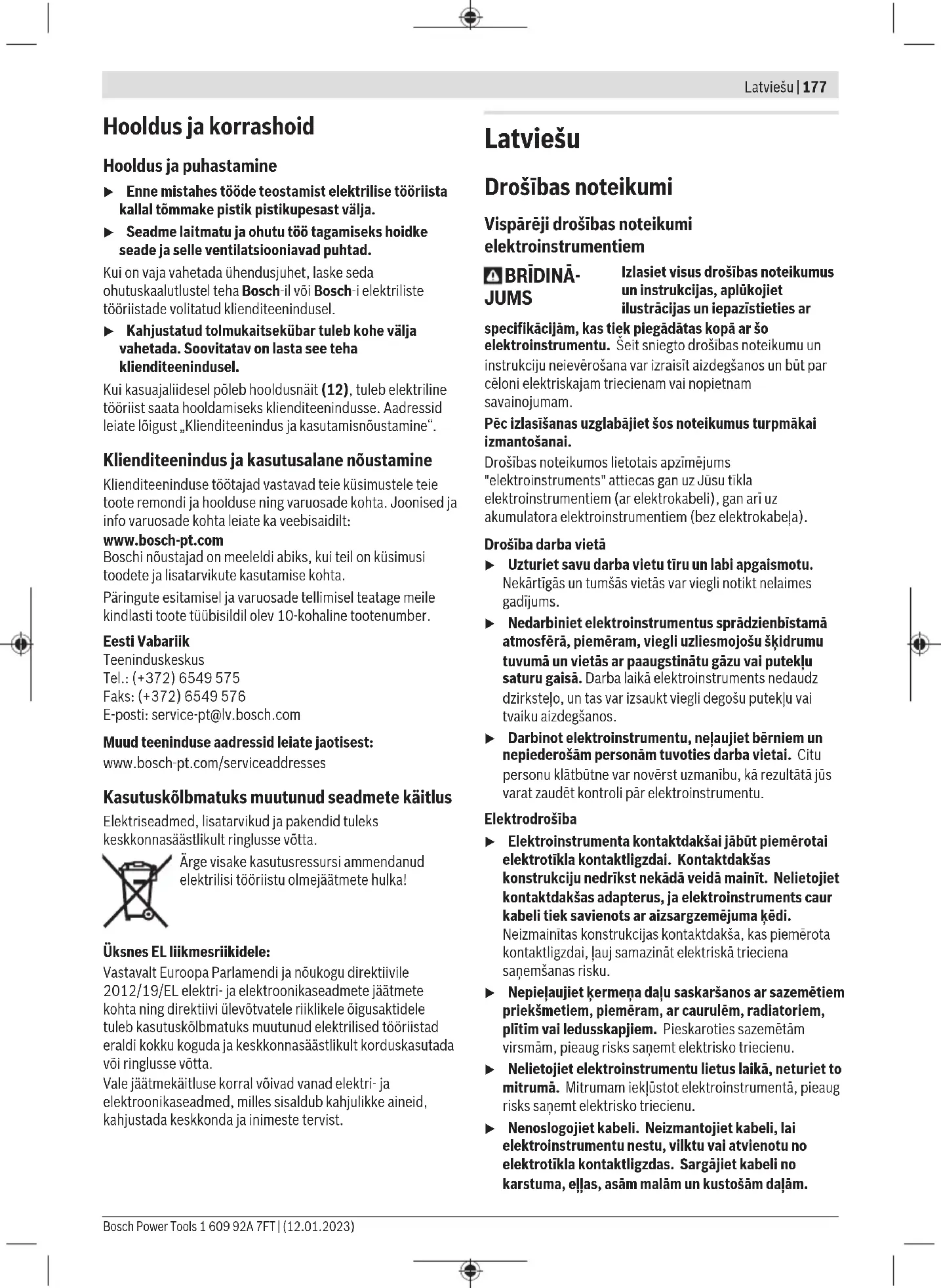 Low Energy ModuleGCY301‑42saab elektrilise tööriista jaoks kasutada järgmisi ühenduvusfunktsioone: – registreerimine ja personaliseerimine – oleku kontroll, hoiatavate ja veateadete väljastamine – üldinfo ja seaded – haldus Täiendav teave on toodud rakenduse abimenüüs. 1 609 92A 7FT | (12.01.2023) Bosch Power ToolsLatviešu | 177 Hooldus ja korrashoid Hooldus ja puhastamine u Enne mistahes tööde teostamist elektrilise tööriista kallal tõmmake pistik pistikupesast välja. u Seadme laitmatu ja ohutu töö tagamiseks hoidke seade ja selle ventilatsiooniavad puhtad. Kui on vaja vahetada ühendusjuhet, laske seda ohutuskaalutlustel teha Bosch-il või Bosch-i elektriliste tööriistade volitatud klienditeenindusel. u Kahjustatud tolmukaitsekübar tuleb kohe välja vahetada. Soovitatav on lasta see teha klienditeenindusel. Kui kasuajaliidesel põleb hooldusnäit(12), tuleb elektriline tööriist saata hooldamiseks klienditeenindusse. Aadressid leiate lõigust „Klienditeenindus ja kasutamisnõustamine“. Klienditeenindus ja kasutusalane nõustamine Klienditeeninduse töötajad vastavad teie küsimustele teie toote remondi ja hoolduse ning varuosade kohta. Joonised ja info varuosade kohta leiate ka veebisaidilt: www.bosch-pt.com Boschi nõustajad on meeleldi abiks, kui teil on küsimusi toodete ja lisatarvikute kasutamise kohta. Päringute esitamisel ja varuosade tellimisel teatage meile kindlasti toote tüübisildil olev 10‑kohaline tootenumber. Eesti Vabariik Teeninduskeskus Tel.: (+372) 6549 575 Faks: (+372) 6549 576 E-posti: service-pt@lv.bosch.com Muud teeninduse aadressid leiate jaotisest: www.bosch-pt.com/serviceaddresses Kasutuskõlbmatuks muutunud seadmete käitlus Elektriseadmed, lisatarvikud ja pakendid tuleks keskkonnasäästlikult ringlusse võtta. Ärge visake kasutusressursi ammendanud elektrilisi tööriistu olmejäätmete hulka! Üksnes ELliikmesriikidele: Vastavalt Euroopa Parlamendi ja nõukogu direktiivile 2012/19/EL elektri- ja elektroonikaseadmete jäätmete kohta ning direktiivi ülevõtvatele riiklikele õigusaktidele tuleb kasutuskõlbmatuks muutunud elektrilised tööriistad eraldi kokku koguda ja keskkonnasäästlikult korduskasutada või ringlusse võtta. Vale jäätmekäitluse korral võivad vanad elektri- ja elektroonikaseadmed, milles sisaldub kahjulikke aineid, kahjustada keskkonda ja inimeste tervist. Latviešu Drošības noteikumi Vispārēji drošības noteikumi elektroinstrumentiem BRĪDINĀ- JUMS Izlasiet visus drošības noteikumus un instrukcijas, aplūkojiet ilustrācijas un iepazīstieties ar specifikācijām, kas tiek piegādātas kopā ar šo elektroinstrumentu. Šeit sniegto drošības noteikumu un instrukciju neievērošana var izraisīt aizdegšanos un būt par cēloni elektriskajam triecienam vai nopietnam savainojumam. Pēc izlasīšanas uzglabājiet šos noteikumus turpmākai izmantošanai. Drošības noteikumos lietotais apzīmējums "elektroinstruments" attiecas gan uz Jūsu tīkla elektroinstrumentiem (ar elektrokabeli), gan arī uz akumulatora elektroinstrumentiem (bez elektrokabeļa). Drošība darba vietā u Uzturiet savu darba vietu tīru un labi apgaismotu. Nekārtīgās un tumšās vietās var viegli notikt nelaimes gadījums. u Nedarbiniet elektroinstrumentus sprādzienbīstamā atmosfērā, piemēram, viegli uzliesmojošu šķidrumu tuvumā un vietās ar paaugstinātu gāzu vai putekļu saturu gaisā. Darba laikā elektroinstruments nedaudz dzirksteļo, un tas var izsaukt viegli degošu putekļu vai tvaiku aizdegšanos. u Darbinot elektroinstrumentu, neļaujiet bērniem un nepiederošām personām tuvoties darba vietai. Citu personu klātbūtne var novērst uzmanību, kā rezultātā jūs varat zaudēt kontroli pār elektroinstrumentu. Elektrodrošība u Elektroinstrumenta kontaktdakšai jābūt piemērotai elektrotīkla kontaktligzdai. Kontaktdakšas konstrukciju nedrīkst nekādā veidā mainīt. Nelietojiet kontaktdakšas adapterus, ja elektroinstruments caur kabeli tiek savienots ar aizsargzemējuma ķēdi. Neizmainītas konstrukcijas kontaktdakša, kas piemērota kontaktligzdai, ļauj samazināt elektriskā trieciena saņemšanas risku. u Nepieļaujiet ķermeņa daļu saskaršanos ar sazemētiem priekšmetiem, piemēram, ar caurulēm, radiatoriem, plītīm vai ledusskapjiem. Pieskaroties sazemētām virsmām, pieaug risks saņemt elektrisko triecienu. u Nelietojiet elektroinstrumentu lietus laikā, neturiet to mitrumā. Mitrumam iekļūstot elektroinstrumentā, pieaug risks saņemt elektrisko triecienu. u Nenoslogojiet kabeli. Neizmantojiet kabeli, lai elektroinstrumentu nestu, vilktu vai atvienotu no elektrotīkla kontaktligzdas. Sargājiet kabeli no karstuma, eļļas, asām malām un kustošām daļām. Bosch Power Tools 1 609 92A 7FT | (12.01.2023)178 | Latviešu Bojāts vai samezglojies elektrokabelis var būt par cēloni elektriskā trieciena saņemšanai. u Darbinot elektroinstrumentu ārpus telpām, izmantojiet tā pievienošanai vienīgi ārpustelpu lietošanai derīgus pagarinātājkabeļus. Lietojot elektrokabeli, kas piemērots darbam ārpus telpām, samazinās elektriskā trieciena saņemšanas risks. u Ja elektroinstrumentu tomēr nepieciešams darbināt vietās ar paaugstinātu mitrumu, pievienojiet to elektrobarošanas ķēdēm, kas aizsargātas ar noplūdes strāvas aizsargreleju (RCD). Lietojot noplūdes strāvas aizsargreleju, samazinās risks saņemt elektrisko triecienu. Personiskā drošība u Strādājot ar elektroinstrumentu, saglabājiet paškontroli un rīkojieties saskaņā ar veselo saprātu. Pārtrauciet darbu, ja jūtaties noguris vai arī atrodaties narkotiku, alkohola vai medikamentu iespaidā. Strādājot ar elektroinstrumentu, pat viens neuzmanības mirklis var būt par cēloni nopietnam savainojumam. u Lietojiet individuālo darba aizsargaprīkojumu. Darba laikā vienmēr nēsājiet aizsargbrilles. Individuālā darba aizsargaprīkojuma (putekļu maskas, neslīdošu apav