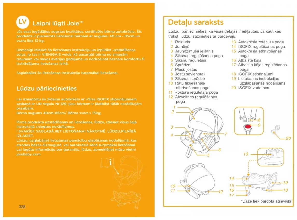 Laipni lūgti Joie™ Jūs esat iegādājies augstas kvalitātes﹐ sertificētu bērnu autokrēslu. Šis produkts ir piemērots lietošanai bērnam ar augumu 40 cm - 85cm un svaru līdz 13 kg.Uzmanīgi izlasiet šo lietošanas instrukciju un izpildiet uzstādīšanas soļus﹐ jo tas ir VIENĪGAIS veids﹐ kā pasargāt bērnu no smagām traumām vai nāves avārijas gadījumā un nodrošināt bērnam komfortu šī izstrādājuma lietošanas laikā.Saglabājiet šo lietošanas instrukciju turpmākai lietošanai. Lūdzu pārliecinieties Lai izmantotu šo zīdaiņu autokrēslu ar i-Size ISOFIX stiprinājumiem saskaņā ar UN regulu Nr.129﹐ jūsu bērnam ir jāatbilst tālāk norādītajām prasībām.Bērna augums 40cm-85cm/ Bērna svars 13kg;Pirms produkta uzstādīšanas un lietošanas﹐ lūdzu﹐ izlasiet visus šajā instrukcijā sniegtos norādījumus.! SVARĪGI: SAGLABĀJIET LIETOŠANAI NĀKOTNĒ. LŪDZU﹐PILNĪBĀ IZLASIET.Lūdzu﹐ uzglabājiet lietošanas pamācību glabāšanas nodalījumā﹐ kas atrodas bāzes aizmugurē﹐ vai autokrēsla sānā turpmākai lietošanai.Lai iegūtu informāciju par garantiju﹐ lūdzu﹐ apmeklējiet mūsu vietni joiebaby.com Lūdzu, pārliecinieties, ka visas detaļas ir iekļautas. Ja kaut kas trūkst, lūdzu, sazinieties ar pārdevēju. 1 Rokturis 2 Jumtiņš 3 Jaundzimušā ieliktnis 4 Siksnas regulēšanas poga 5 Siksnu regulētājs 6 Sprādze 7 Plecu jostas 8 Jostu savienotāji 9 Siksnas sprādze 10 Ratu fiksēšanas/ atbrīvošanas poga 11 Roktura regulētāja poga 12 Atzveltnes regulēšanas poga Detaļu saraksts 13 Autokrēsla rotācijas poga 14 ISOFIX regulēšanas poga 15 Autokrēsla atbrīvošanas poga 16 Atbalsta kāja 17 Atbalsta kājas regulēšanas poga 18 ISOFIX stiprinājumi 19 Lietošanas instrukcijas uzglabāšanas nodalījums 20 ISOFIX vadotnes *Bāze tiek pārdota atsevišķi