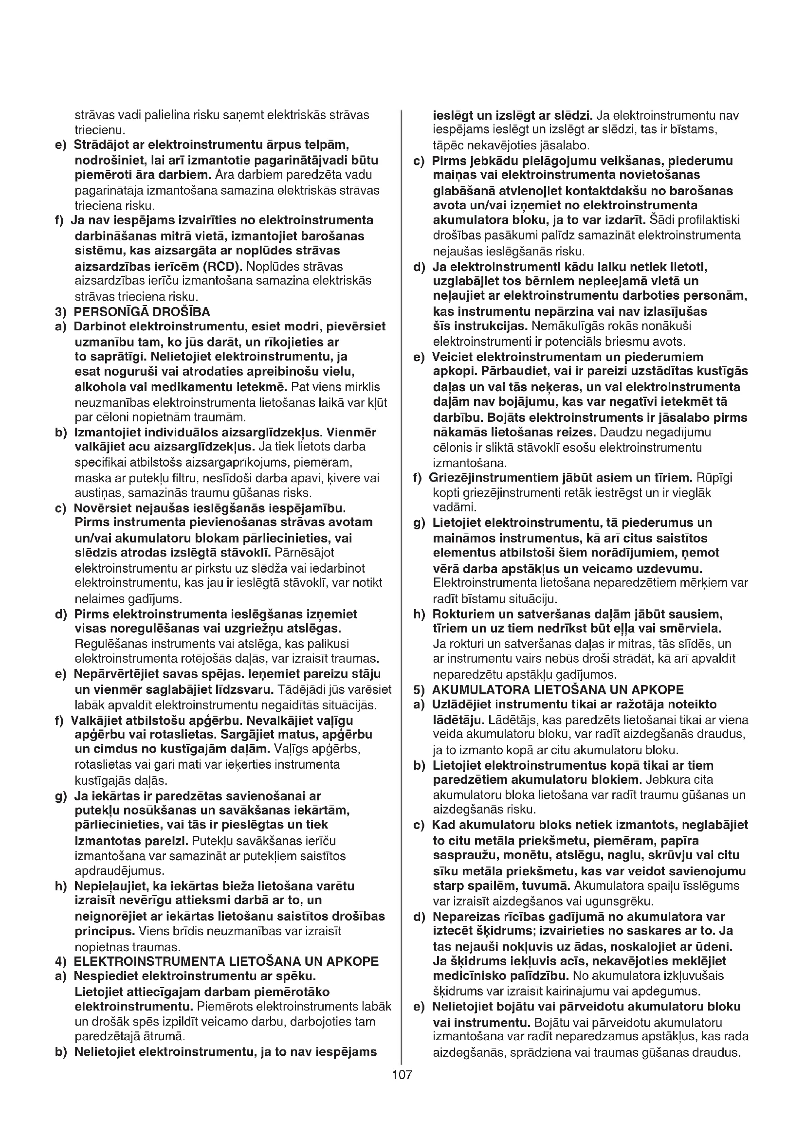 a) Darbinotelektroinstrumentu,esietmodri,pievērsiet uzmanībutam,kojūsdarāt,unrīkojietiesar tosaprātīgi.Nelietojietelektroinstrumentu,ja esat noguruši vai atrodaties apreibinošu vielu, alkoholavaimedikamentuietekmē.Pat viens mirklis neuzmanības elektroinstrumenta lietošanas laikā var kļūt par cēloni nopietnām traumām. b) Izmantojietindividuālosaizsarglīdzekļus.Vienmēr valkājietacuaizsarglīdzekļus.Ja tiek lietots darba specikai atbilstošs aizsargaprīkojums, piemēram, maska ar putekļu ltru, neslīdoši darba apavi, ķivere vai austiņas, samazinās traumu gūšanas risks. c) Novērsietnejaušasieslēgšanāsiespējamību. Pirmsinstrumentapievienošanasstrāvasavotam un/vaiakumulatorublokampārliecinieties,vai slēdzisatrodasizslēgtāstāvoklī.Pārnēsājot elektroinstrumentu ar pirkstu uz slēdža vai iedarbinot elektroinstrumentu, kas jau ir ieslēgtā stāvoklī, var notikt nelaimes gadījums. d) Pirmselektroinstrumentaieslēgšanasizņemiet visasnoregulēšanasvaiuzgriežņuatslēgas. Regulēšanas instruments vai atslēga, kas palikusi elektroinstrumenta rotējošās daļās, var izraisīt traumas. e) Nepārvērtējietsavasspējas.Ieņemietpareizustāju unvienmērsaglabājietlīdzsvaru.Tādējādi jūs varēsiet labāk apvaldīt elektroinstrumentu negaidītās situācijās. f) Valkājietatbilstošuapģērbu.Nevalkājietvaļīgu apģērbuvairotaslietas.Sargājietmatus,apģērbu uncimdusnokustīgajāmdaļām.Vaļīgs apģērbs, rotaslietas vai gari mati var ieķerties instrumenta kustīgajās daļās. g) Jaiekārtasirparedzētassavienošanaiar putekļunosūkšanasunsavākšanasiekārtām, pārliecinieties,vaitāsirpieslēgtasuntiek izmantotas pareizi. Putekļu savākšanas ierīču izmantošana var samazināt ar putekļiem saistītos apdraudējumus. h) Nepieļaujiet,kaiekārtasbiežalietošanavarētu izraisītnevērīguattieksmidarbāarto,un neignorējietariekārtaslietošanusaistītosdrošības principus. Viens brīdis neuzmanības var izraisīt nopietnas traumas.