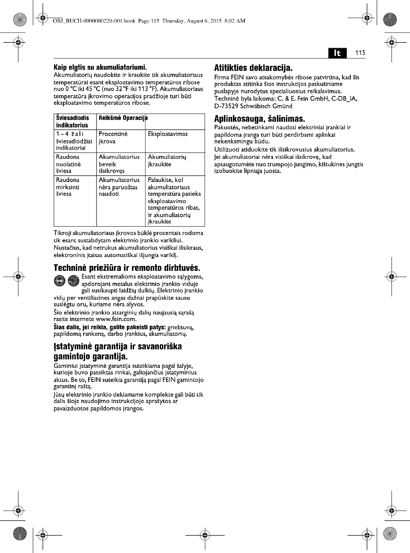 Apiešanās ar akumulatoru. Lietojiet un uzlādējiet akumulatoru tikai tad, ja tā temperatūra atrodas darba temperatūras diapazona robežās, kas ir 0 °C – 45 °C (32 °F – 113 °F). Akumulatora temperatūrai jātrodas darba temperatūras diapazona robežās jau uzlādes procesa sākumā. Akumulatora uzlādes pakāpes patiesā procentuālā vērtība tiek parādīta tikai pie izslēgta elektroinstrumenta dzinēja. Akumulatora dziļās uzlādes gadījumā elektroniskais mezgls automātiski izslēdz elektroinstrumenta dzinēju. Uzturēšana darba kārtībā un klientu apkalpošanas dienests. Ekstremālos darba apstākļos, izmantojot elektroinstrumentu metāla apstrādei, tā korpusa iekšpusē var uzkrāties strāvu vadoši putekļi. Pietiekoši bieži caur ventilācijas atverēm izpūtiet elektroinstrumenta iekšpusi ar sausu, saspiestu gaisu, kas nesatur eļļu. Šā elektroinstrumenta aktuālais rezerves daļu saraksts ir atrodams interneta vietnē www.fein.com. Vajadzības gadījumā lietotājs var saviem spēkiem nomainīt šādas daļas: urbjpatronu, papildrokturi, darbinstrumentu un akumulatoru Garantija. Garantija izstrādājumam tiek noteikta atbilstoši spēkā esošajai tās valsts likumdošanai, kurā izstrādājums ir ticis laists pārdošanā. Bez tam firma FEIN nosaka izstrādājumam garantiju atbilstoši FEIN garantijas deklarācijai. Elektroinstrumenta piegādes komplektā var netikt iekļautas visas šajā lietošanas pamācībā aprakstītās un attēlotās daļas. Atbilstības deklarācija. Firma FEIN ar pilnu atbildību deklarē, ka šis izstrādājums atbilst šīs lietošanas pamācības pēdējā lappusē minētajām spēkā esošajām direktīvām. Tehniskā dokumentācija no: C. & E. Fein GmbH, C-DB_IA, D-73529 Schwäbisch Gmünd Vides aizsardzība, atbrīvošanās no nolietotajiem izstrādājumiem. Nolietotie elektroinstrumenti, to iesaiņojums un piederumi jānogādā otrreizējai pārstrādei apkārtējai videi nekaitīgā veidā. Akumulatori jānogādā otrreizējai pārstrādei tikai izlādētā stāvoklī. Ja akumulatori nav pilnīgi izlādēti, tie jāpasargā no iespējama īsslēguma, pārlīmējot pāri kontaktiem līmlenti. Mirdzdiodes indikators Nozīme Darbība 1–4 zaļās mirdzdiodes Norāda procentuālo uzlādes pakāpi Cēlonis Sarkanā