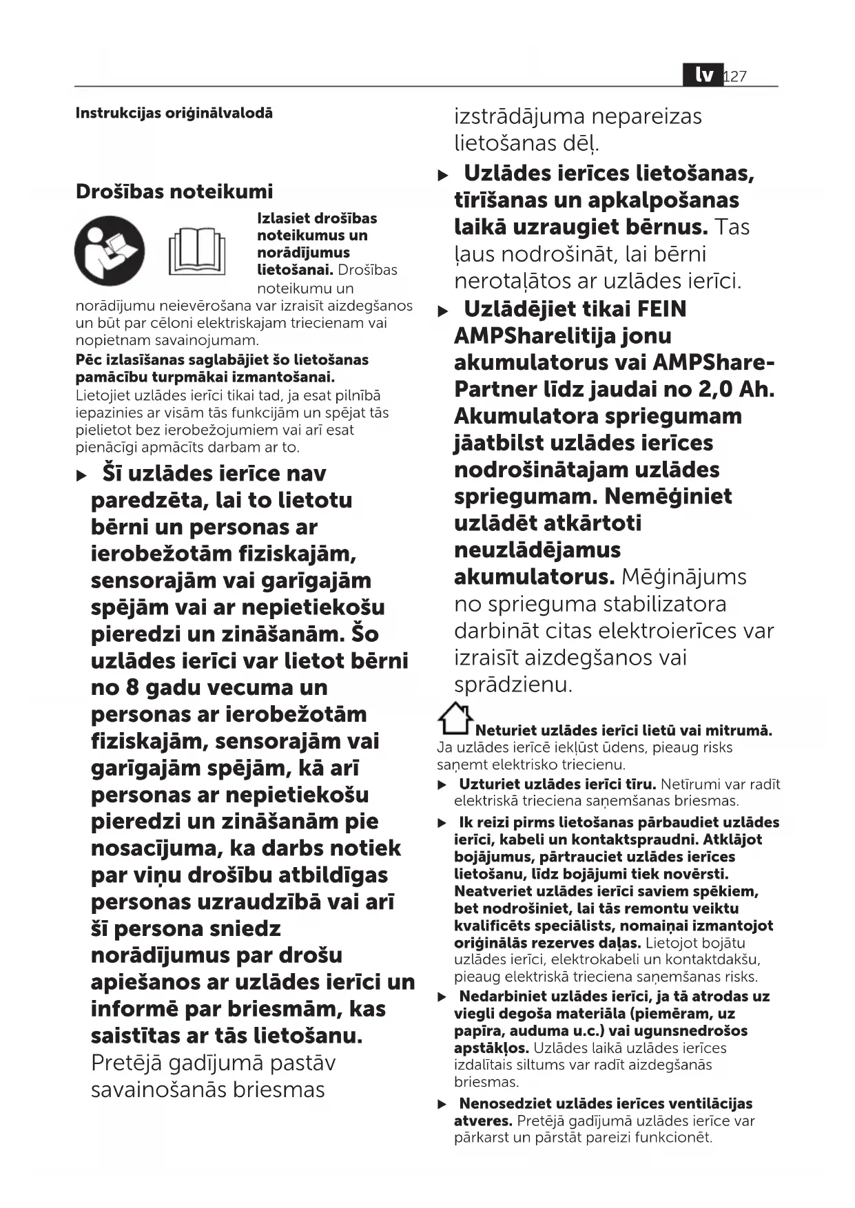 – 4,0Ah min. 16/25 – 5,0Ah min. 20/35 Akumulatora elementu skaits 5–15 Svars atbilstīgi EPTA-Procedure 01:2014 kg 0,95 128 lv 34101366060 • 1.6.22Uzlādes ierīce GAL 18V-160 Aizsardzības klase / II A) Atbilstoši akumulatora temperatūrai un akumulatora tipam B) Akumulatora uzlādes pakāpe 50% (pēc uzlādes ar funkciju Power Boost). Akumulatoru var izņemt un nekavējoties uzsākt tā lietošanu. C) Akumulatora uzlādes pakāpe apt. 80% (pēc uzlādes ar funkciju Power Boost). Akumulatoru var izņemt un nekavējoties uzsākt tā lietošanu. D) Akumulatora uzlādes pakāpe apt. 80% (pēc uzlādes standarta režīmā). Akumulatoru var izņemt un nekavējoties uzsākt tā lietošanu. E) Akumulatora uzlādes pakāpe 97% – 100% (pēc uzlādes standarta režīmā). LietošanaLatviešu MontāžaLatviešu u Veicot jebkādus darbus ar uzlādes ierīci, izvelciet tās kontaktdakšu no elektrotīkla kontaktligzdas. Montāža pie sienasLatviešu Uzlādes ierīci var lietot vai nu vertikāli (galda režīms/desktop use), vai arī piestiprinātu pie sienas. Lai piestiprinātu pie sienas: izveidojiet divus urbumus tādā attālumā, kā parādīts attēlā. Lai piestiprinātu, izmantojiet tikai apaļgalvas skrūves ar diametru no 5mm līdz maks. 6,5mm. Lietošanas sākšanaLatviešu u Nodrošiniet pareiza elektrotīkla sprieguma padevi! Elektrobarošanas avota spriegumam jāatbilst vērtībai, kas ir norādīta uz uzlādes ierīces marķējuma plāksnītes. Uzlādes ierīces, ko paredzēts darbināt ar 230V spriegumu, var darboties arī ar 220V spriegumu. Uzlādes processLatviešu Uzlādes process sākas, tiklīdz uzlādes ierīces kontaktdakša ir iesprausta kontaktligzdā un akumulators ir ielikts uzlādes nišā (1). Viedajā uzlādes procesā automātiski tiek noteikts akumulatora uzlādes stāvoklis un tiek nodrošināta optimāla uzlādes strāva atbilstīgi akumulatora temperatūrai un akumulatora spriegumam. Tā tiek nodrošināta saudzīga akumulatora uzlāde; ja akumulatoru atstāj uzlādes ierīcē, tas tiek pastāvīgi uzturēts pilnībā uzlādētā stāvoklī. Indikācijas elementu nozīmeLatviešu Zaļais akumulatora uzlādes pakāpes indikators (3)Latviešu 5 zaļas LED diodes rāda akumulatora uzlādes pakāpi uzlādes laikā un arī pēc tās. Katra pastāvīgi degoša LED diode aptuveni atbilst akumulatora uzlādes pakāpei 20 %. LED diodes Akumulatora uzlādes pakāpe, apt. Secīgi iedegas 5 LED siodes. < 20% Pastāvīgi deg apakšējā LED diode. 20% Pastāvīgi deg 2 apakšējās LED diodes. 40% Pastāvīgi deg 3 apakšējās LED diodes. 60% Pastāvīgi deg 4 apakšējās LED diodes. 80% Pastāvīgi deg 5 LED diodes. > 95% Norāde: uzlādi var veikt tikai tad, ja akumulatora temperatūra ir pieļaujamajā uzlādes temperatūras diapazonā, kā norādīts sadaļā „Tehniskie dati”. Sarkanais temperatūras kontroles / kļūmes indikators (5)Latviešu Deg pastāvīgiLatviešu Pastāvīgi degošs sarkanais indikators signalizē, ka akumulatora temperatūra atrodas ārpus pieļaujamo uzlādes temperatūras vērtību diapazona robežām; skatīt sadaļu „Tehniskie dati“. Uzlādes process sākas, tiklīdz temperatūra atgriežas lv 129 34101366060 • 1.6.22pieļaujamo uzlādes temperatūras vērtību diapazonā. MirgoLatviešu Mirgojošs sarkanais indikators signalizē, ka uzlādes ierīce ir bojāta. Funkcijas Power Boost taustiņš(4)Latviešu Nospiežot funkcijas Power Boost taustiņu(4), aktivizējas ātrās uzlādes režīms. Tas ir iespējams pirms vai pēc akumulatora pievienošanas uzlādes ierīcei. Ātrās uzlādes laikā funkcijas Power Boost taustiņš(4) iedegas sarkanā krāsā. Vēlreiz nospiežot funkcijas Power Boost taustiņu, uzlādes ierīce atgriežas standarta uzlādes režīmā. Pēc ātrās uzlādes beigām (uzlādes pakāpei sasniedzot apt. 50%) taustiņš Power Boost(4)izdziest. Ja akumulators paliek uzlādes ierīcē, tā uzlādes process turpinās. Tonālais signālsLatviešu Līdzko uzlādes cikls ir pabeigts, atskan īss skaņas signāls. Kļūmes – cēloņi un novēršanaLatviešu Iemesls Novēršana Sarkanais temperatūras kontroles / kļūmes indikators(5) mirgo Uzlādes process nevar notikt Akumulators nav (pareizi) ievietots uzlādes ierīcē Pareizi ievietojiet akumulatoru uzlādes ierīcē Akumulatora kontakti ir netīri Notīriet akumulatora kontaktus, piemēram, vairākas reizes ieliekot un izņemot akumulatoru; ja vajadzīgs, nomainiet akumulatoru Akumulators ir bojāts Nomainiet akumulatoru Uzlādes ierīce ir bojāta Pārbaudiet uzlādes ierīci pilnvarotāFEINelektroi nstrumentu remonta darbnīcā Zaļais akumulatora uzlādes pakāpes indikators(3) nedeg Uzlādes ierīces kontaktdakša nav (pareizi) iesprausta elektrotīkla kontaktligzdā Iespraudiet uzlādes ierīces kontaktdakšu elektrotīkla kontaktligzdā (pilnībā) Ir bojāta elektrotīkla kontaktligzda, elektrokabelis vai uzlādes ierīce Pārbaudiet elektrotīkla spriegumu; ja vajadzīgs, lūdziet uzlādes ierīci pārbaudīt Iemesls Novēršana pilnvarotāFEINelektroi nstrumentu remonta darbnīcā Norādījumi par darbuLatviešu Ja instrumenta darbības laiks starp akumulatora uzlādēm manāmi saīsinās, tas nozīmē, ka akumulators ir nolietojies un ir jānomaina. Ja uzlāde ir nepārtraukta, piemēram, secīgi veic vairākus uzlādes ciklus, uzlādes ierīce var sakarst. Taču tas nav bīstami un nenozīmē, ka uzlādes ierīcei ir tehnisks defekts. Akumulatora dzesēšana (Active Air Cooling)Latviešu Uzlādes ierīcē iebūvētais ventilatora vadības mezgls kontrolē ievietotā akumulatora temperatūru. Līdzko akumulatora temperatūra pieaug virs aptuveni 0 °C, akumulators tiek dzesēts ar ventilatora palīdzību. Ieslēgtais ventilators rada raksturīgu gaisa plūsmas troksni. Ventilators nedarbojas, ja tas ir bojāts, kā arī, ja akumulatora temperatūra ir <0 °C. Šādā gadījumā uzlādes laiks var palielināties. Uzlādes gaitaLatviešu Ātrā